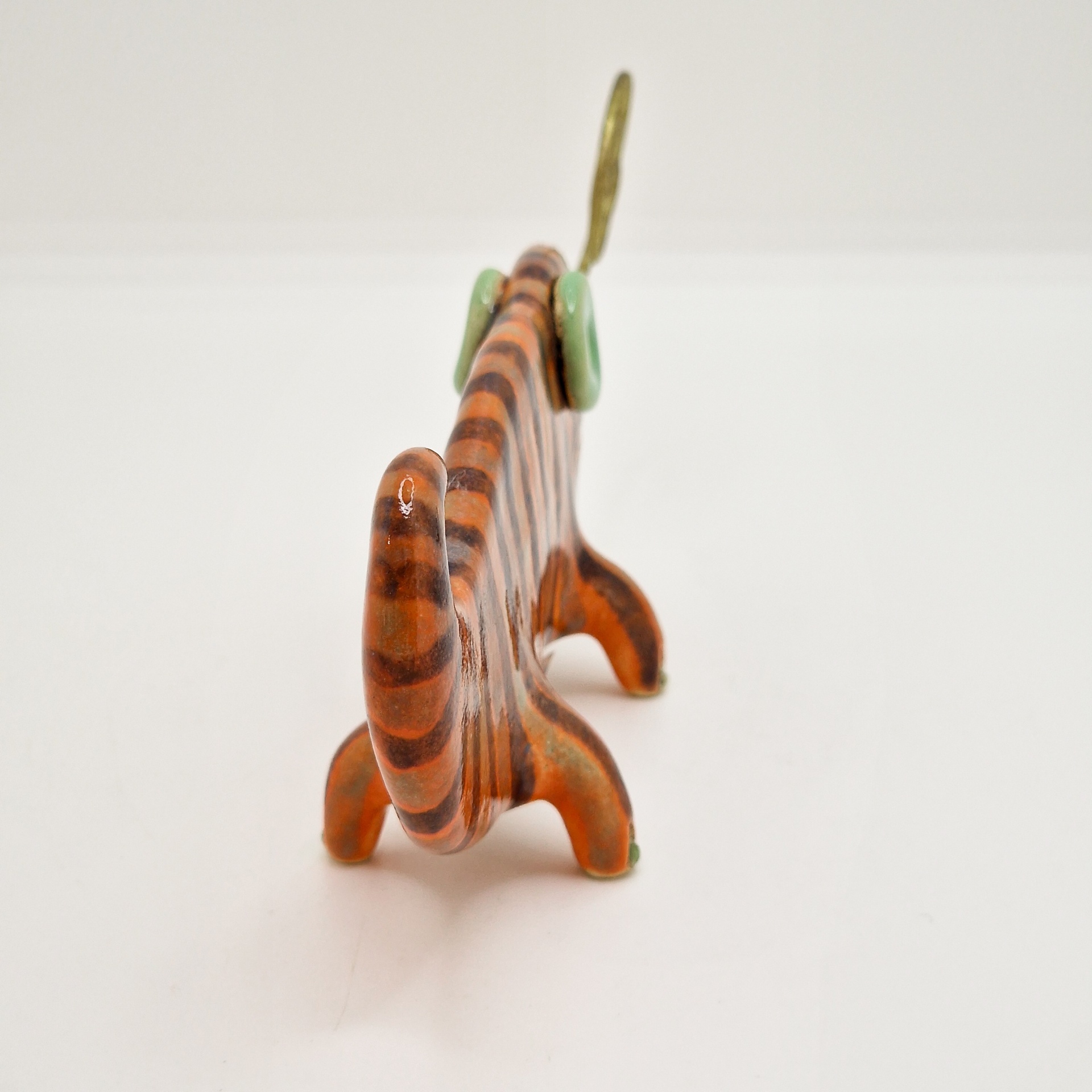 • Estatueta de cerâmica com padrão de listras castanhas e pretas e olhos verdes
