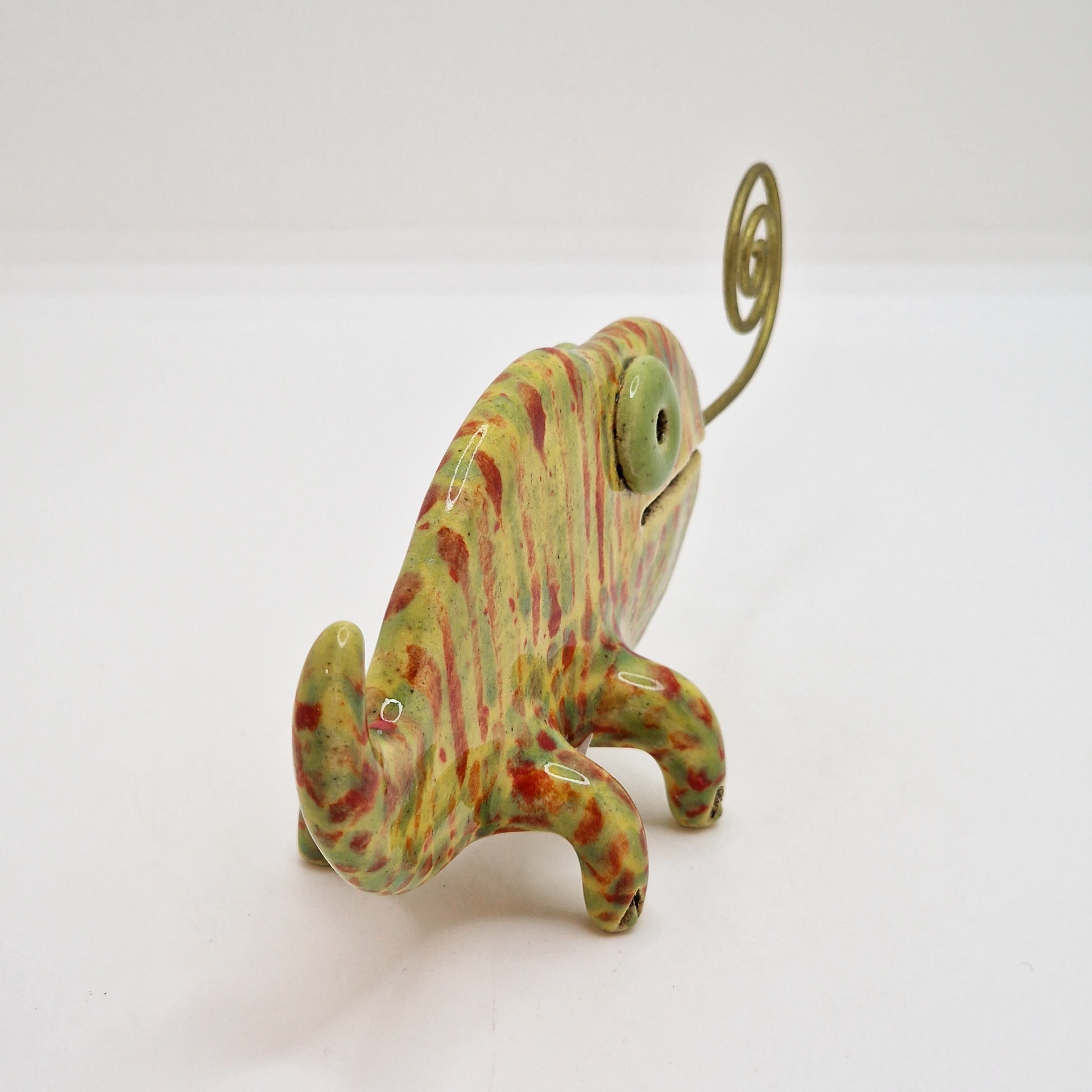 • Escultura decorativa de cerâmica em forma de camaleão verde com manchas vermelhas e suporte de metal