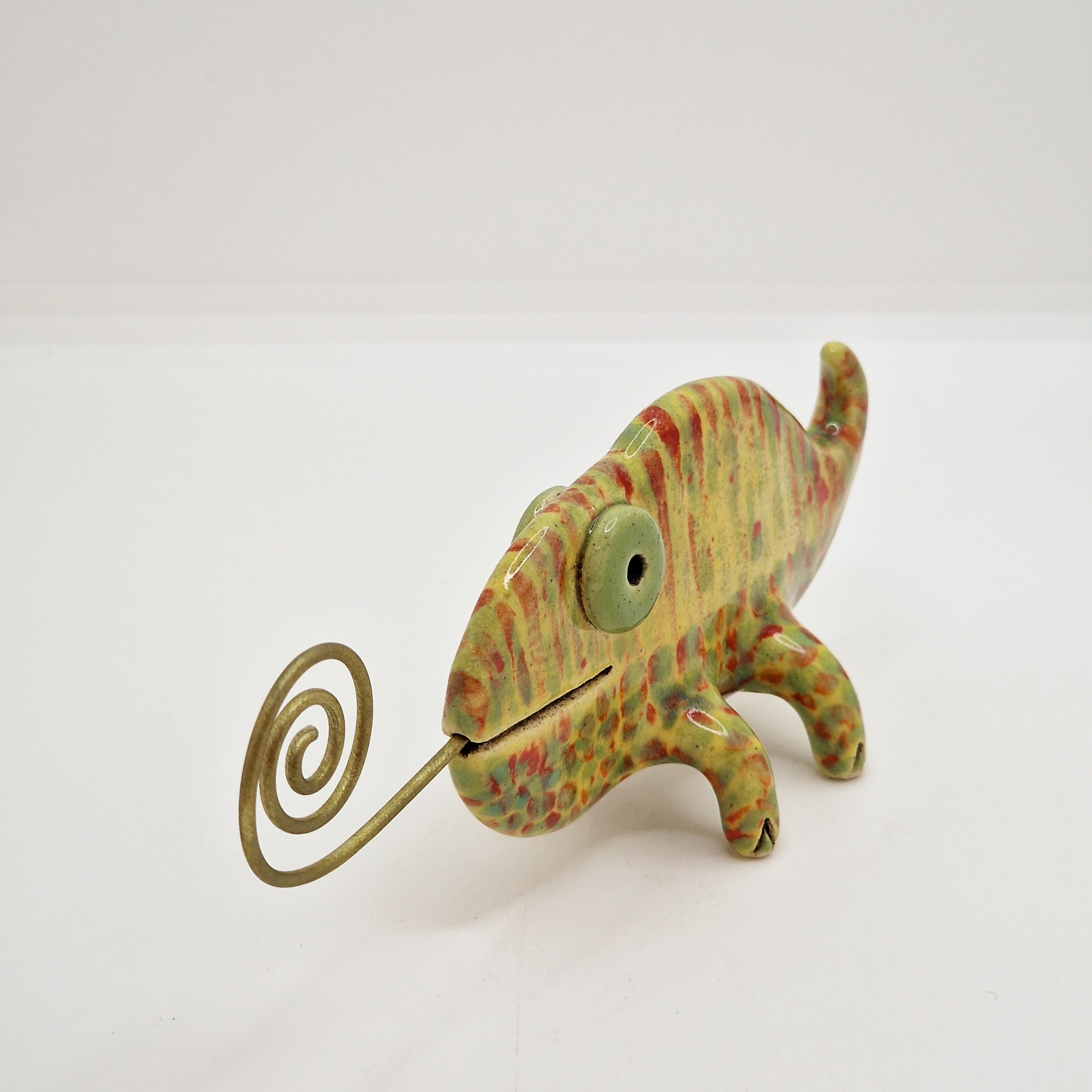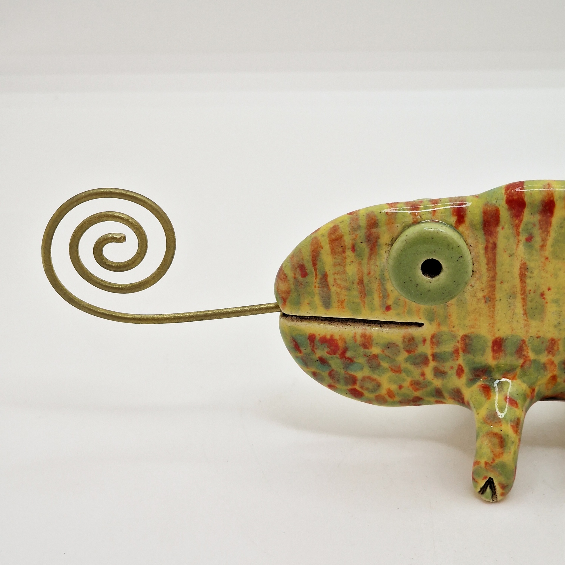 • Figura decorativa de camaleão em metal com língua em espiral