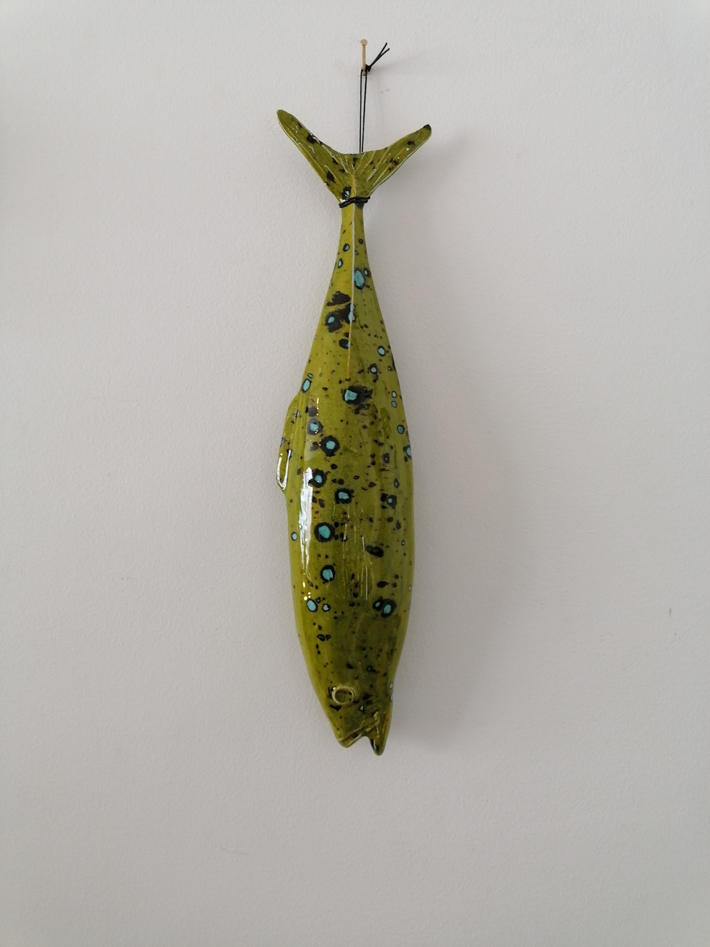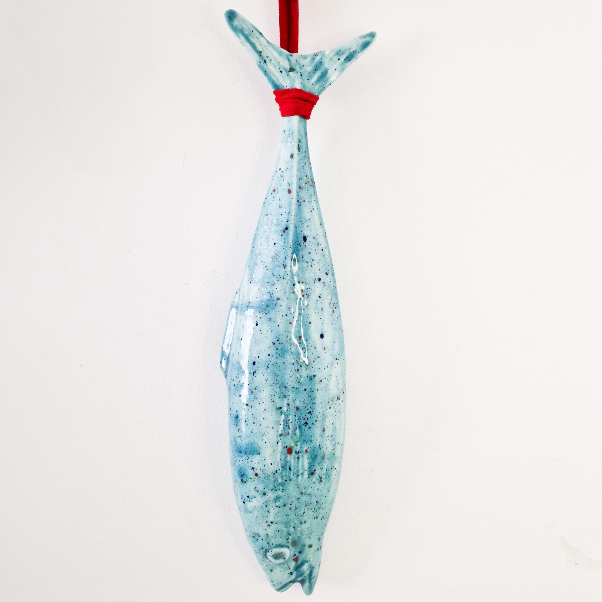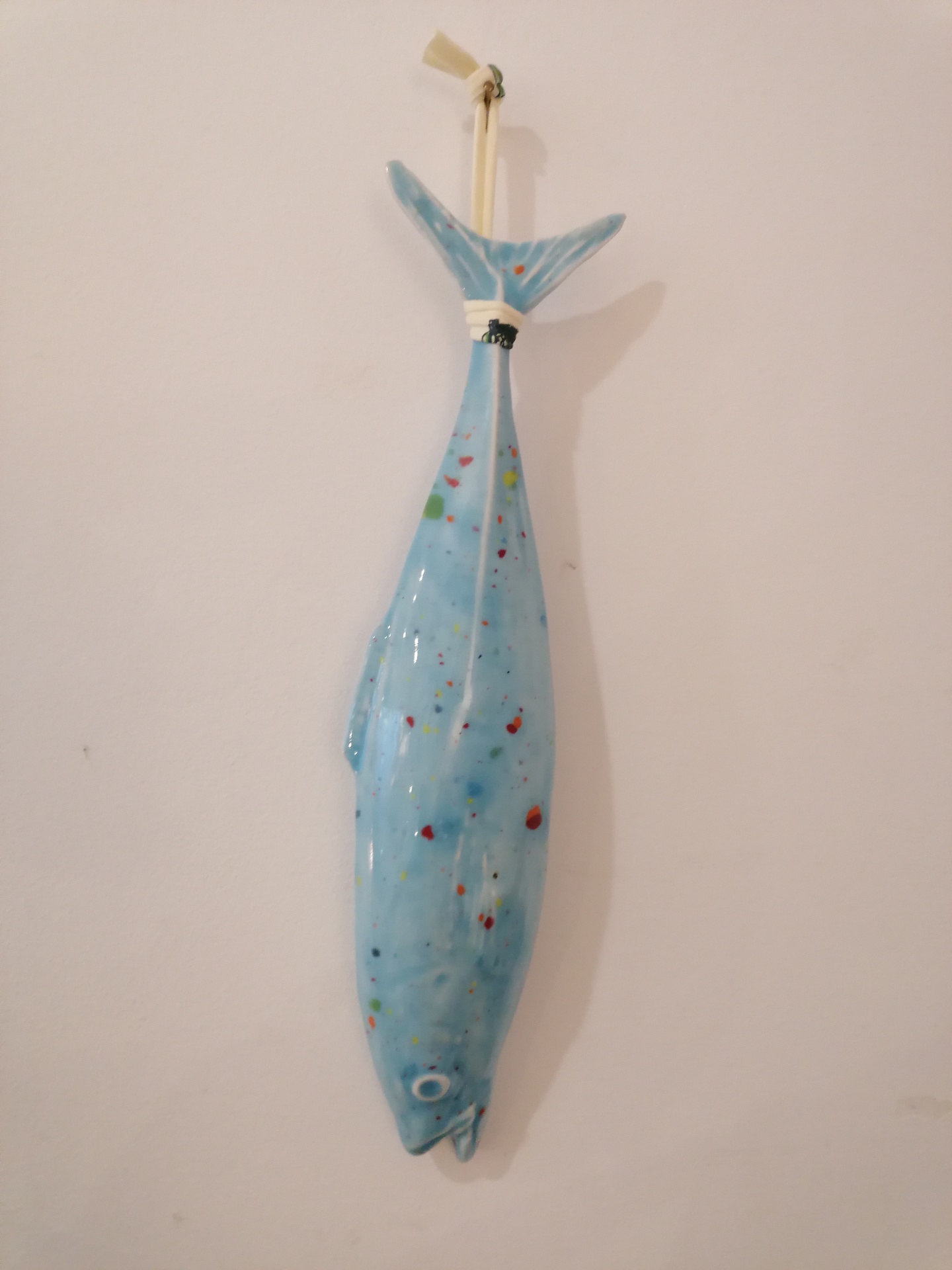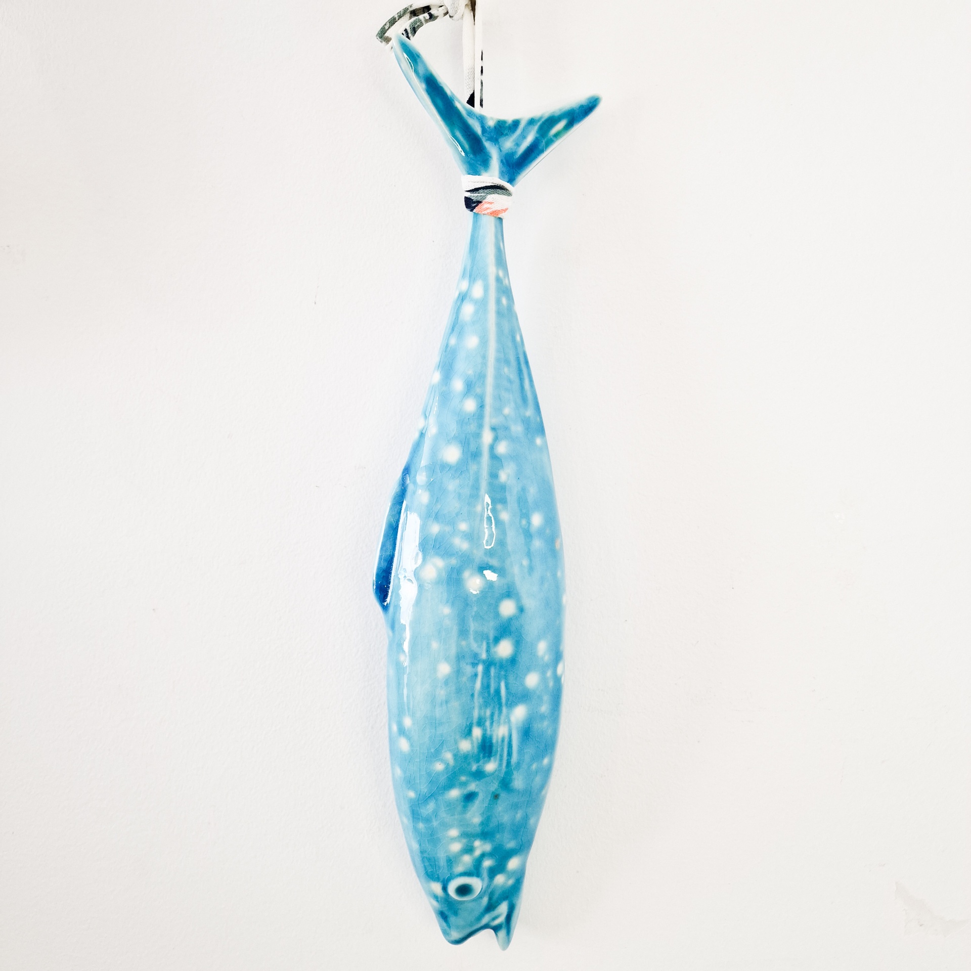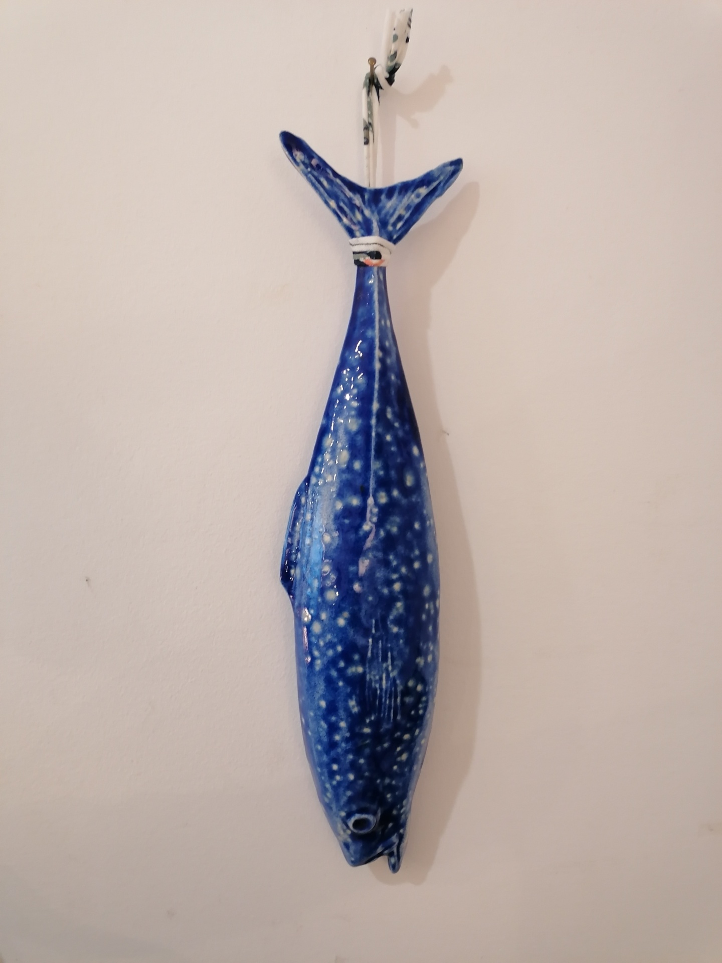 • Peixe decorativo em cerâmica azul claro com manchas brancas pendurado numa parede branca