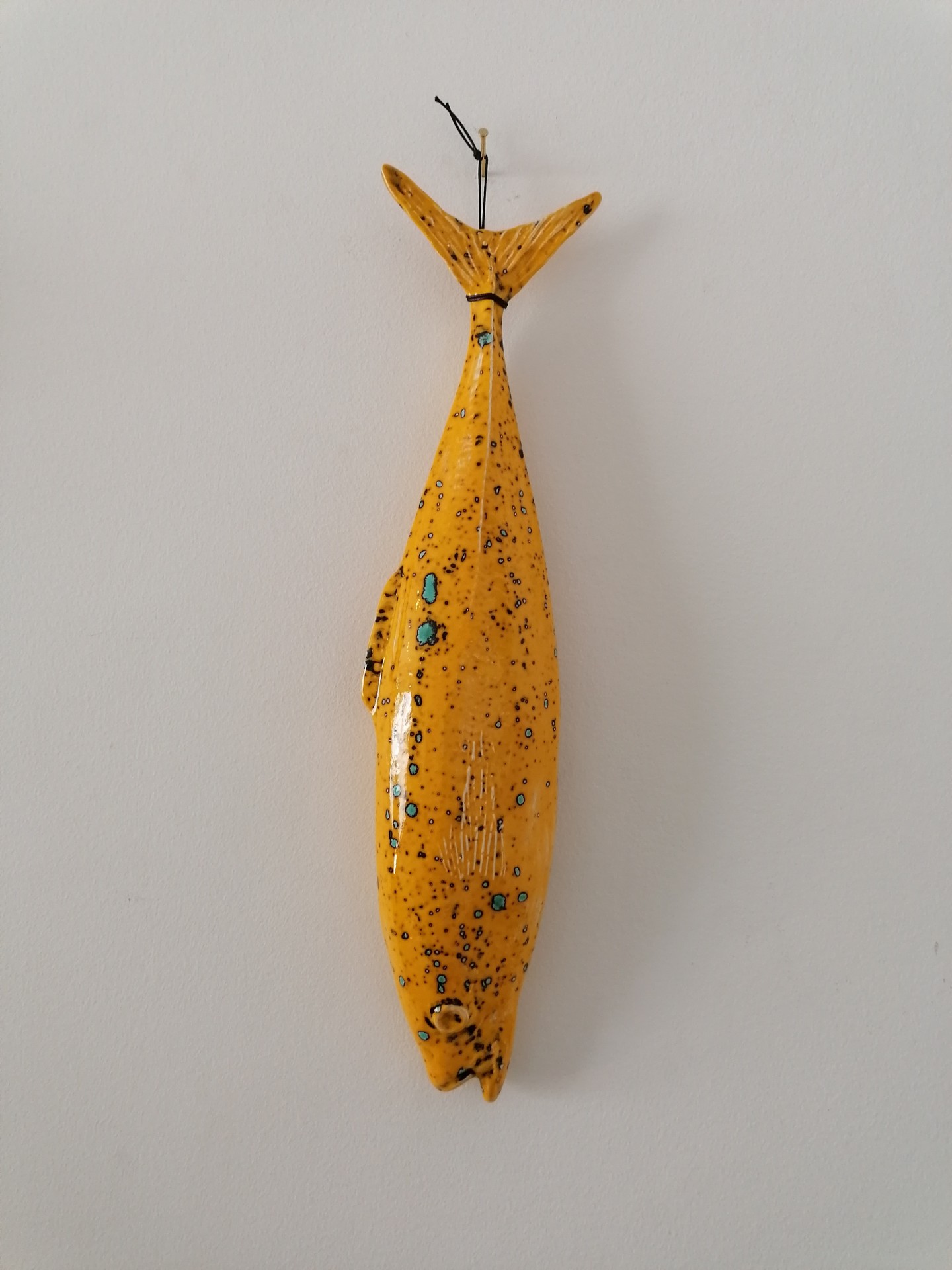 • Peixe decorativo cerâmico amarelo com manchas pretas e detalhes azuis na parede