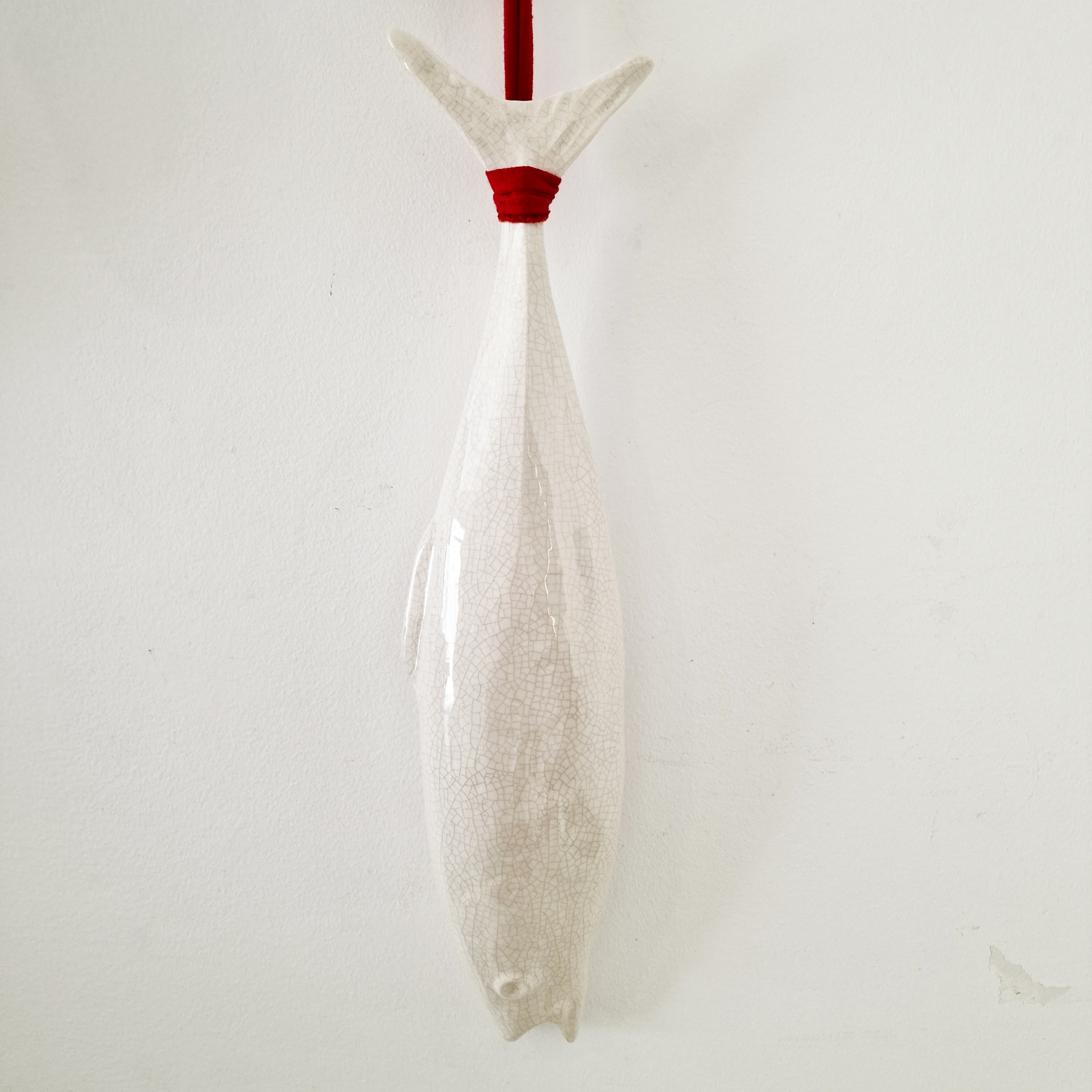 • Escultura de peixe branco pendurada na parede com laço vermelho