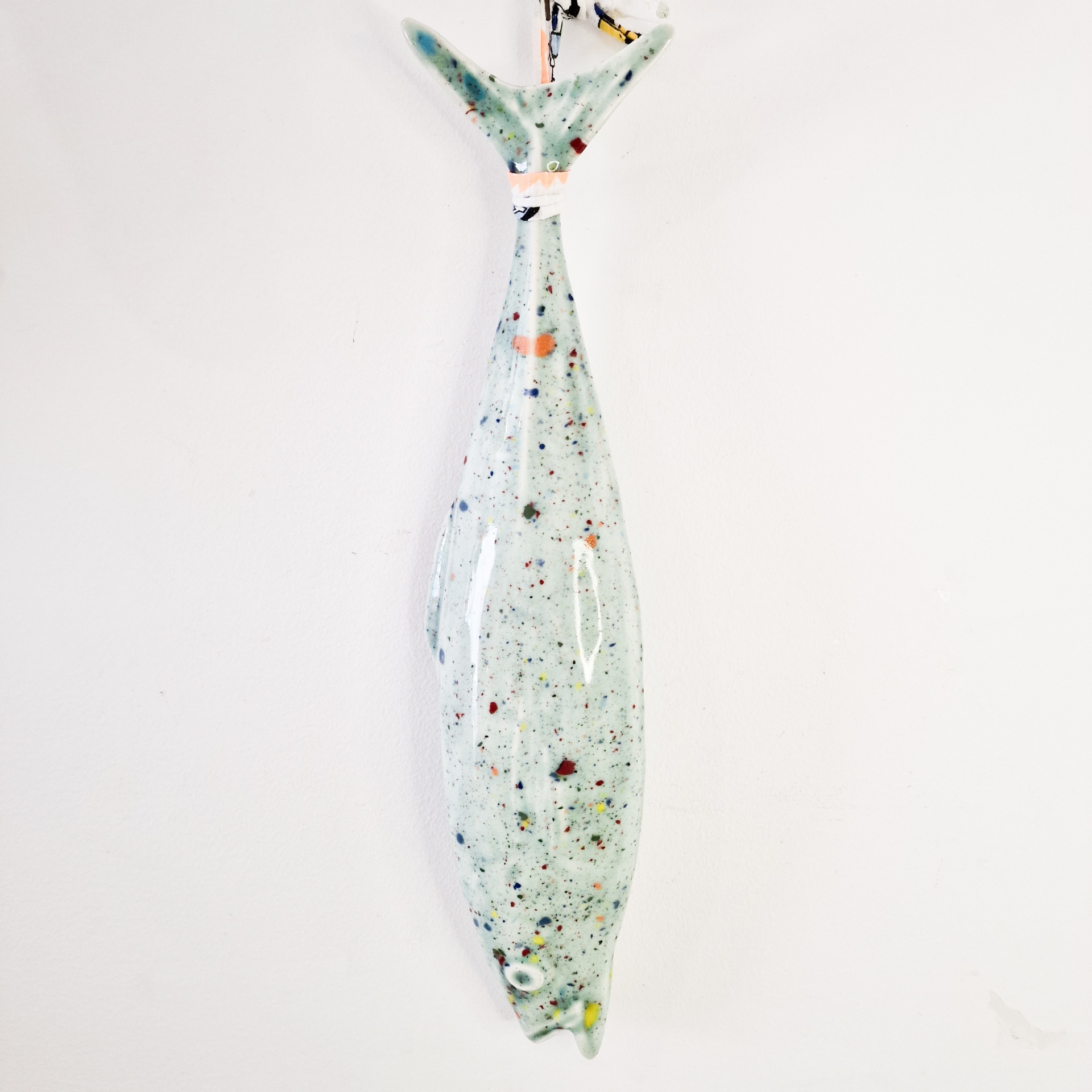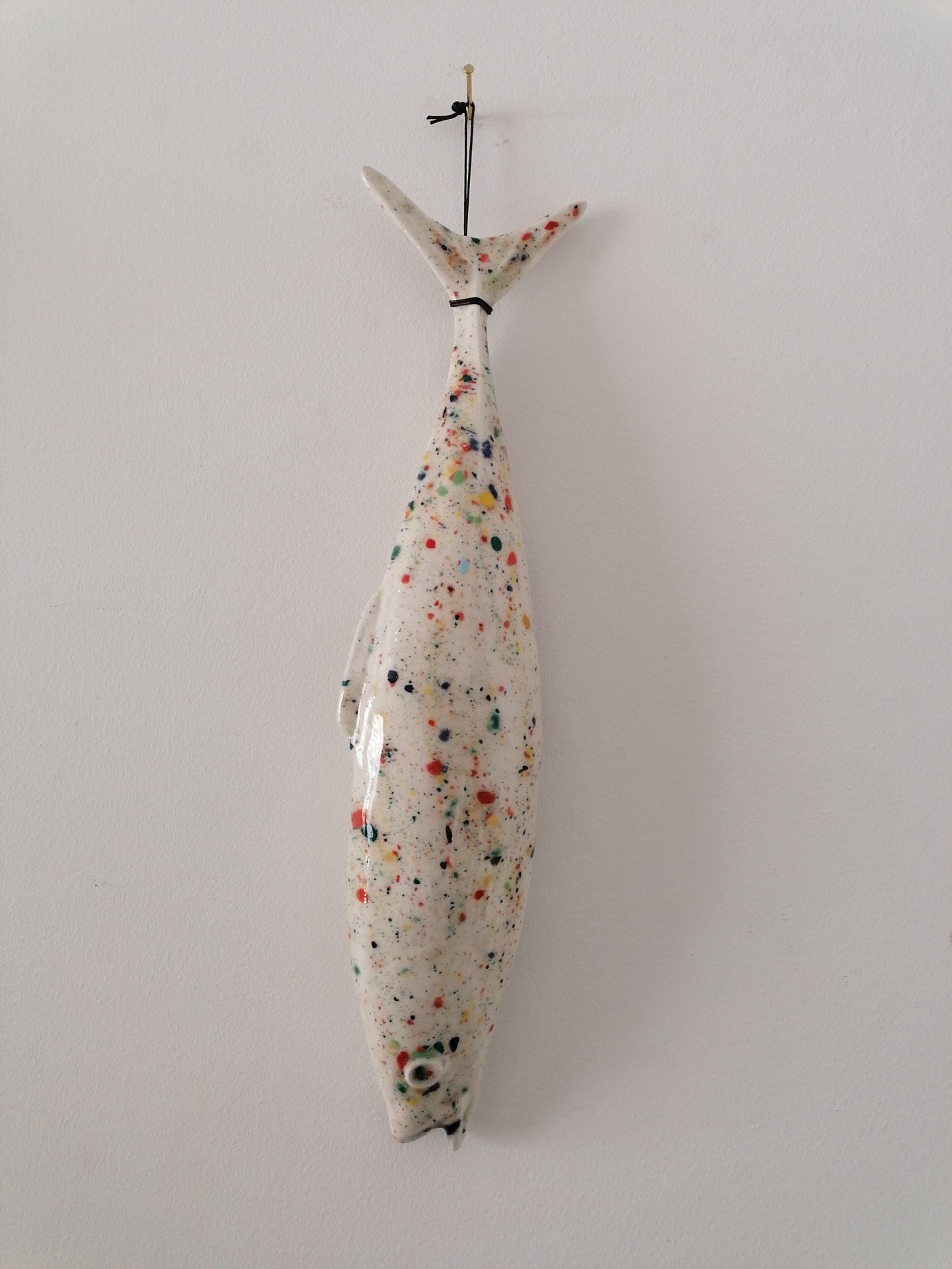 • Escultura cerâmica de peixe branco com salpicos coloridos pendurada na parede