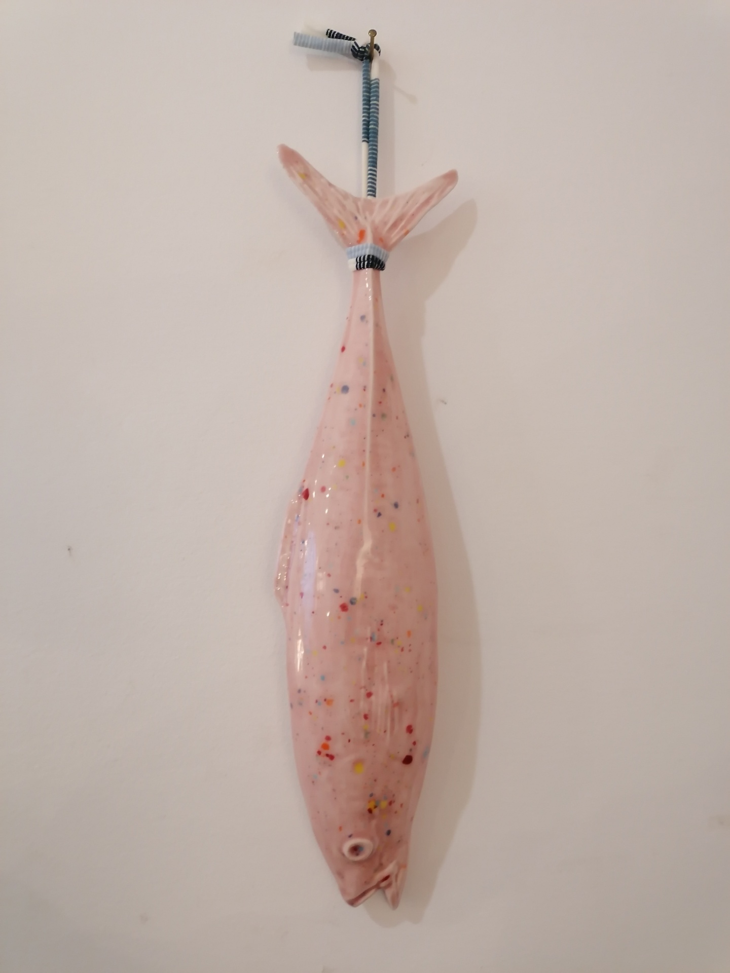 • Escultura em forma de peixe rosa com manchas coloridas pendurada na parede