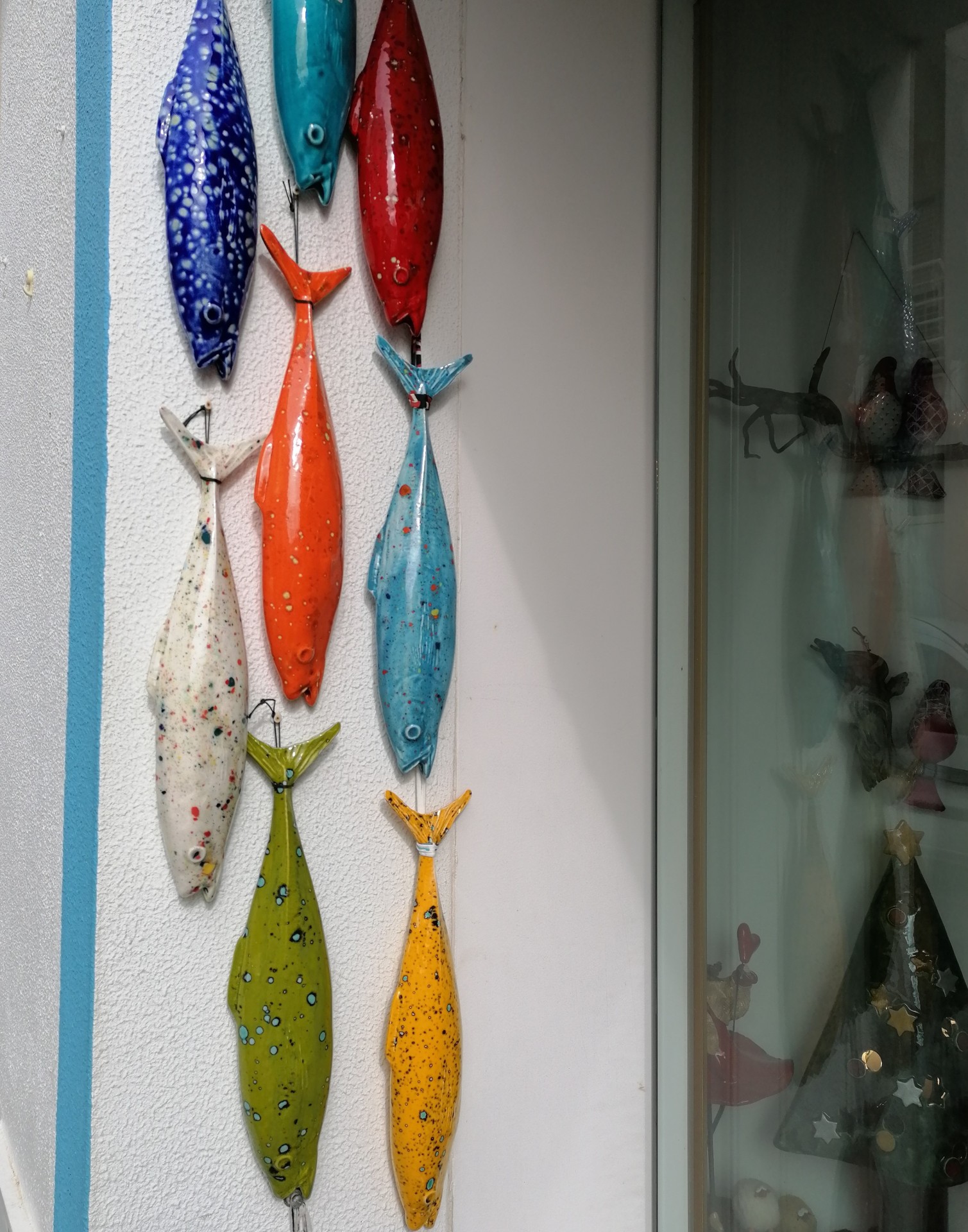 • Peixes decorativos coloridos em cerâmica pendurados numa parede branca ao lado de uma porta de vidro