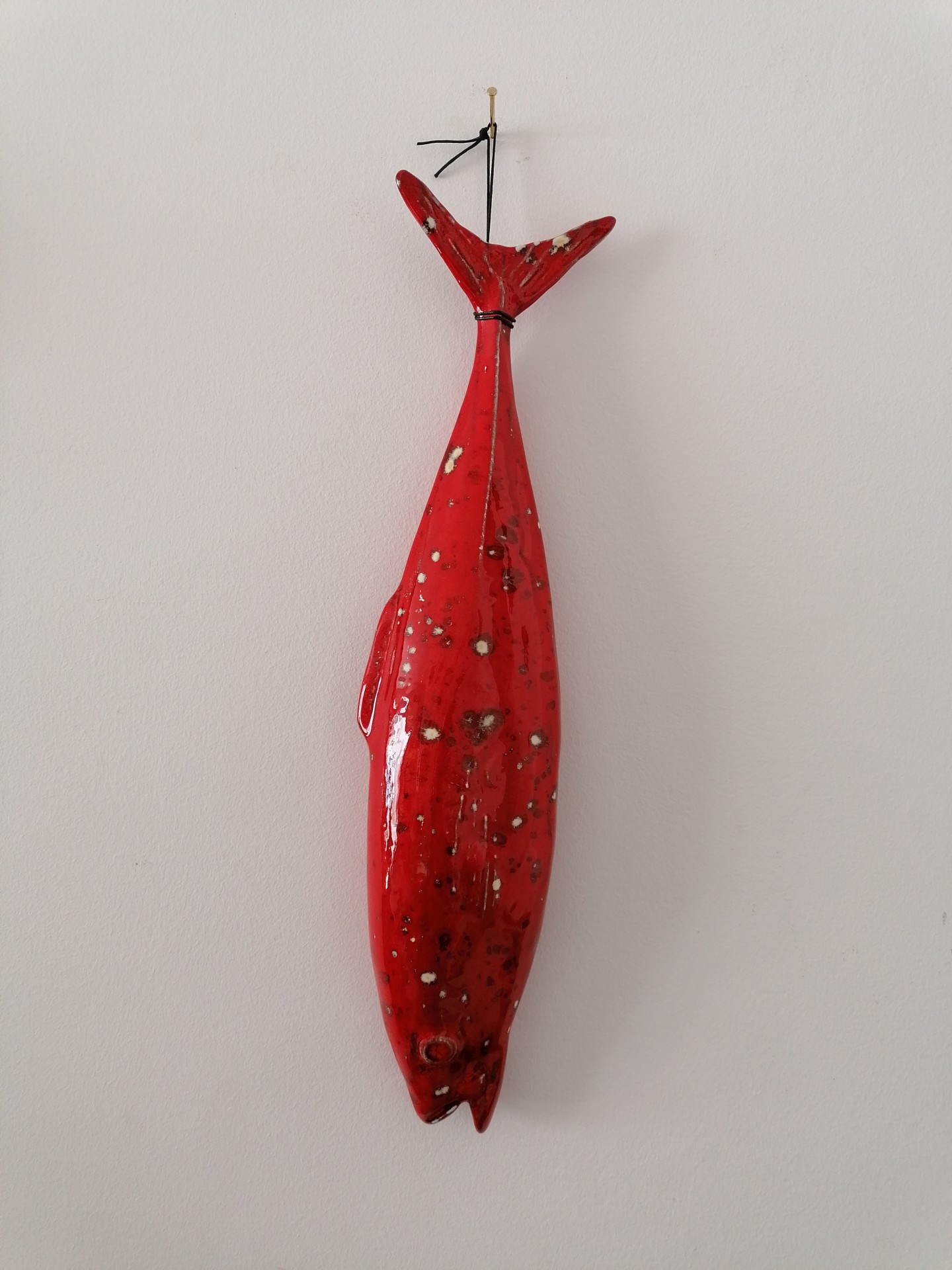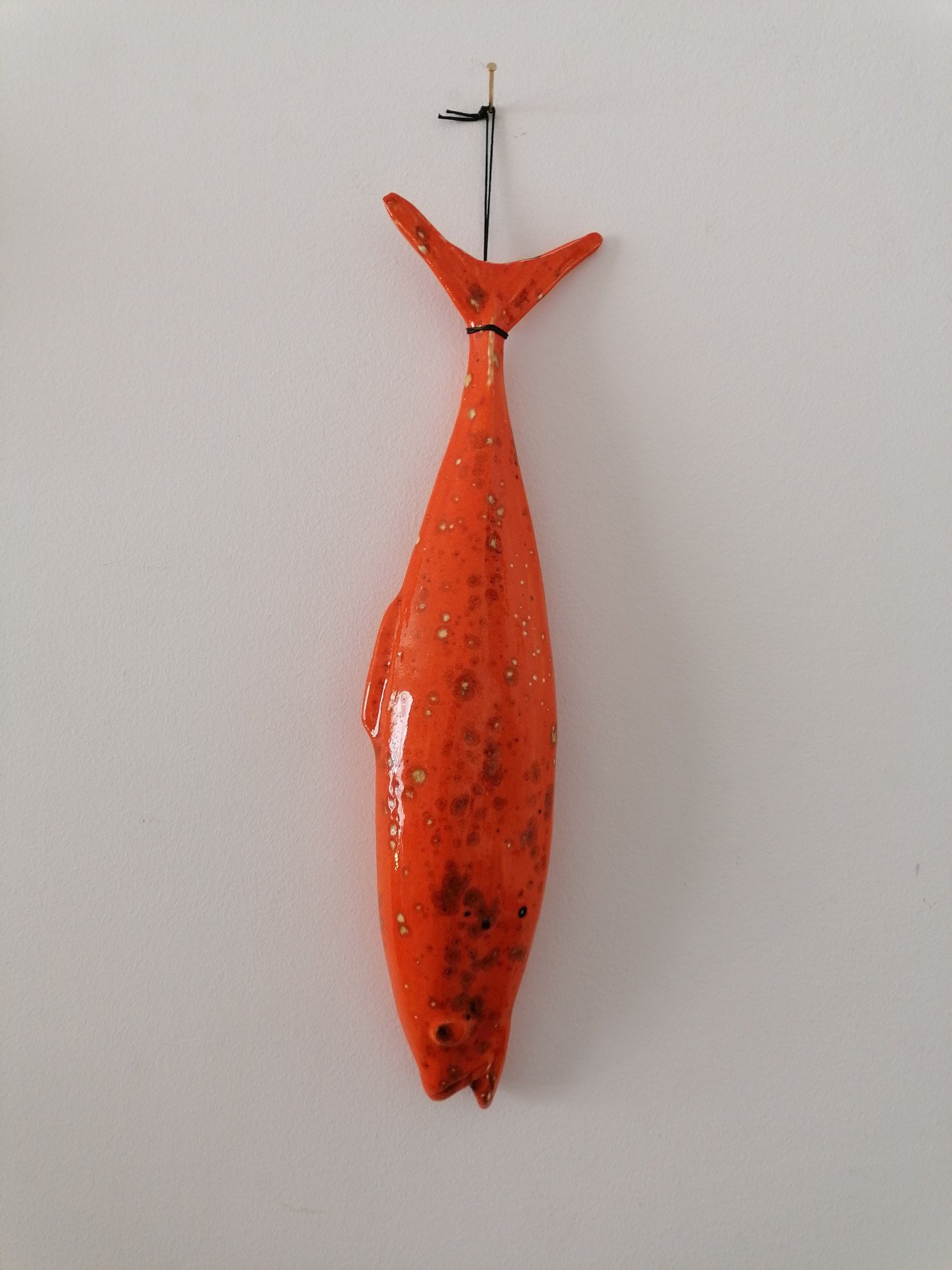 • Escultura de peixe em cerâmica vidrada laranja pendurada na parede