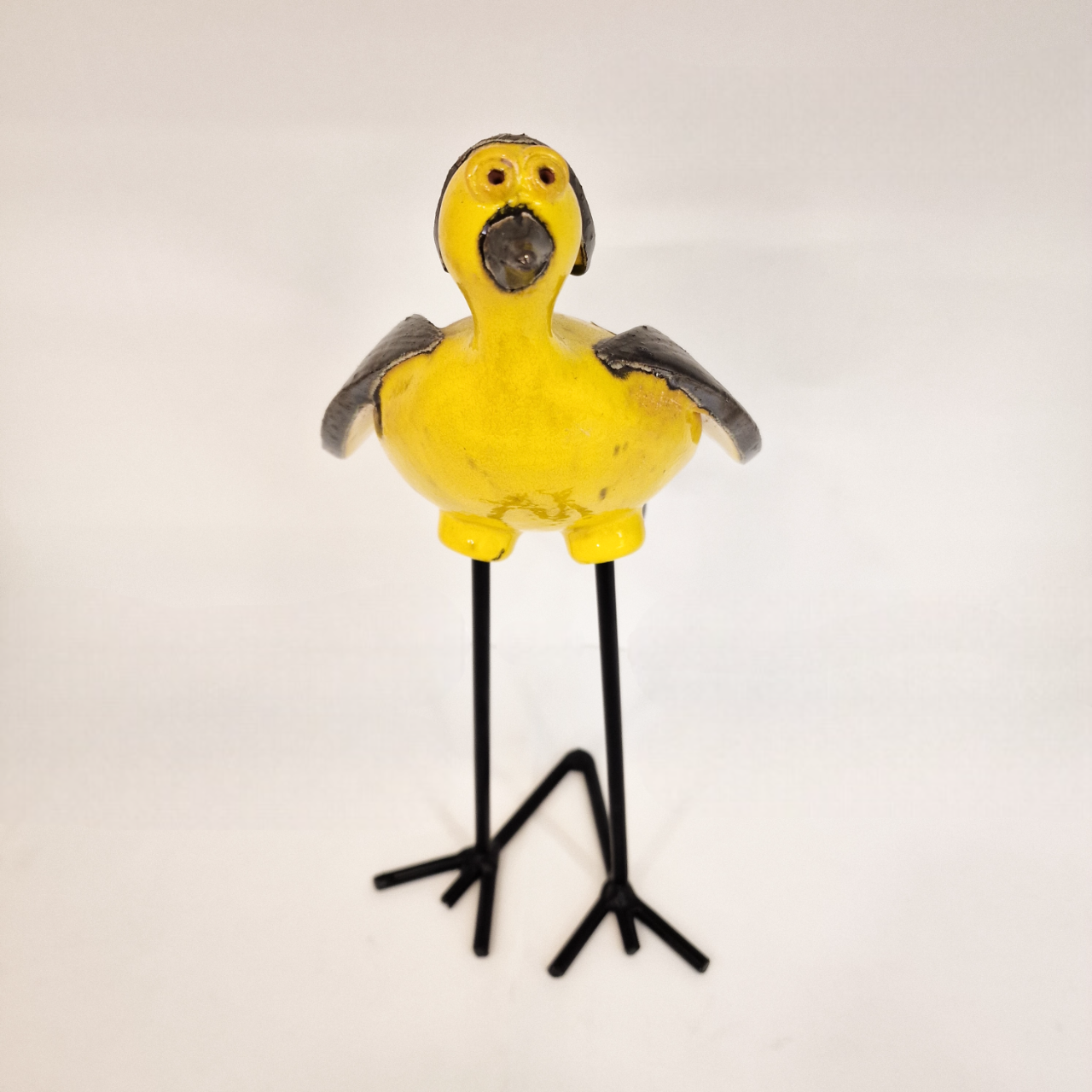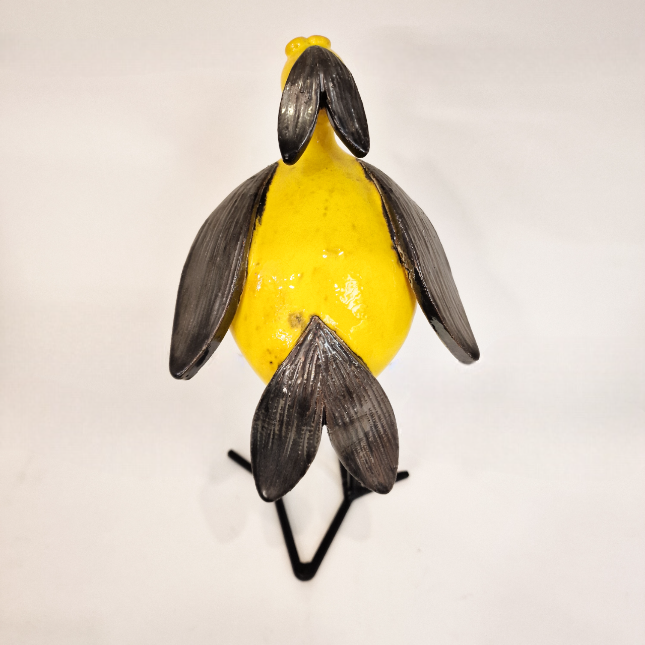 • Estatueta amarela de pássaro com asas cinzentas e pernas de metal preto
