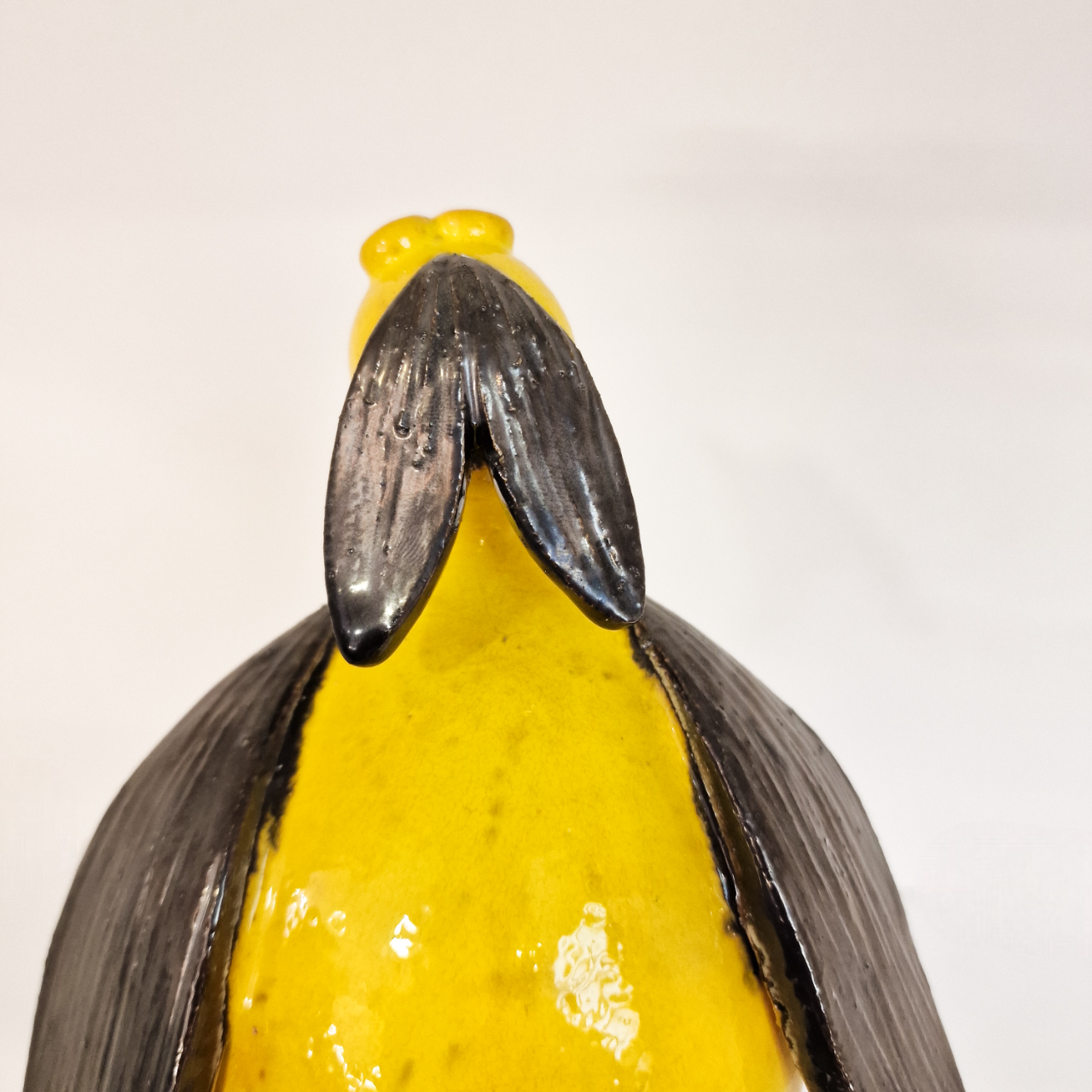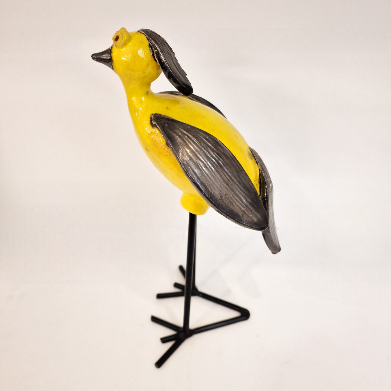 • Escultura de pássaro amarela e preta em cerâmica com suportes pretos