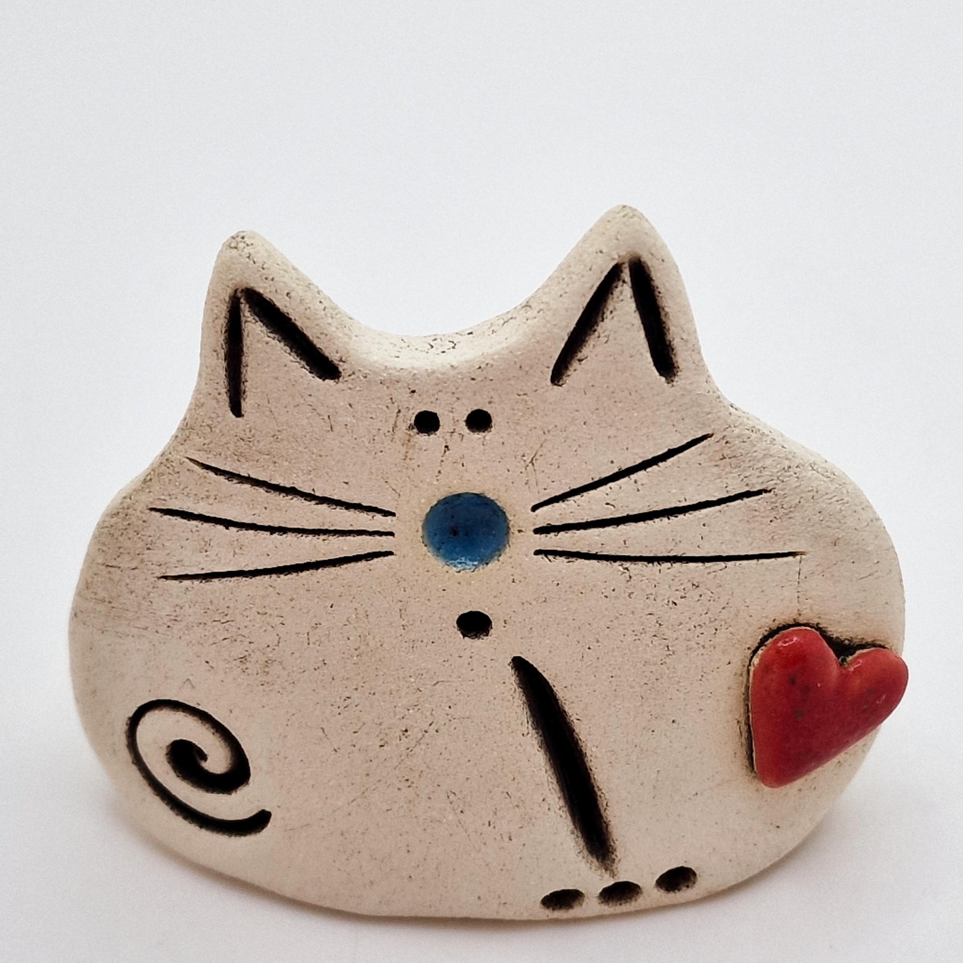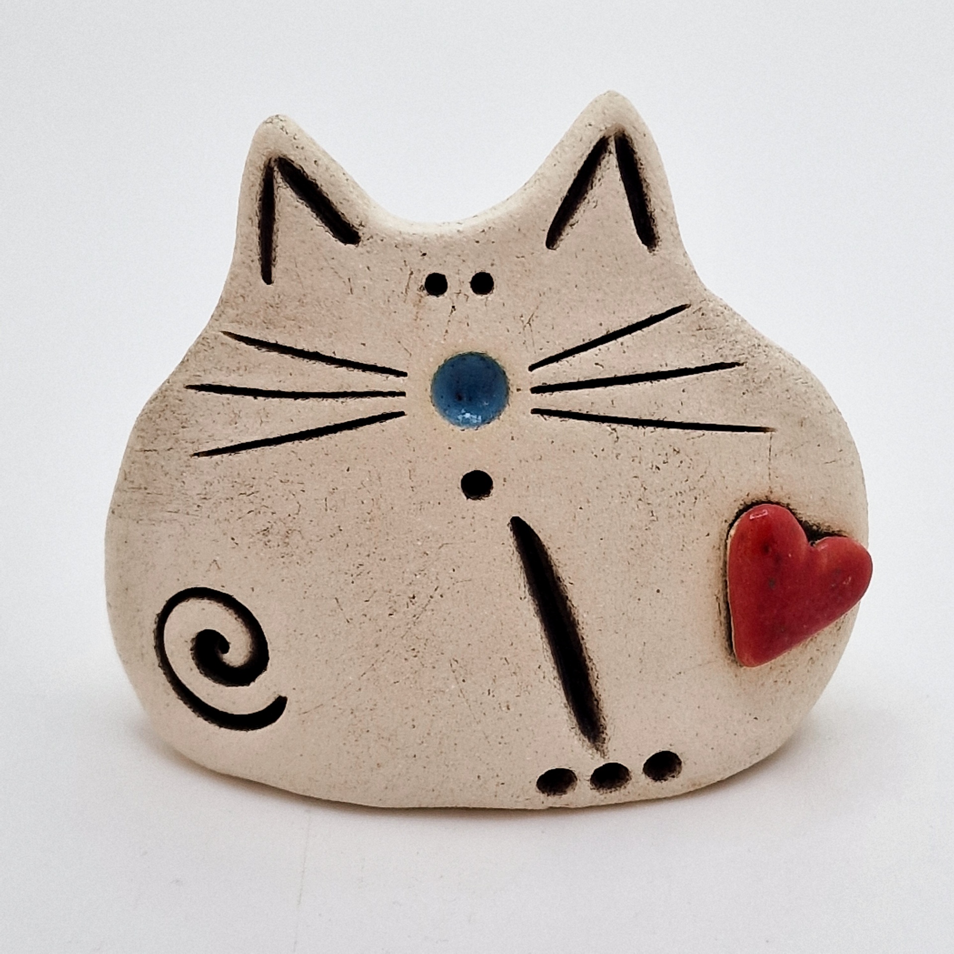 Escultura de gato em cerâmica bege com detalhes pretos e coração vermelho