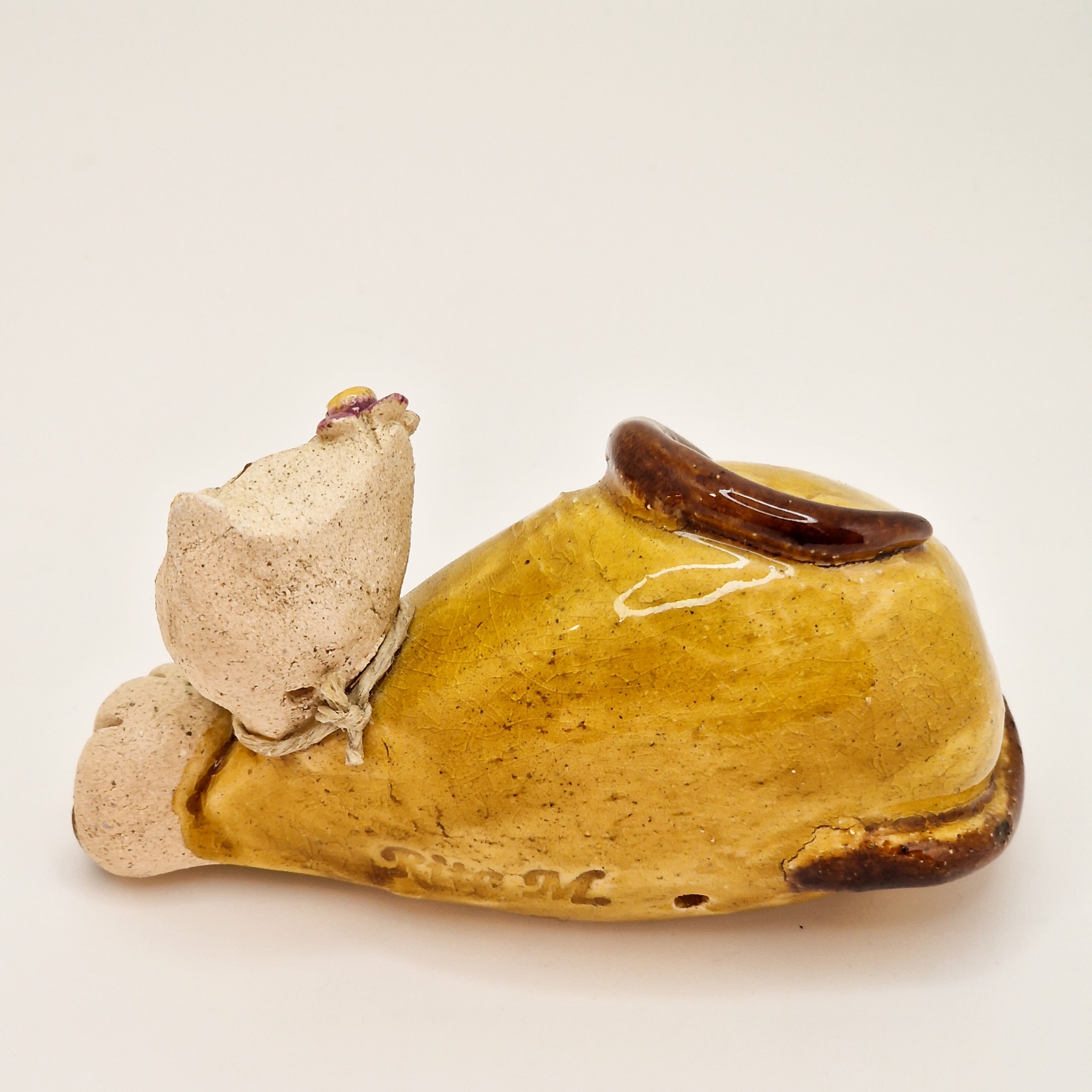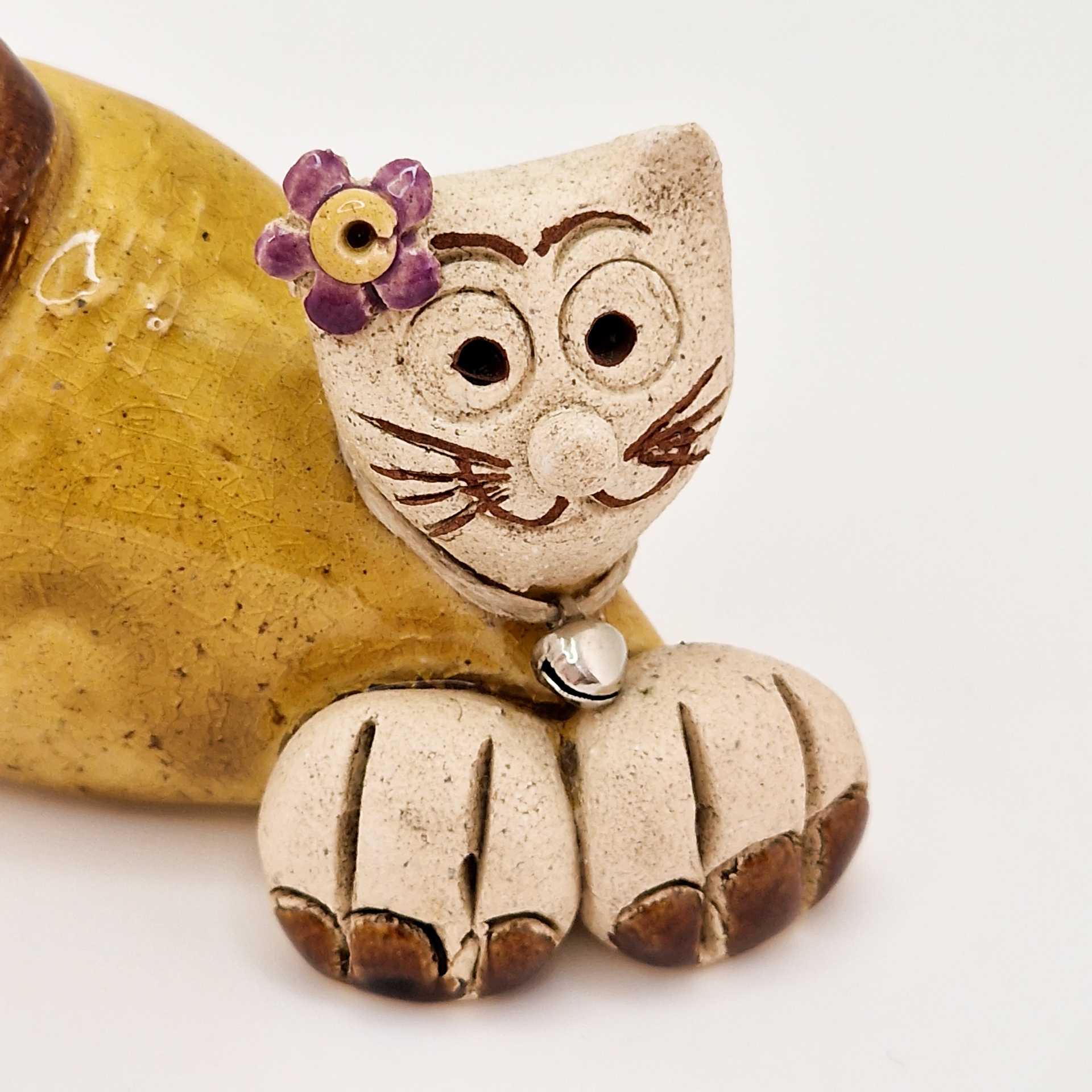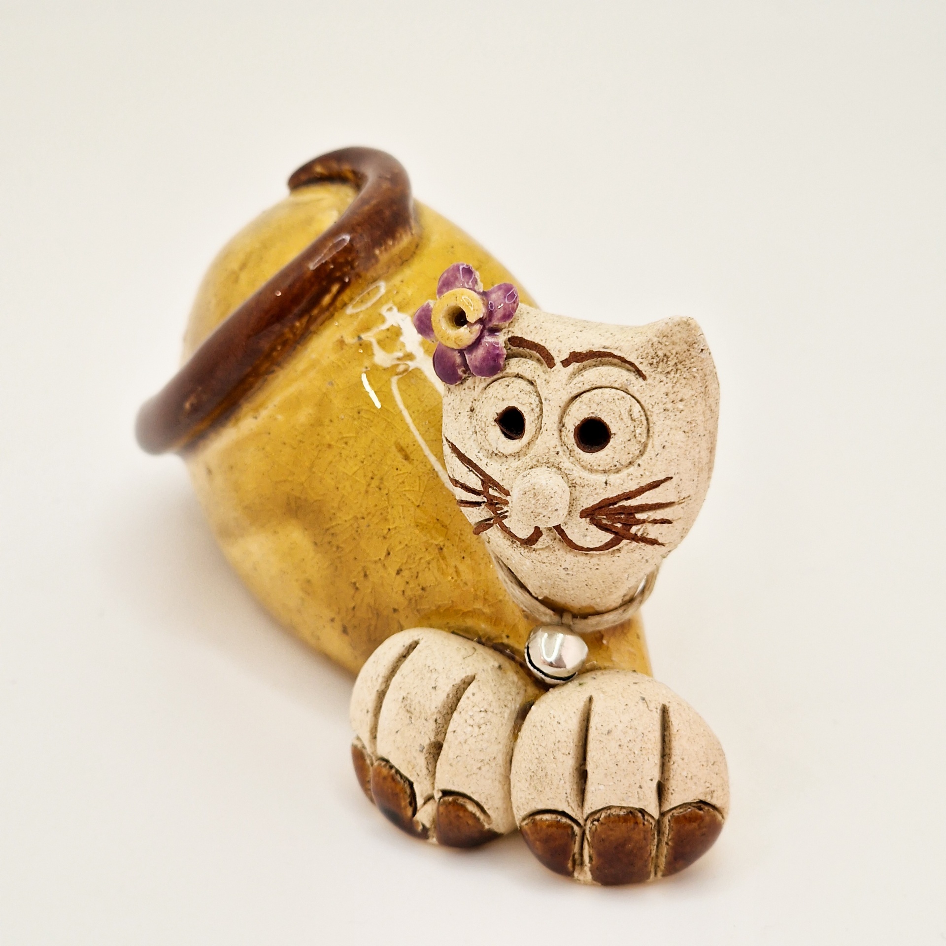 Gato 25,50 € Desconto de %. IVA incluído. Partilhar Comprar Contactar Gato feito em cerâmica grés e vidrado, possue um colar com um mini sino. Peça única. Dimensões: Altura/ largura: 6x11cm As cores dos produtos poderão sofrer ligeiras alterações devido à reprodução fotográfica. Tags decoraçãoceramicapeça de autorgatocatChaton Características