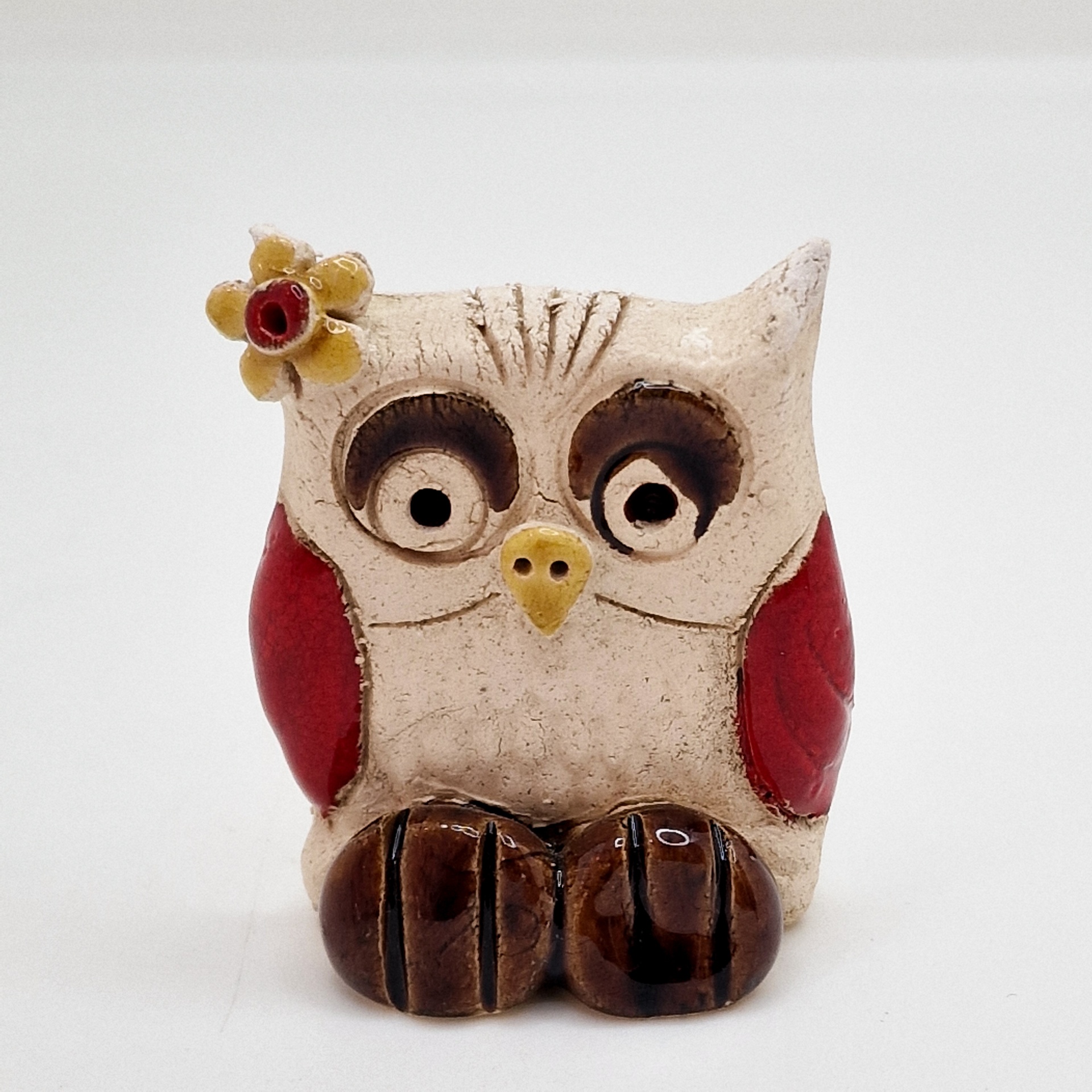 • Figura decorativa de coruja em cerâmica com asas vermelhas e flor na cabeça