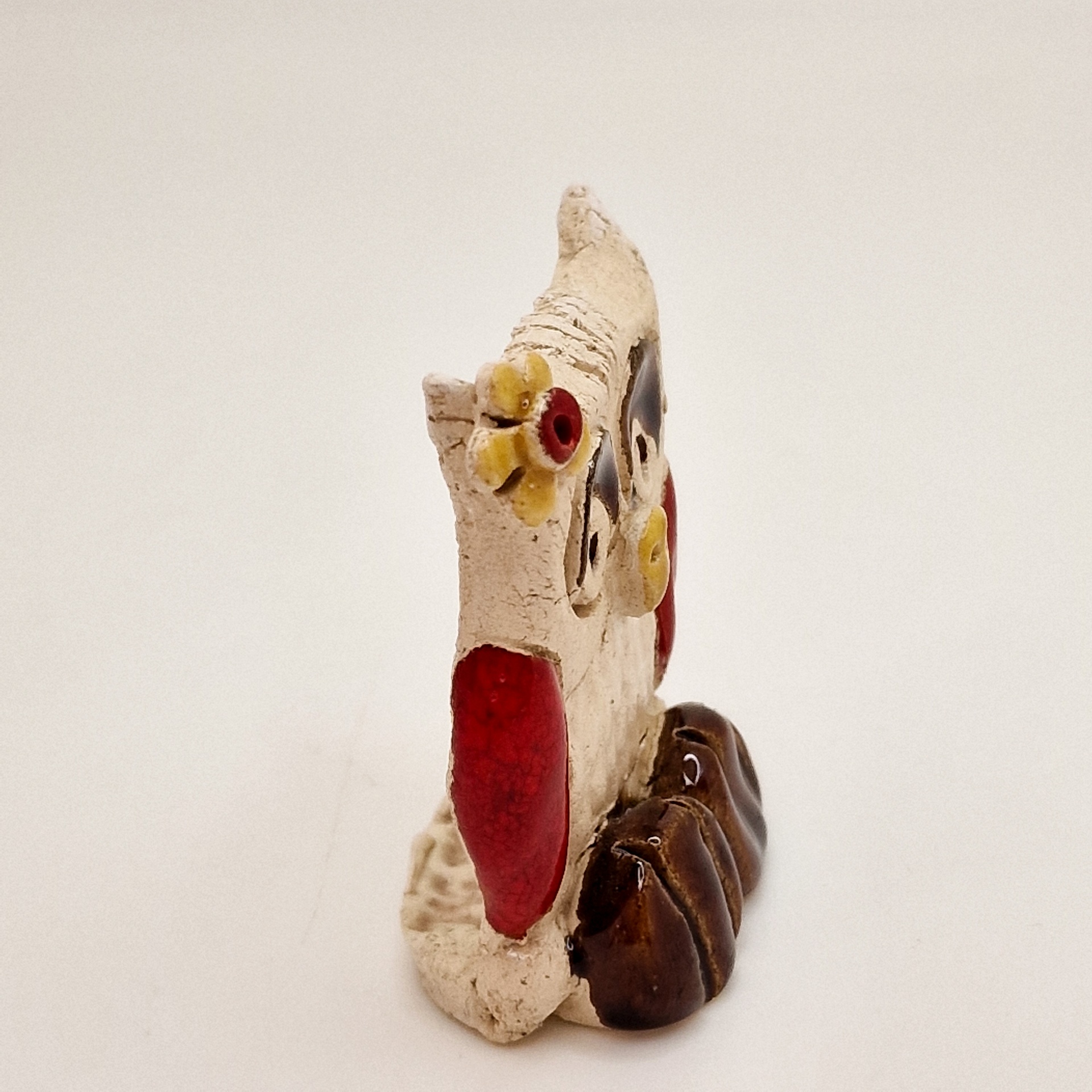 • Figura decorativa em cerâmica com cores bege, castanha, vermelho e amarelo