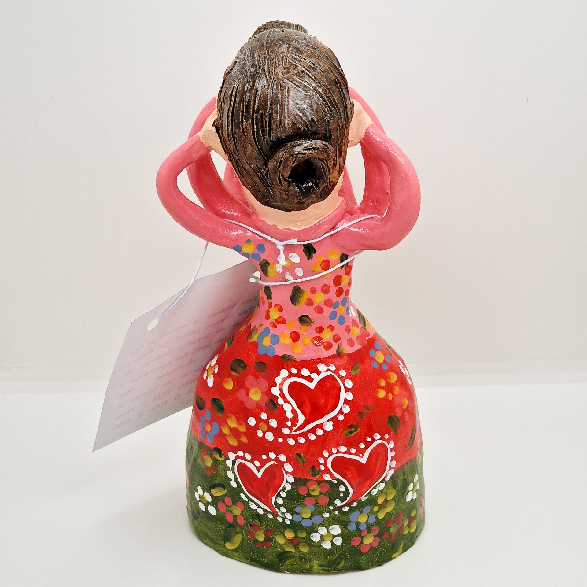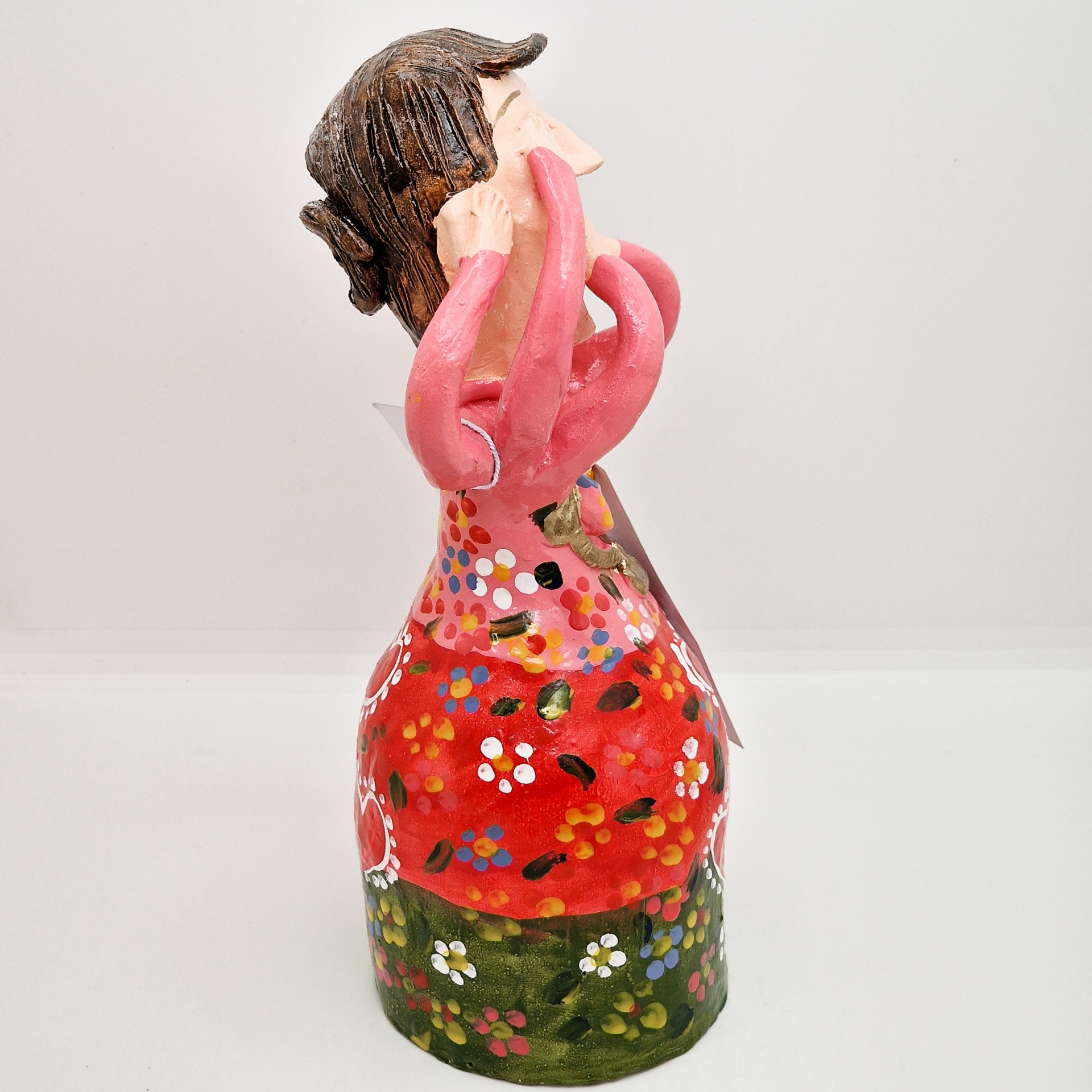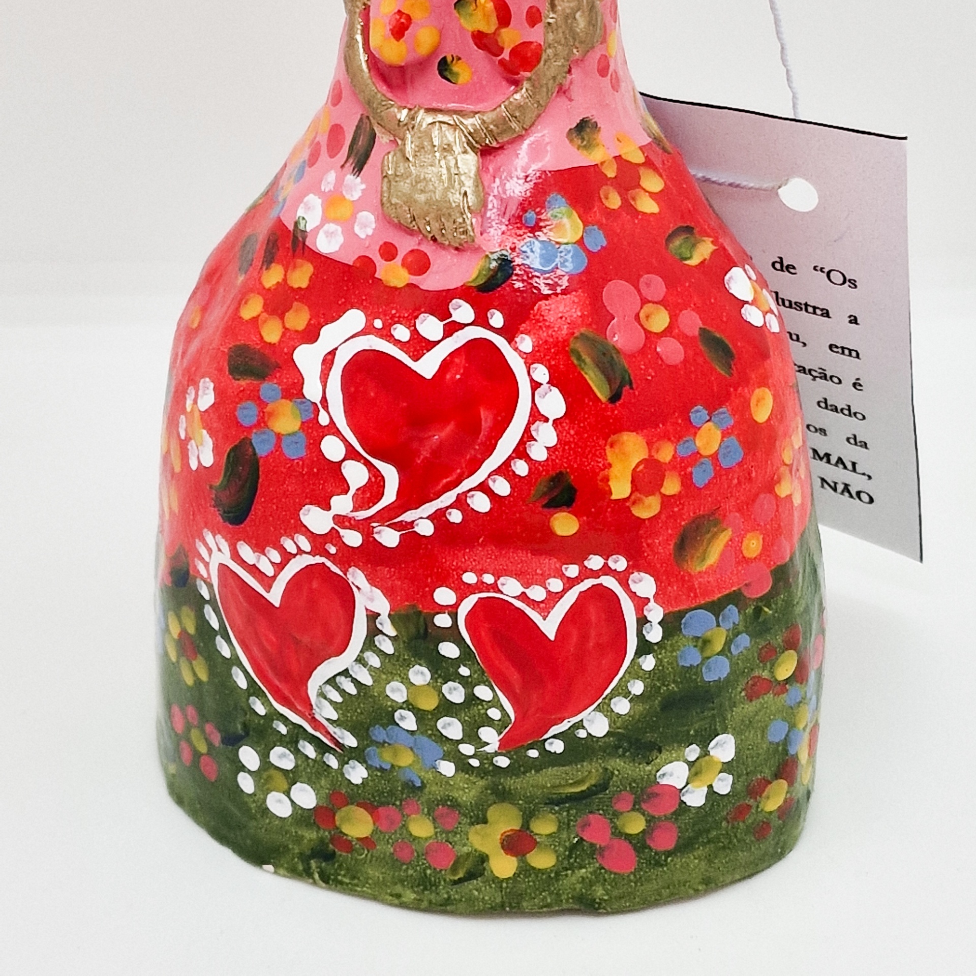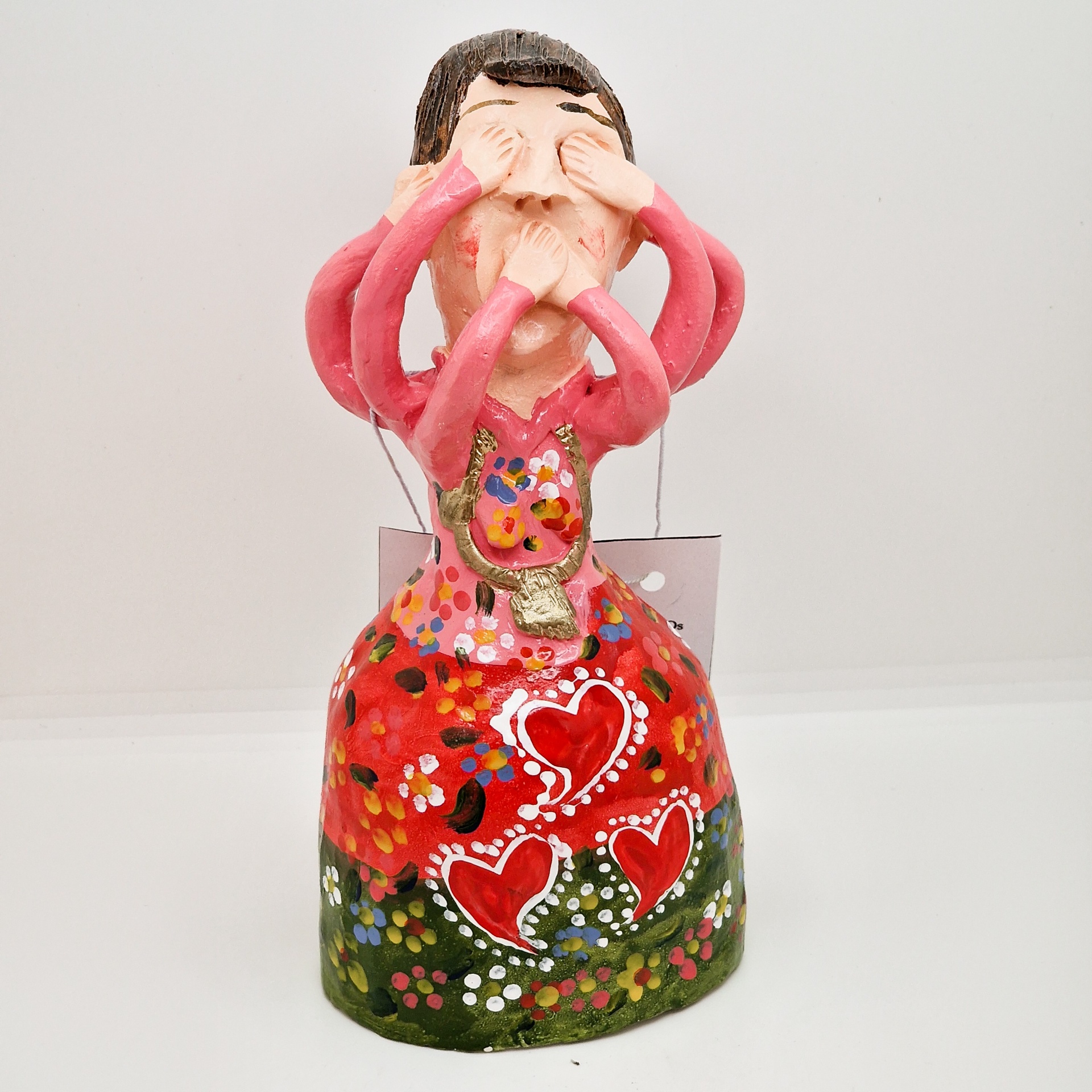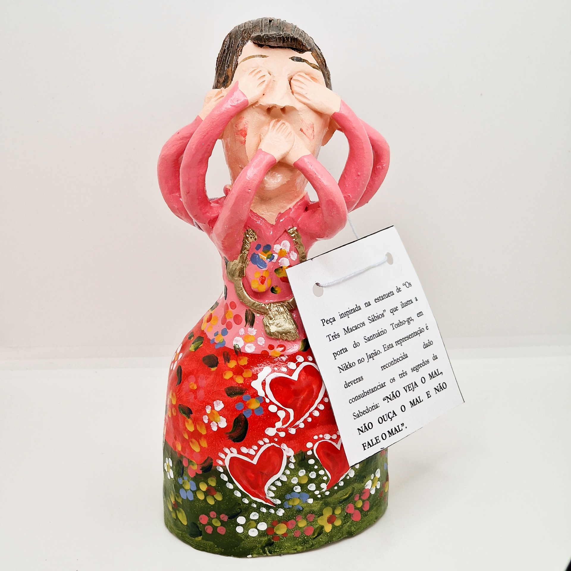 • Estatueta colorida de cerâmica com várias mãos cobrindo rosto e roupa decorada com corações e flores