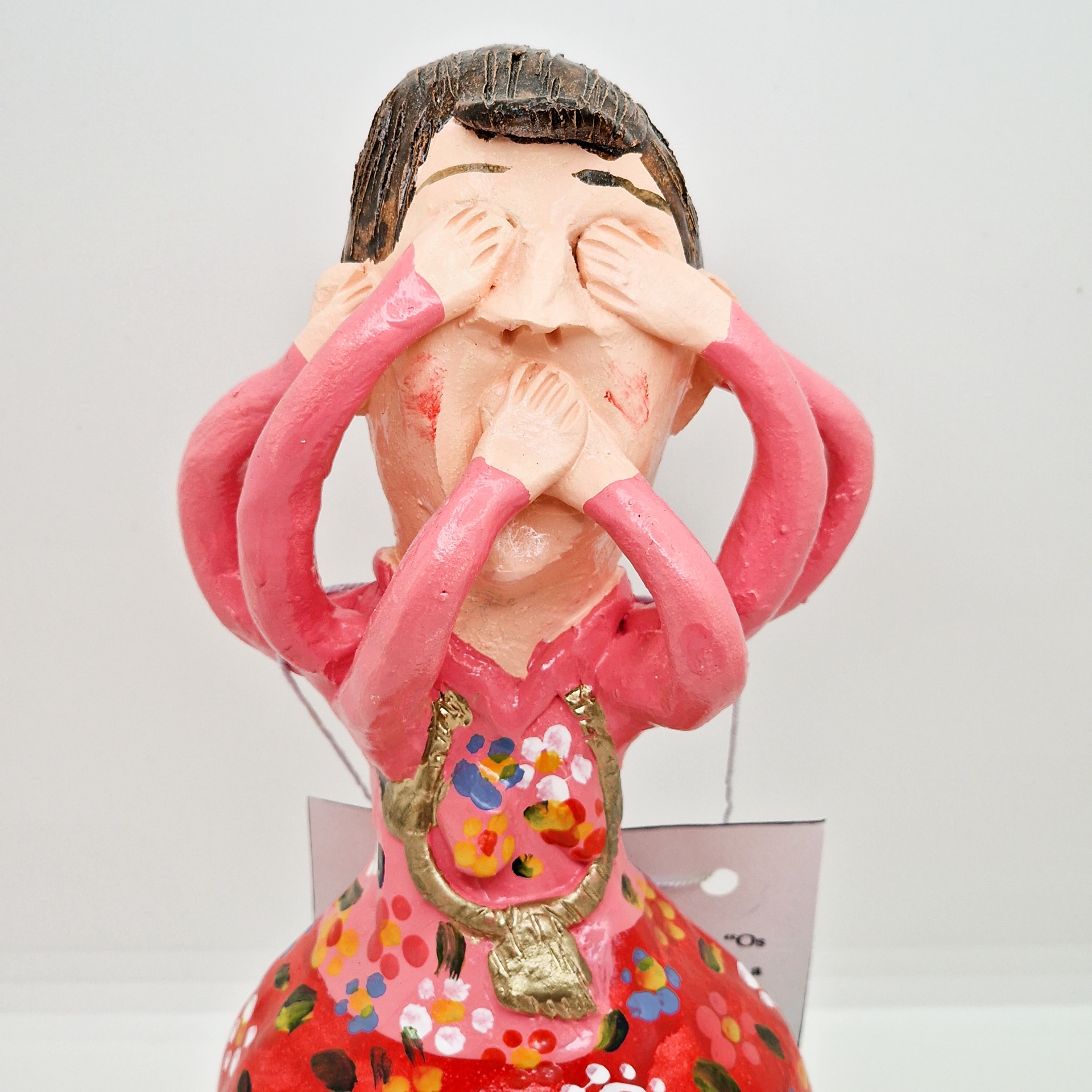 • Estátua cerâmica pintada à mão com vestido vermelho e verde decorado, figura com mãos sobre olhos e boca.