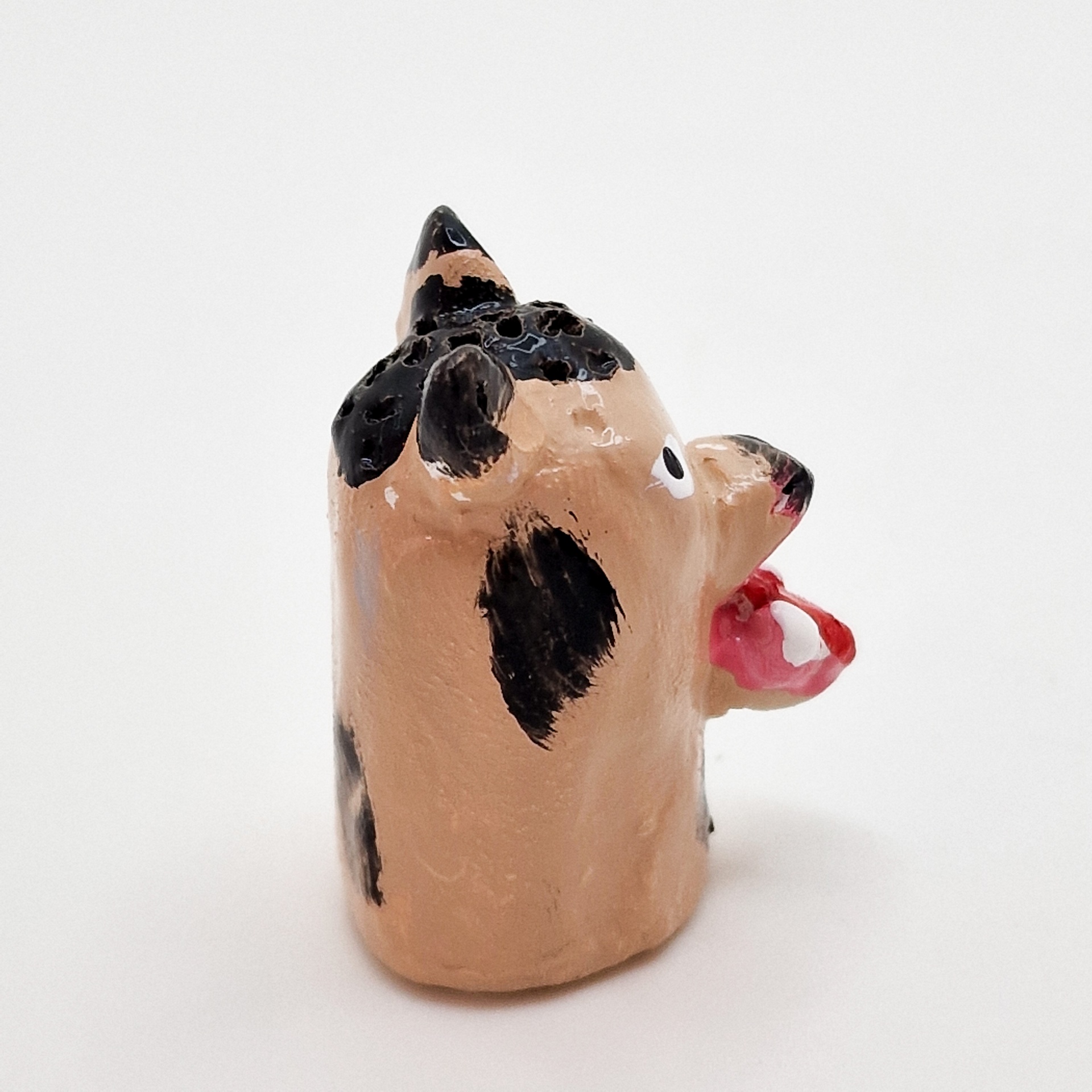 • Figura de cerâmica castanha e preta em forma de cão com língua vermelha