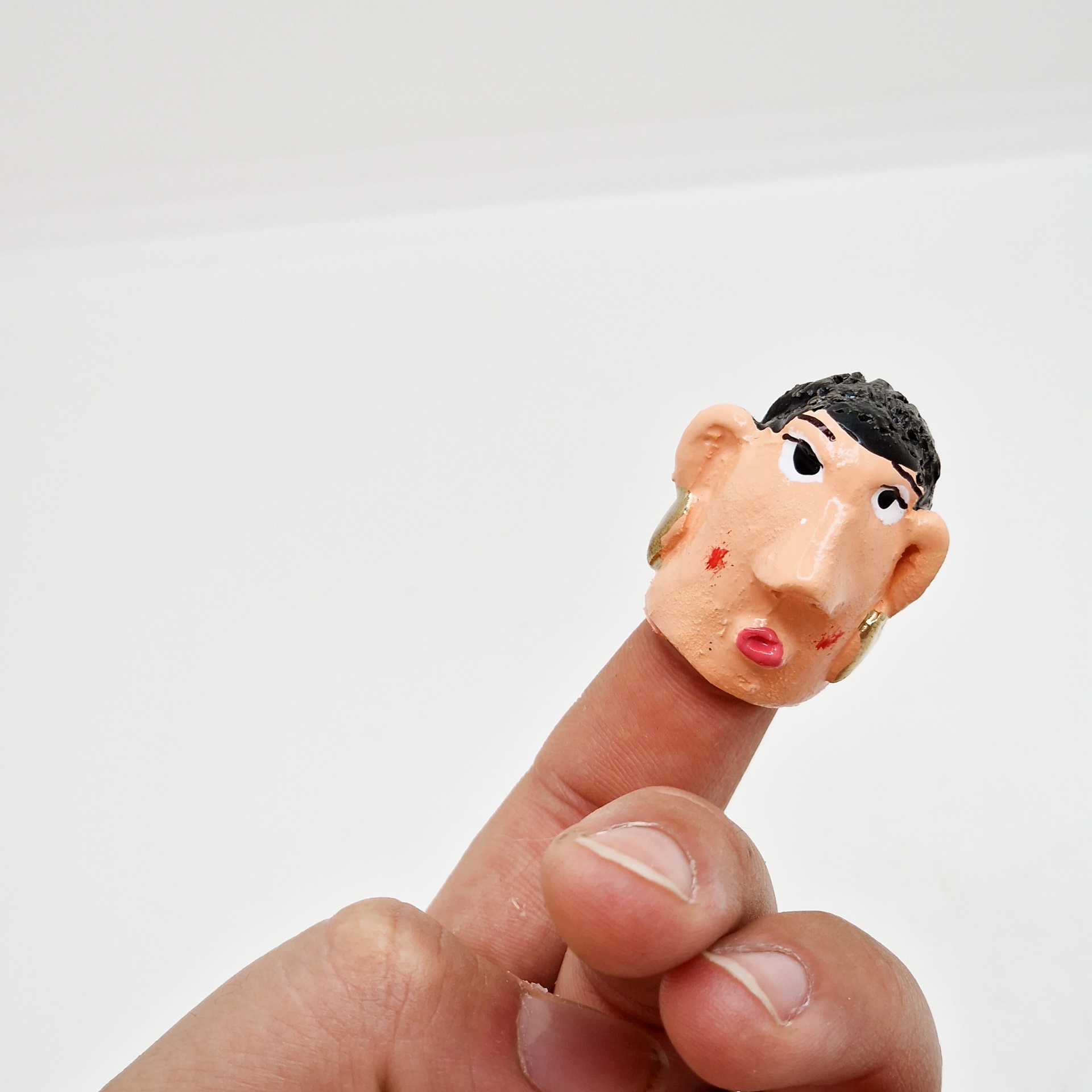 • Dedo com boneco cabeça humana com cabelo preto e brincos dourados
