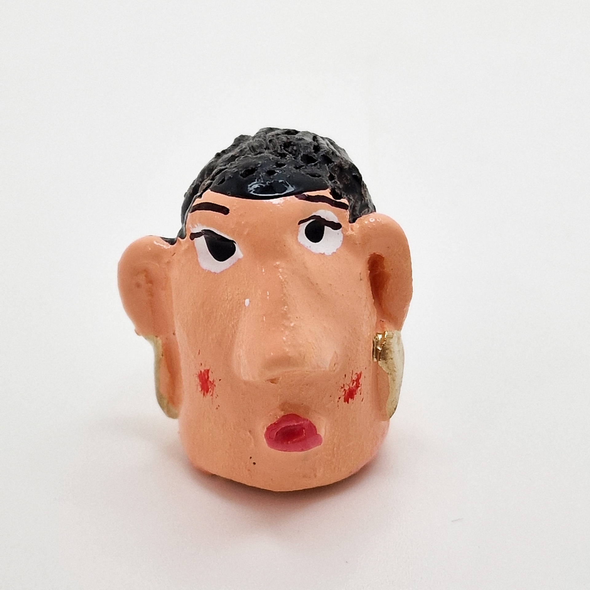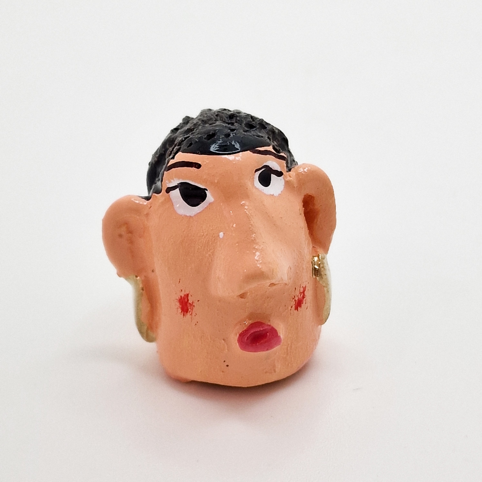 • Escultura pequena de cabeça com cabelo preto e brinco dourado em fundo branco