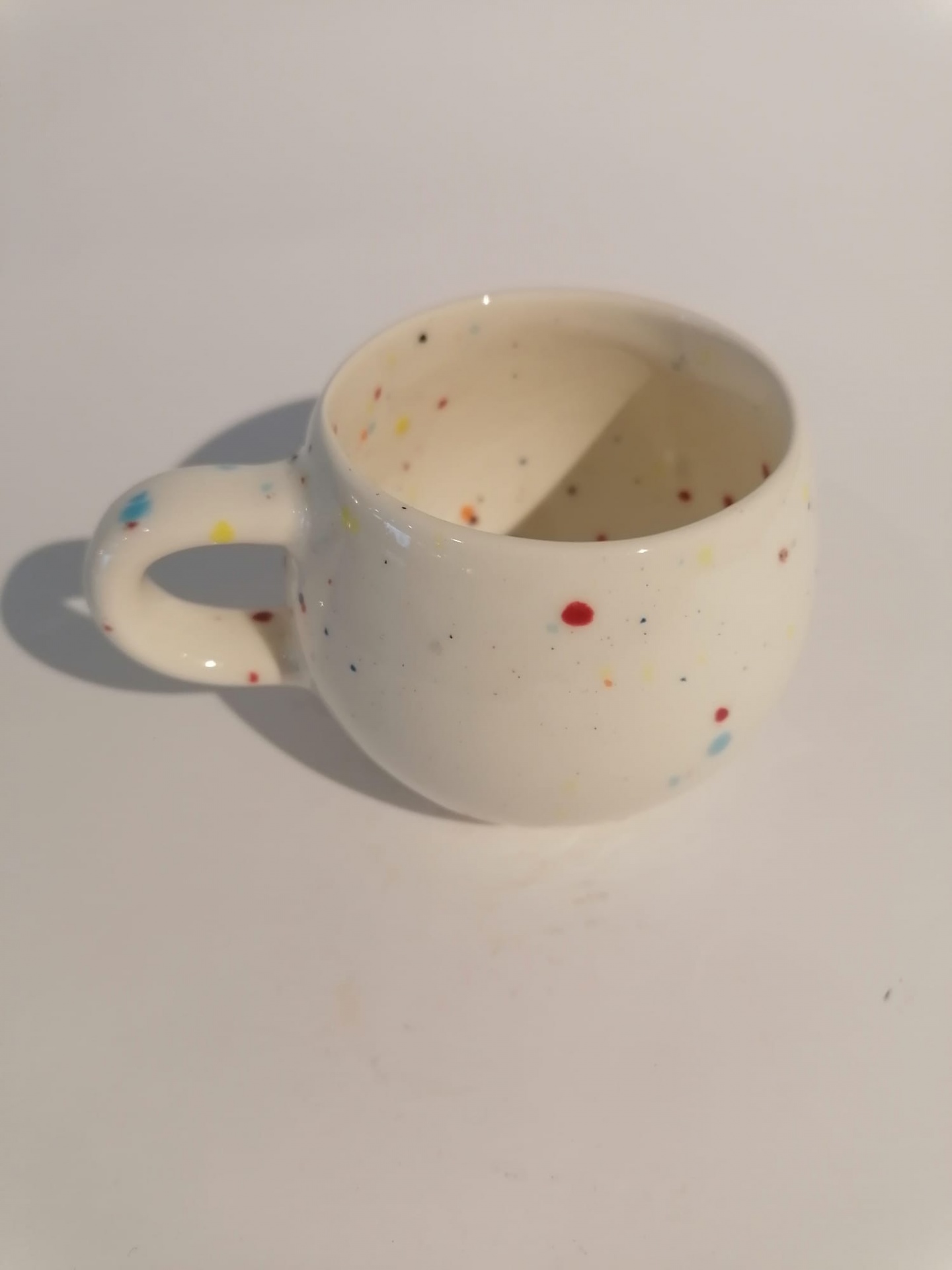 • Caneca branca com pontos coloridos e asa arredondada