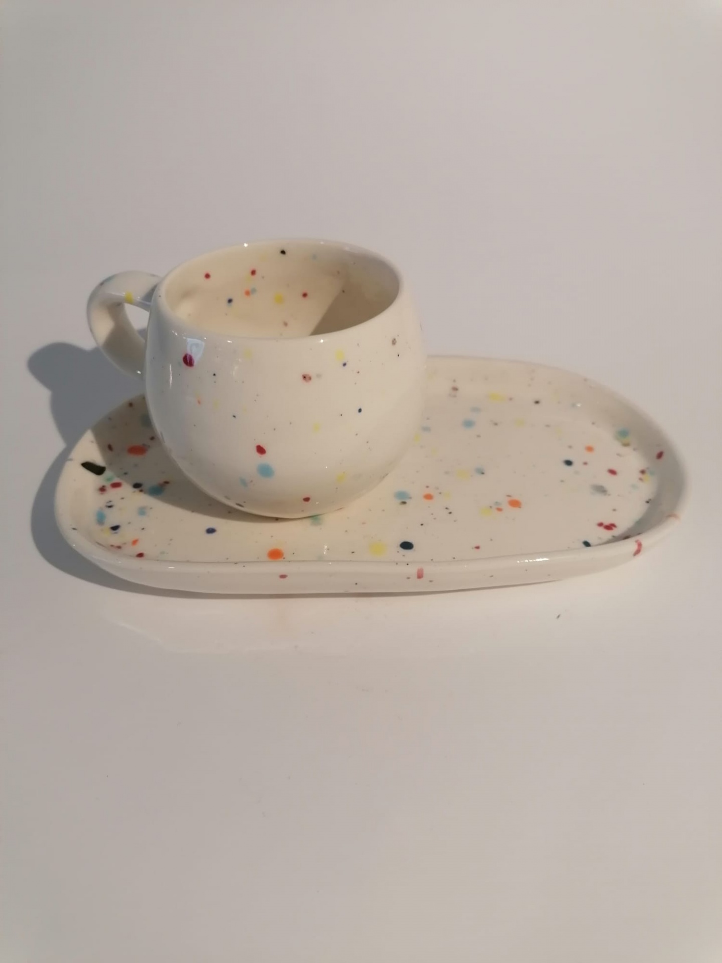 • Conjunto de chávena e prato de cerâmica branca com manchas coloridas