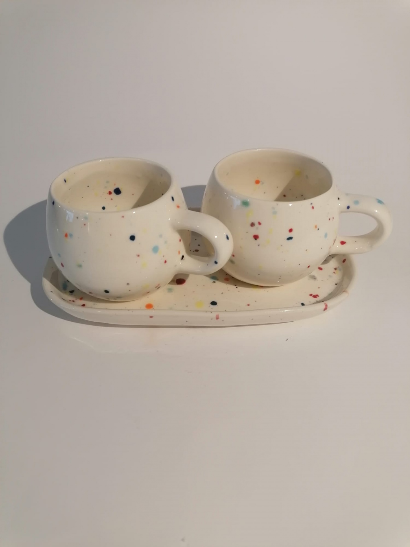 • Conjunto de duas chávenas de cerâmica com manchas coloridas e pequeno prato oval