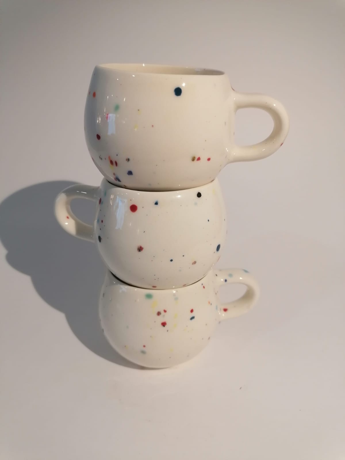 • Três canecas brancas com pintas coloridas empilhadas
