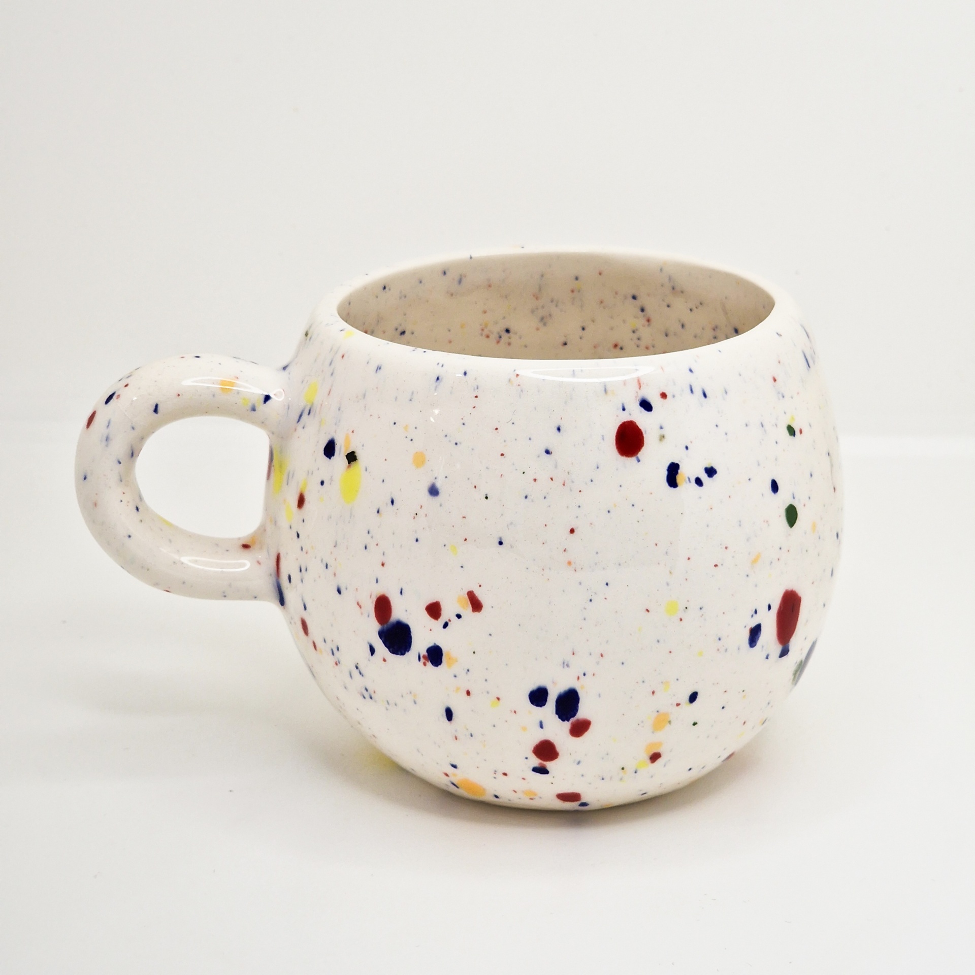 • Caneca de cerâmica branca com pintas coloridas e asa circular