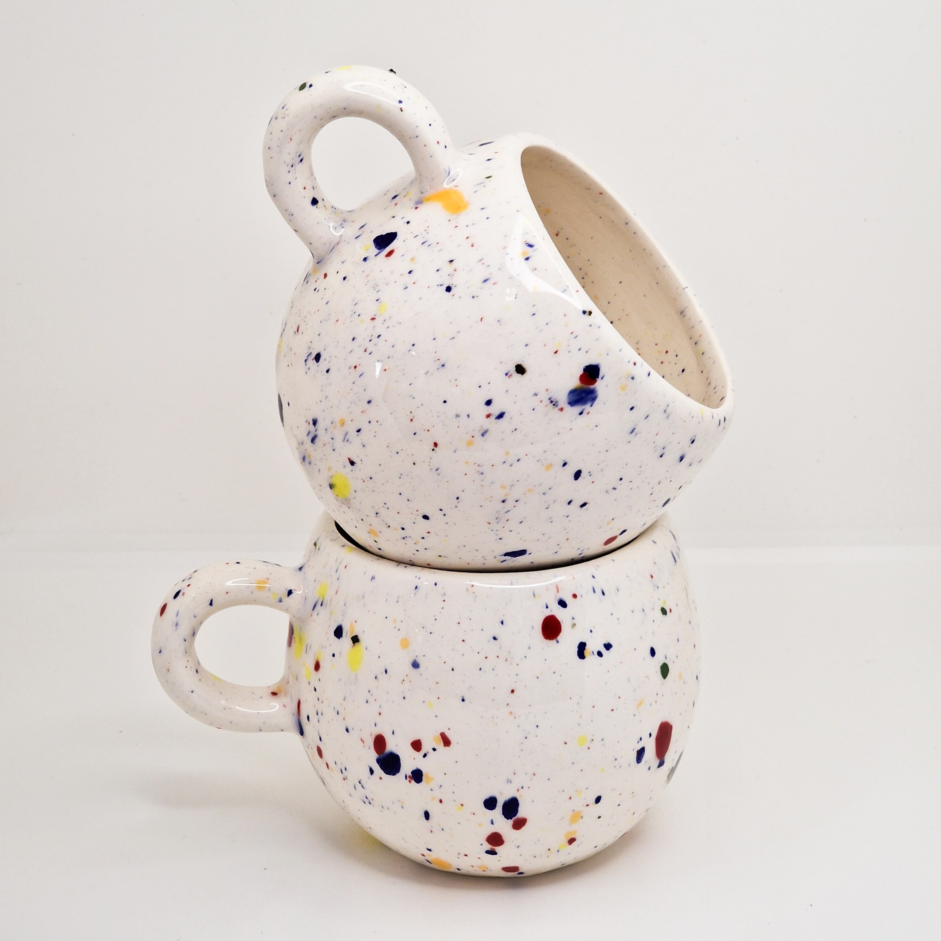 • Duas canecas cerâmicas brancas com manchas coloridas empilhadas