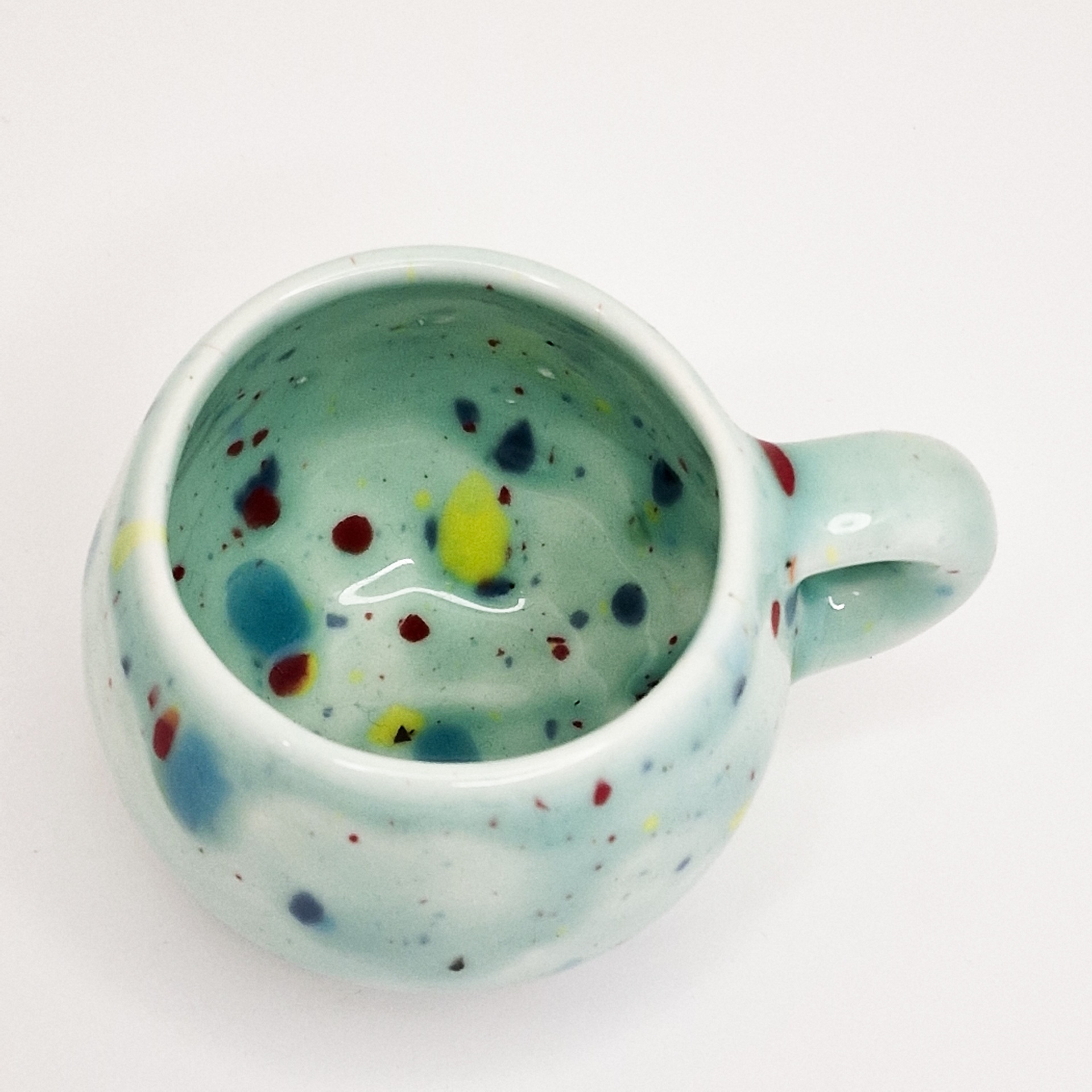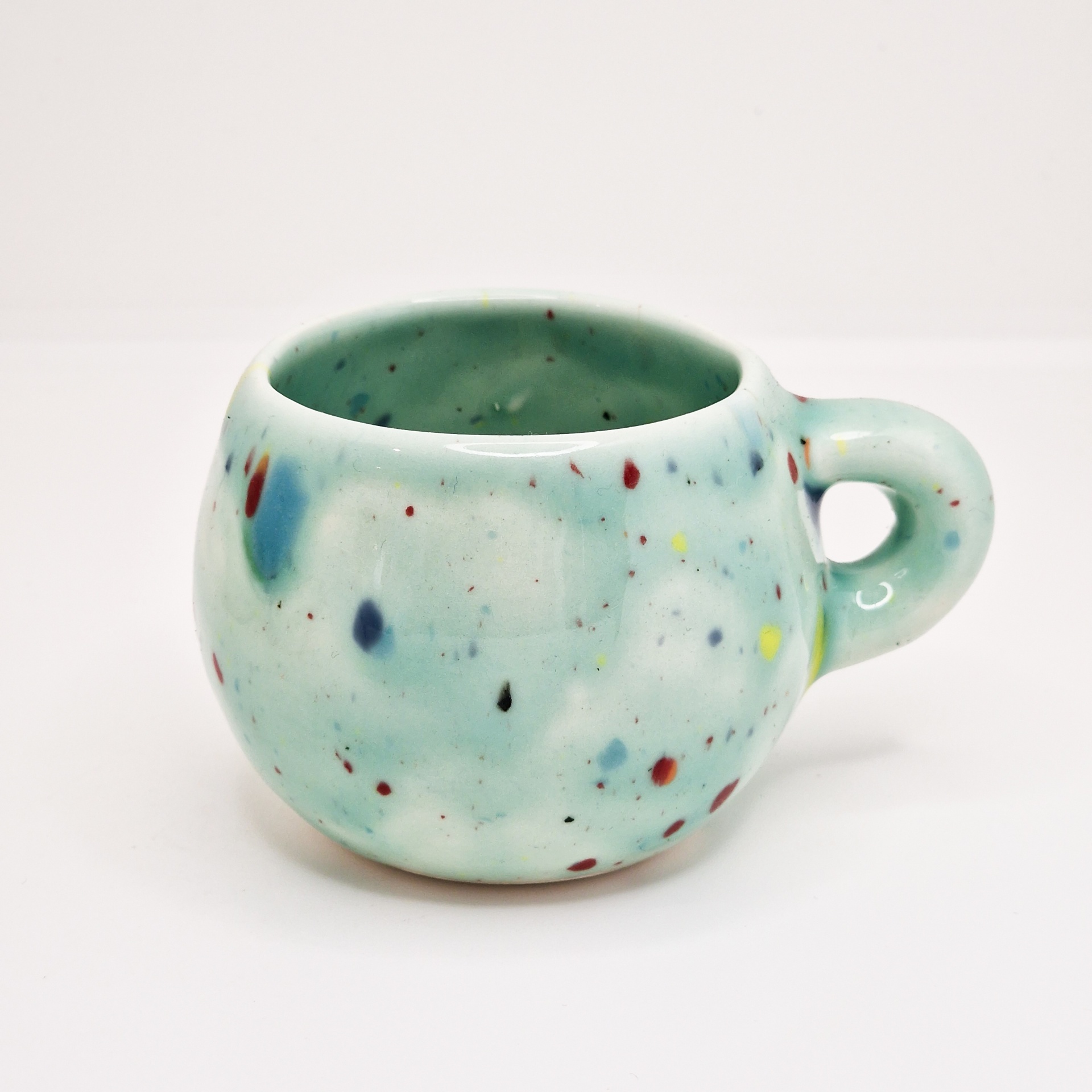 • Caneca de cerâmica verde claro com pontinhos coloridos e pega arredondada
