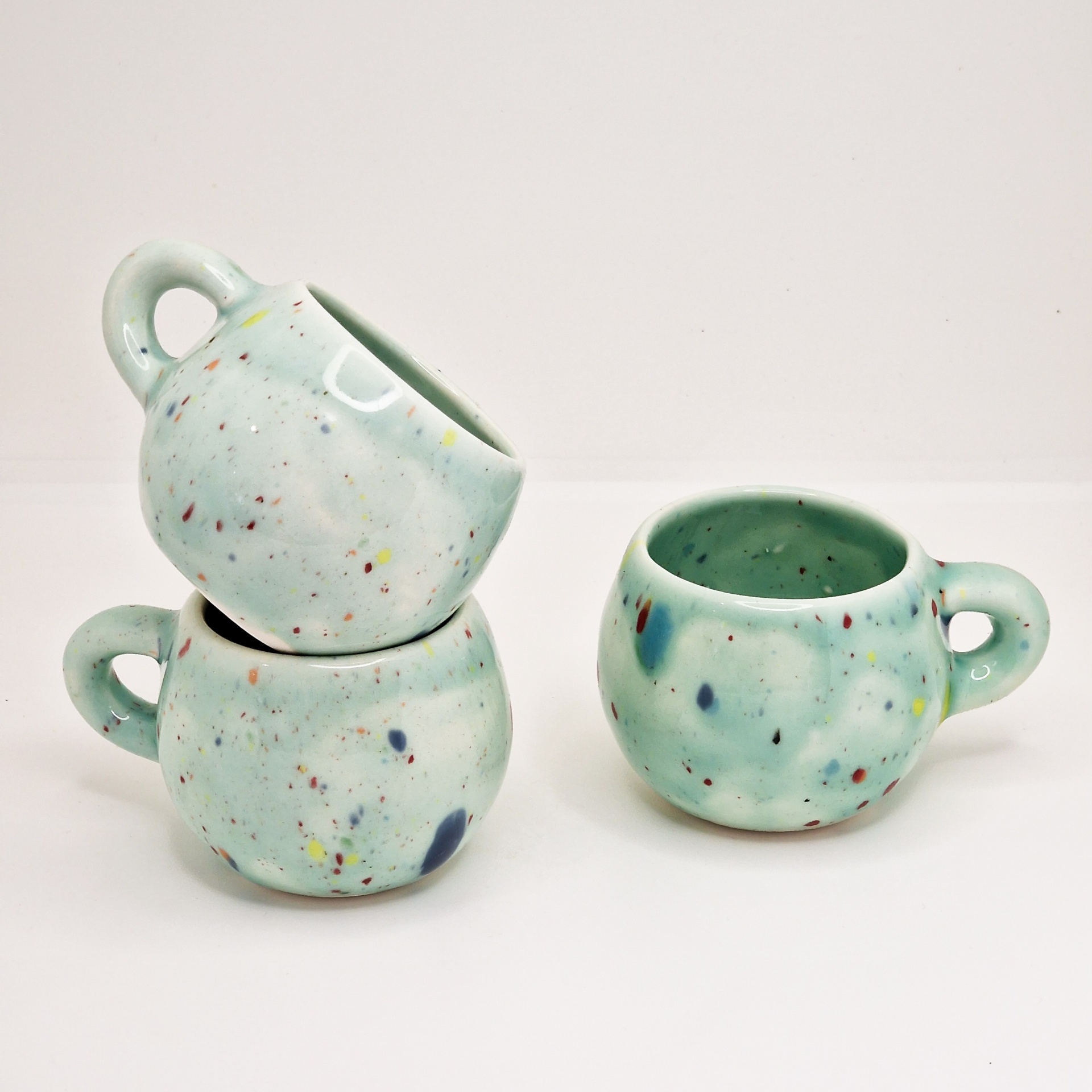 • Conjunto de três chávenas de cerâmica verde claro com salpicos coloridos