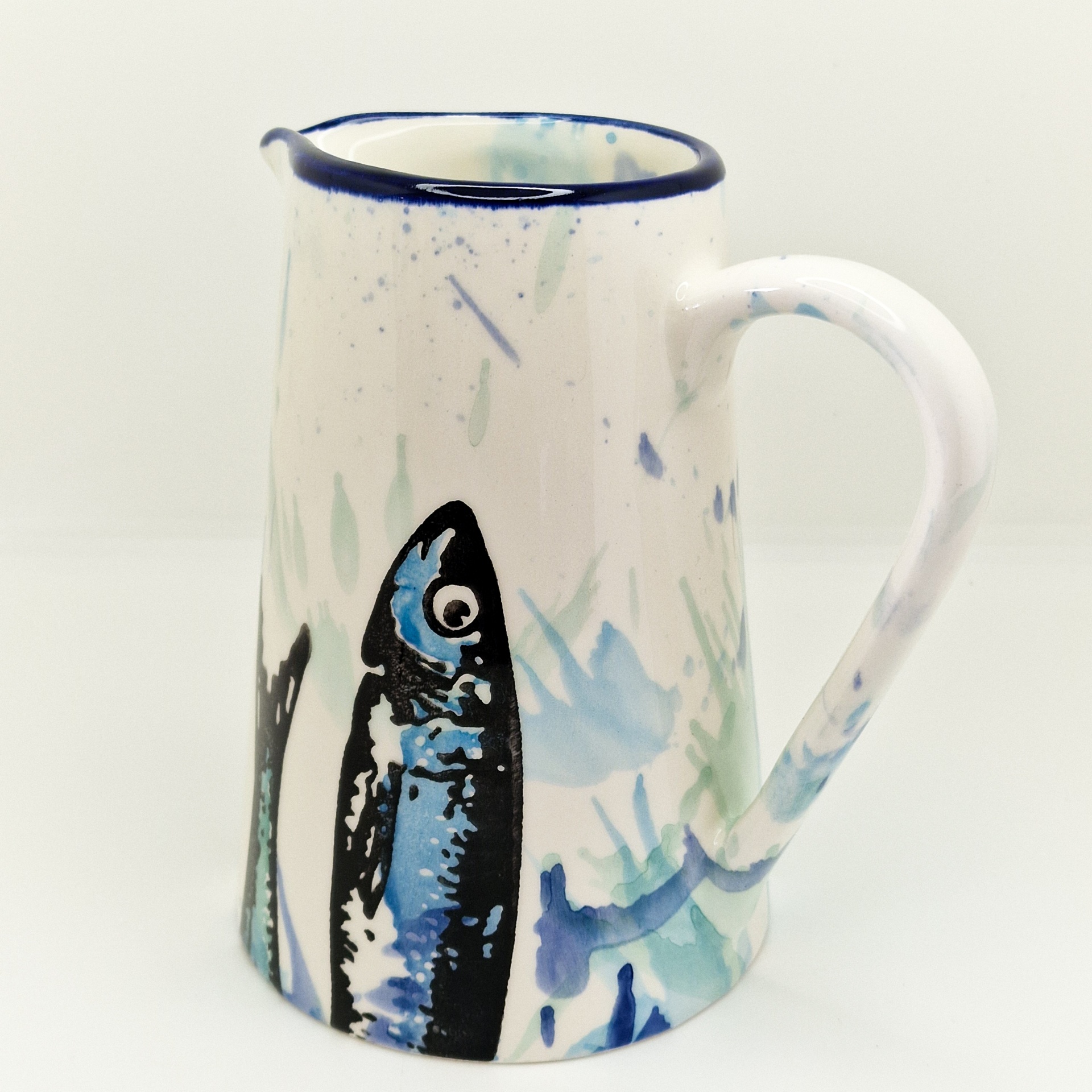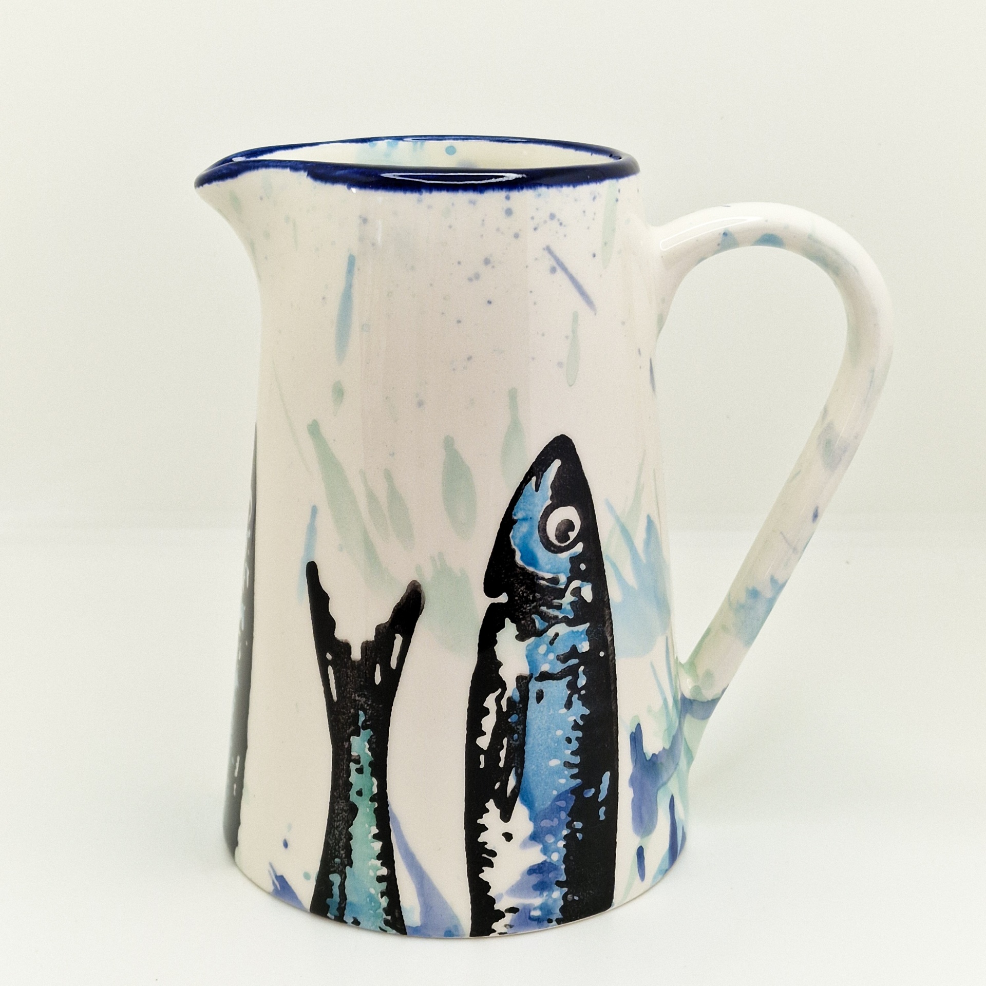 • Jarro de cerâmica branco com padrão de peixes azuis e pretos