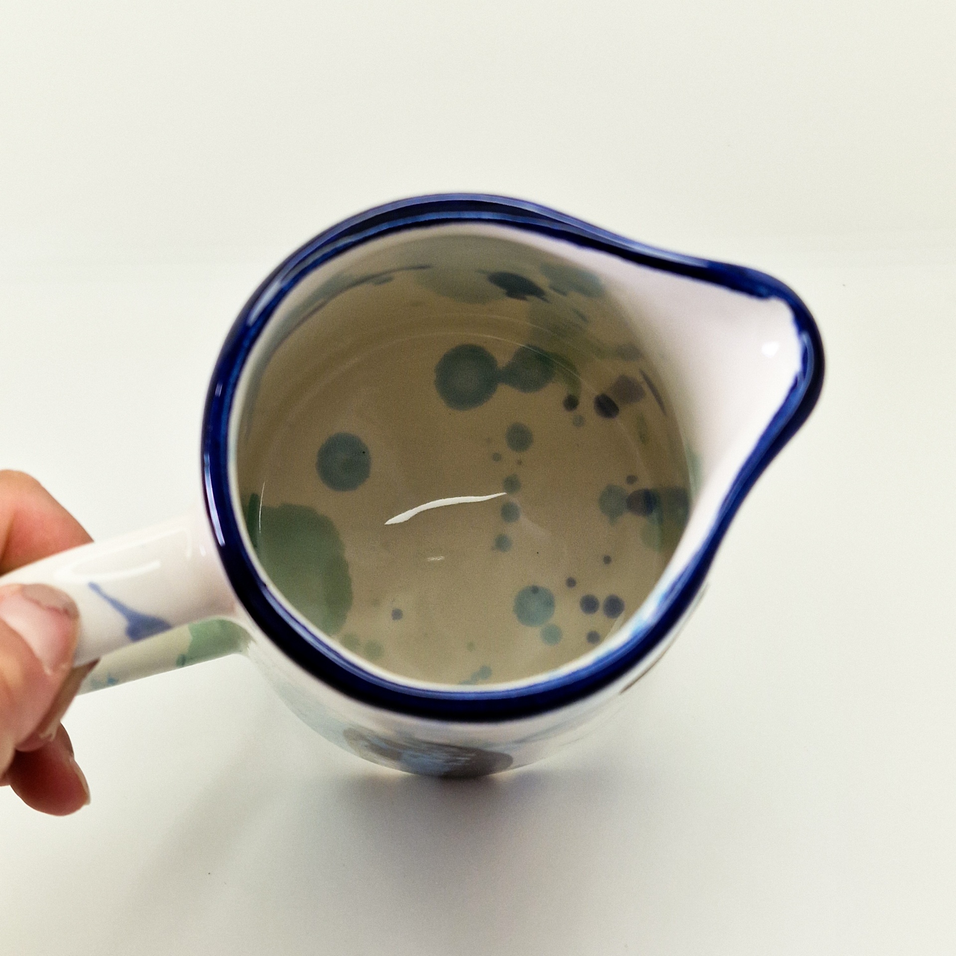 • Jarra de cerâmica branca com interior azul e padrão decorativo
