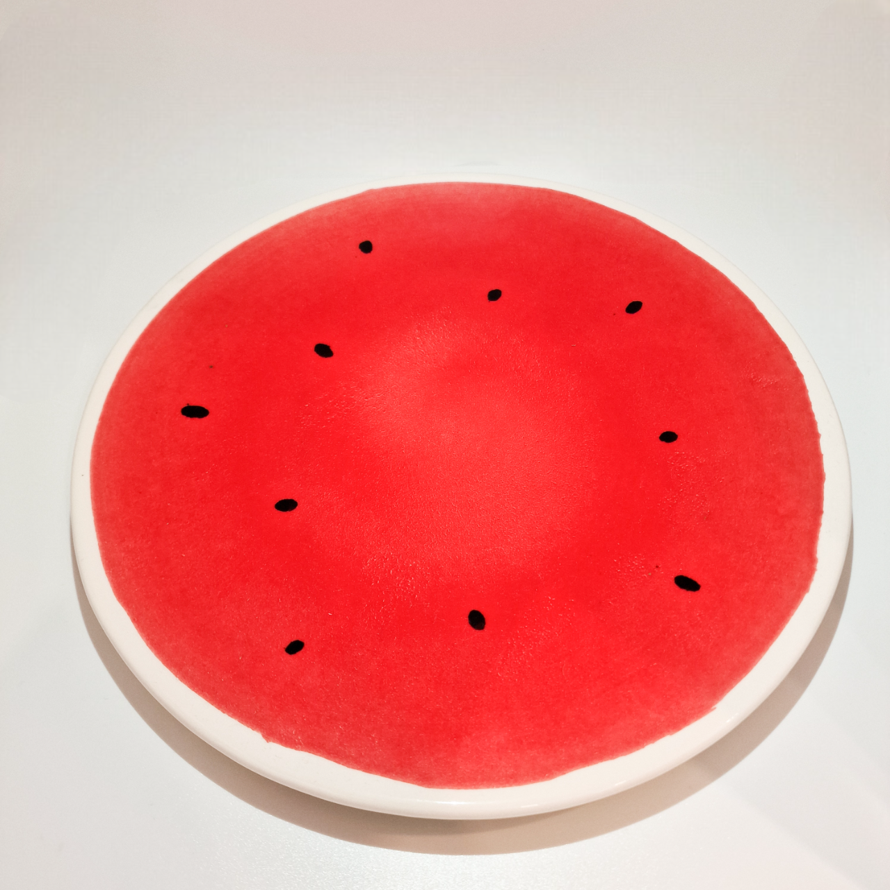 • Prato redondo vermelho com pontinhos pretos e bordo branco, imitação de melancia.