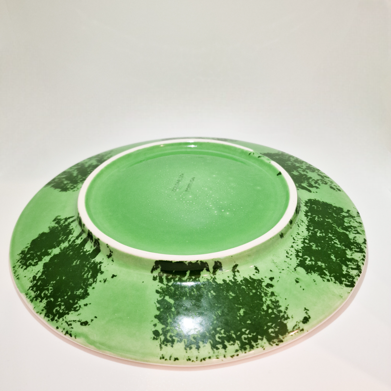 • Prato de cerâmica verde com padrão verde escuro, visto de baixo