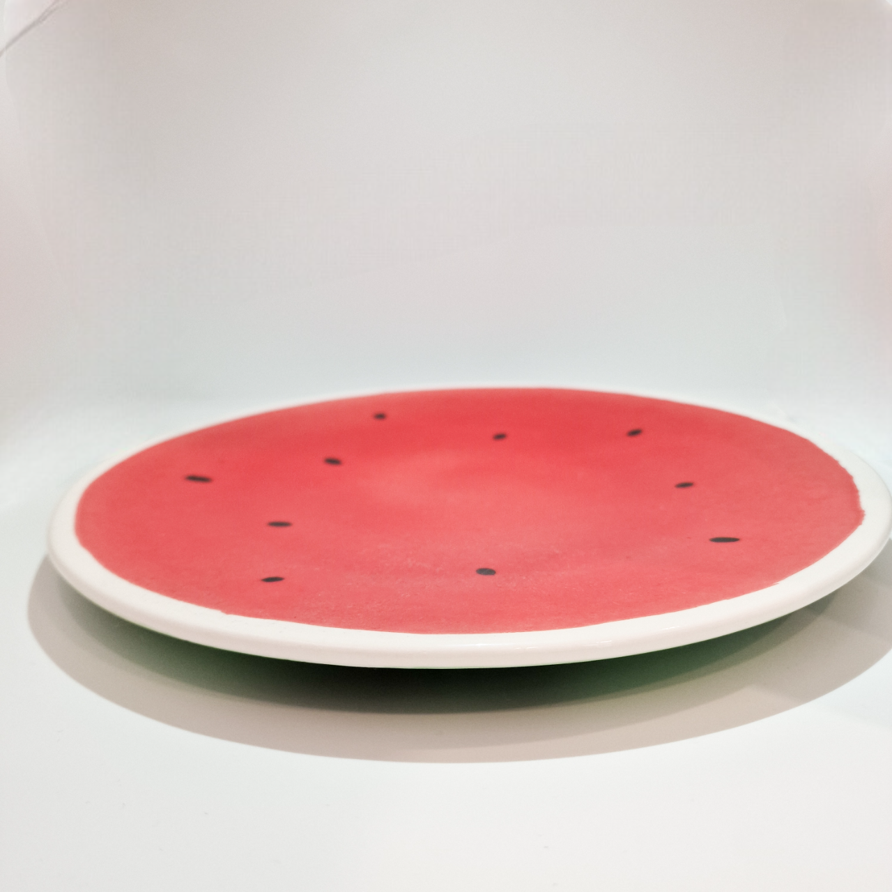 Pratos feitos em cerâmica com vidrado inspirado em melância, perfeito para servir refeições em qualquer ocasião, desde jantares formais até encontros descontraídos.