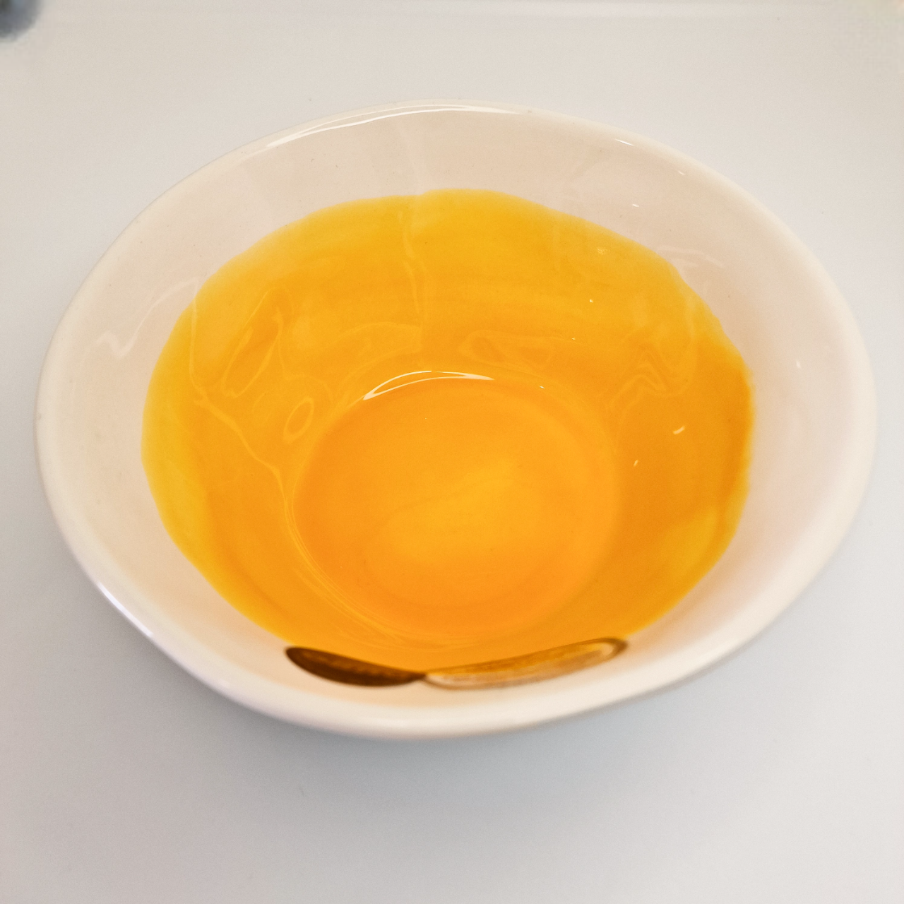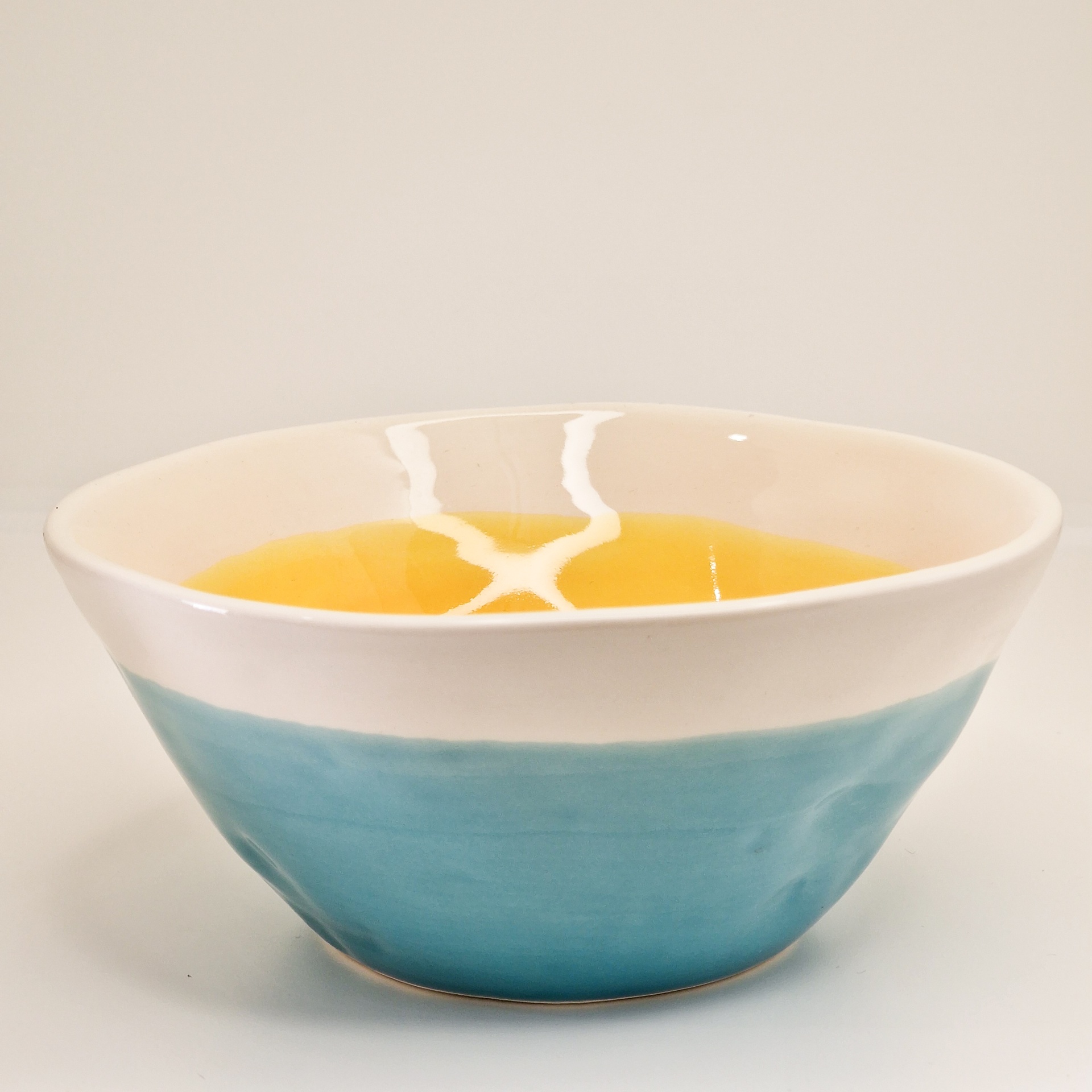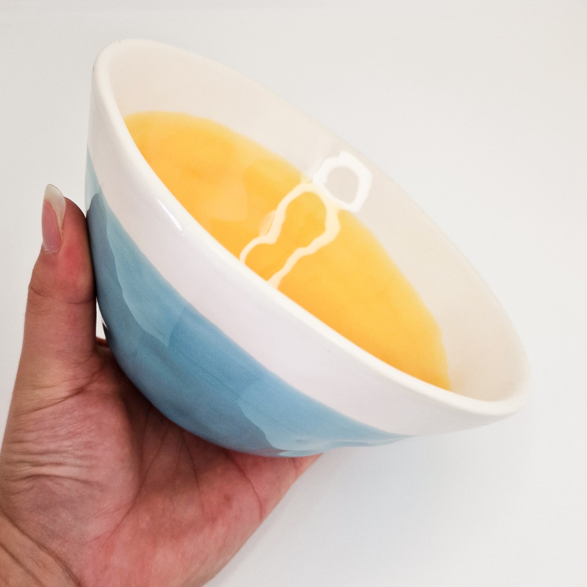 • Taça cerâmica azul com interior branco contendo líquido amarelo