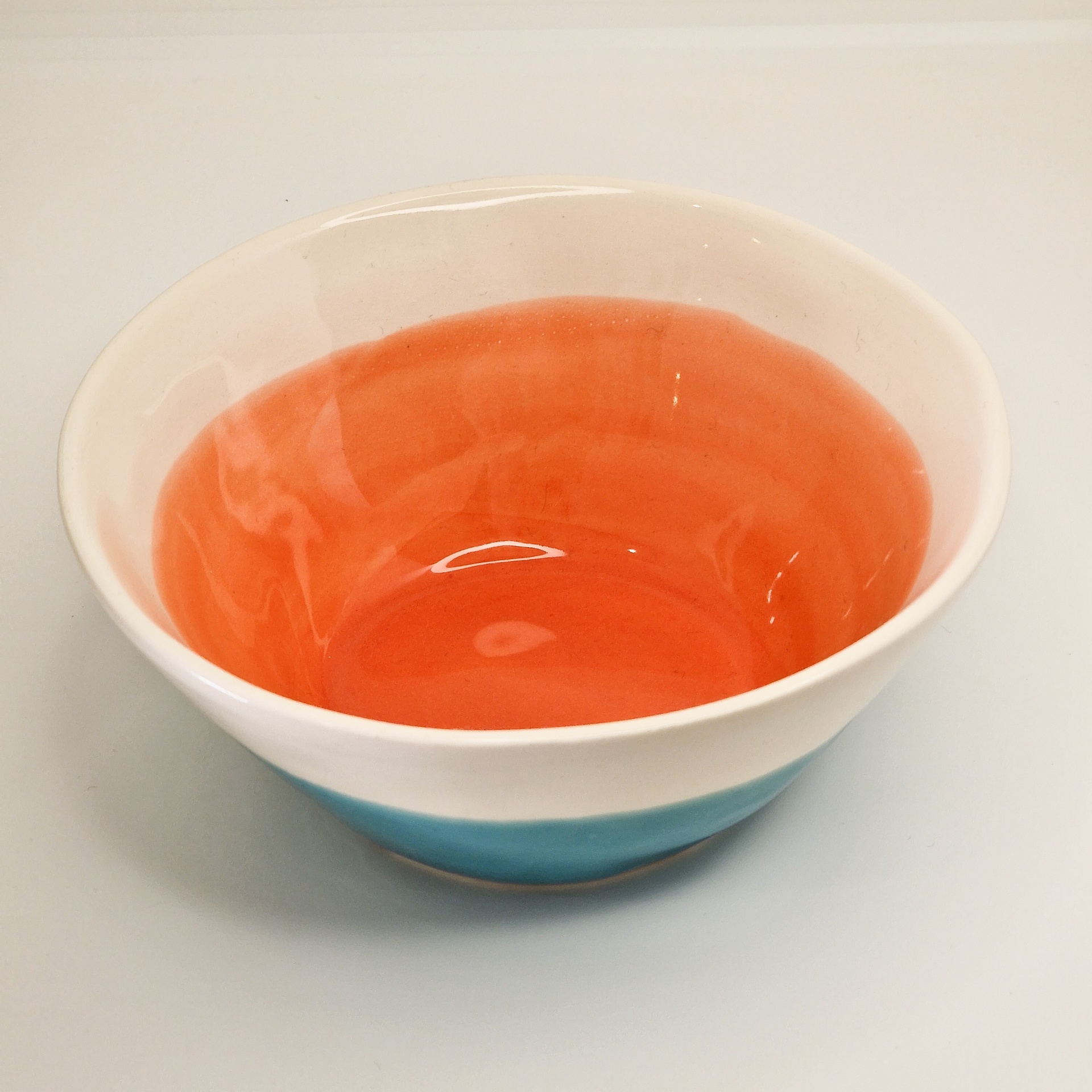 • Tigela cerâmica tricolor com interior laranja, exterior branco e azul.