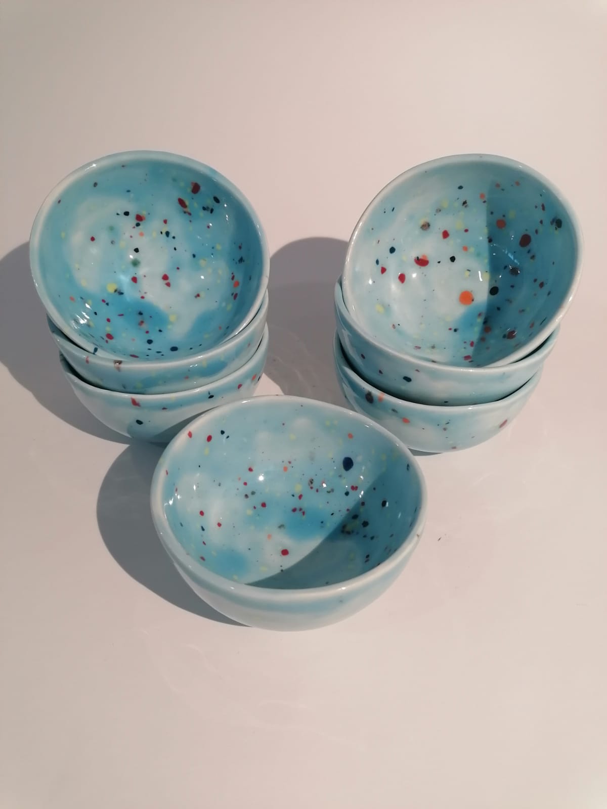 • Seis tigelas cerâmicas azuis claras com manchas coloridas, empilhadas e dispostas sobre superfície branca.
