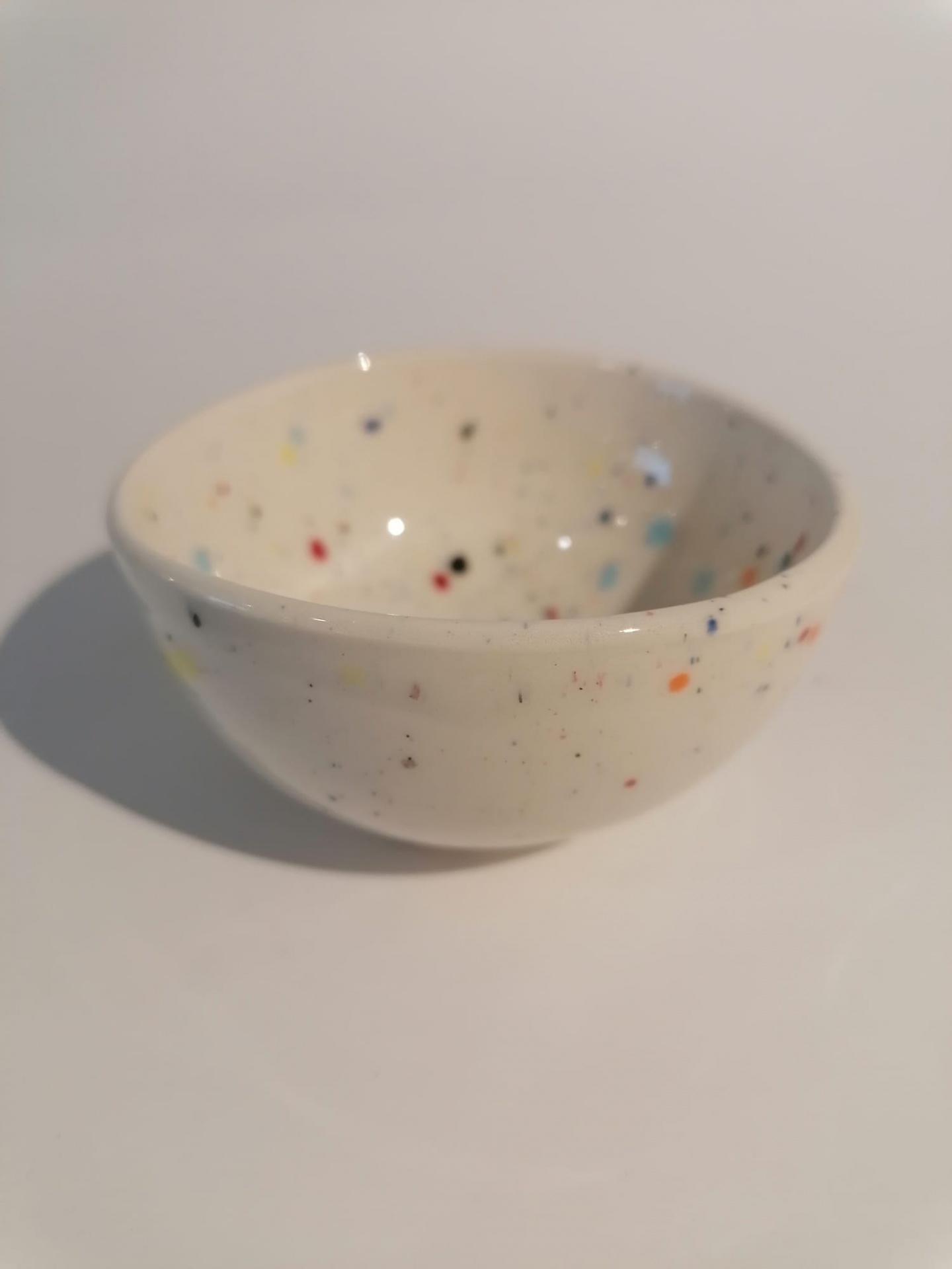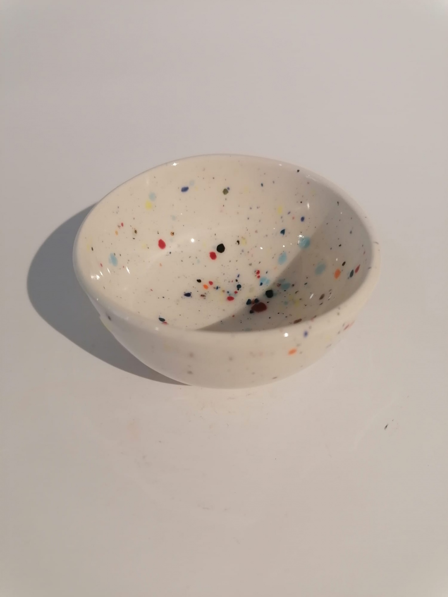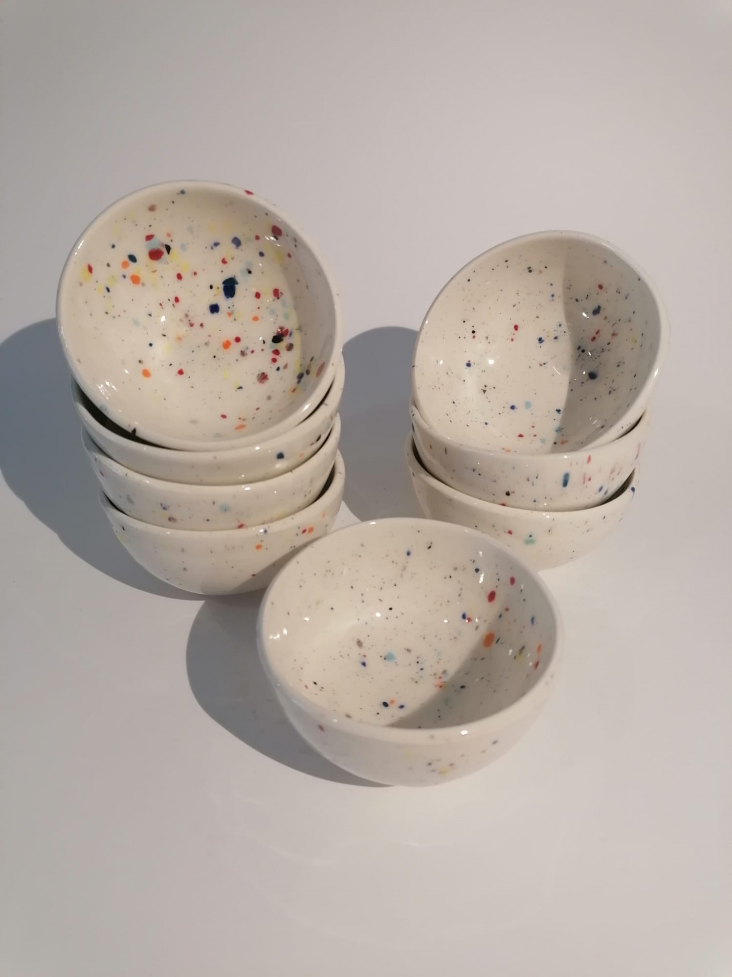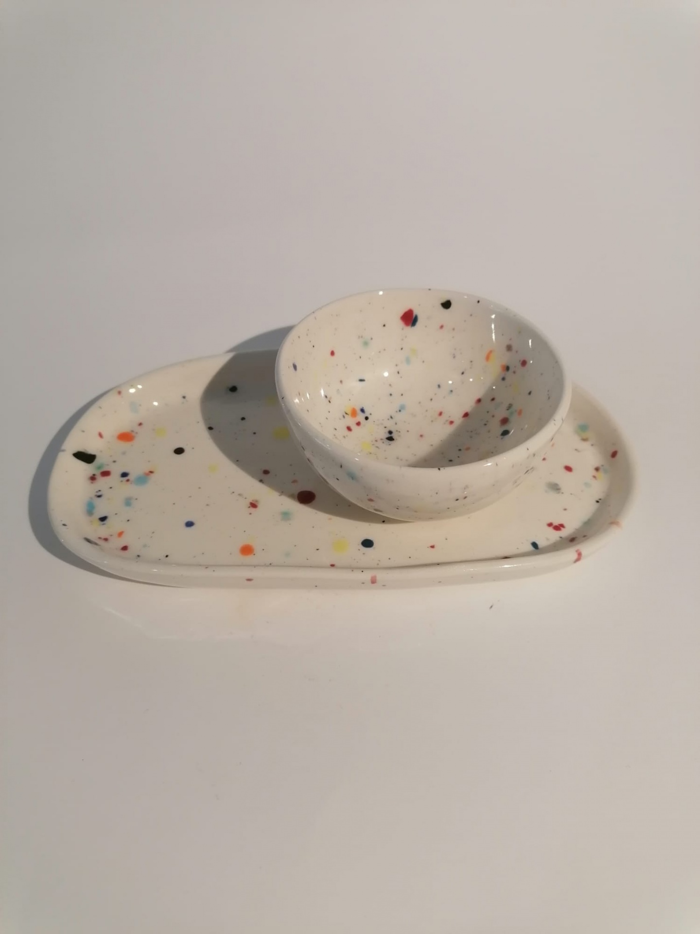 • Conjunto de tigelas e prato de cerâmica branca com padrão salpicado colorido
