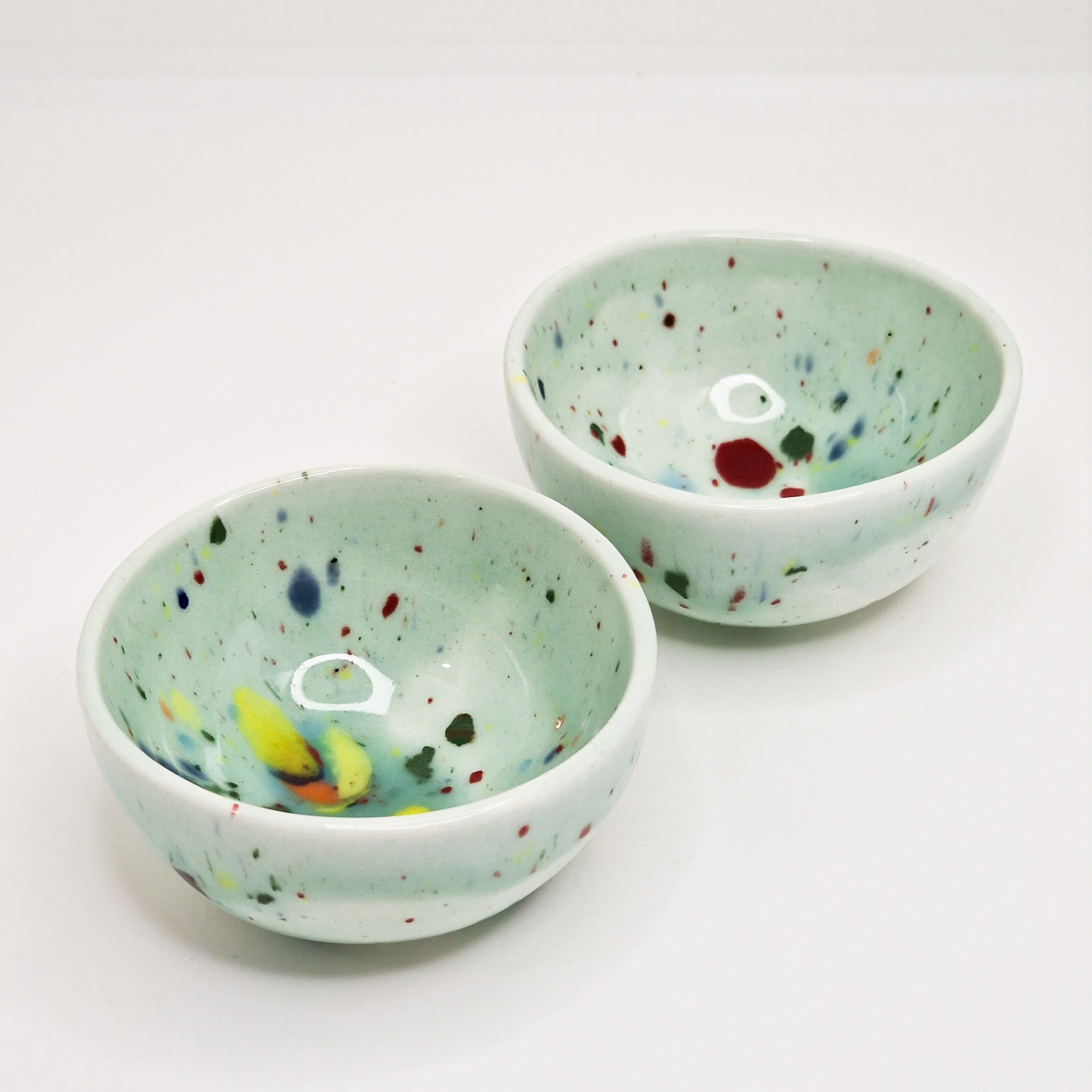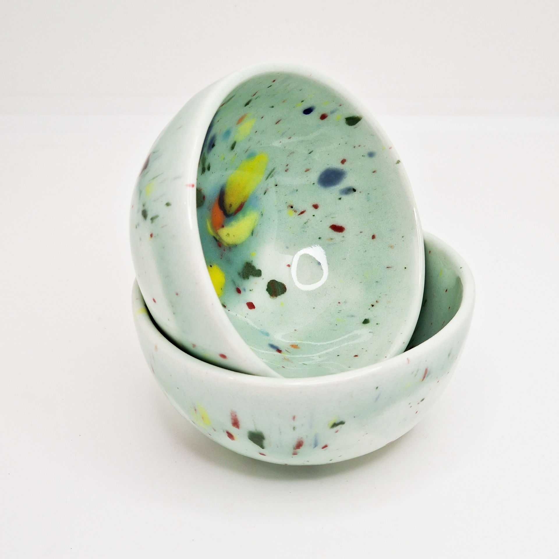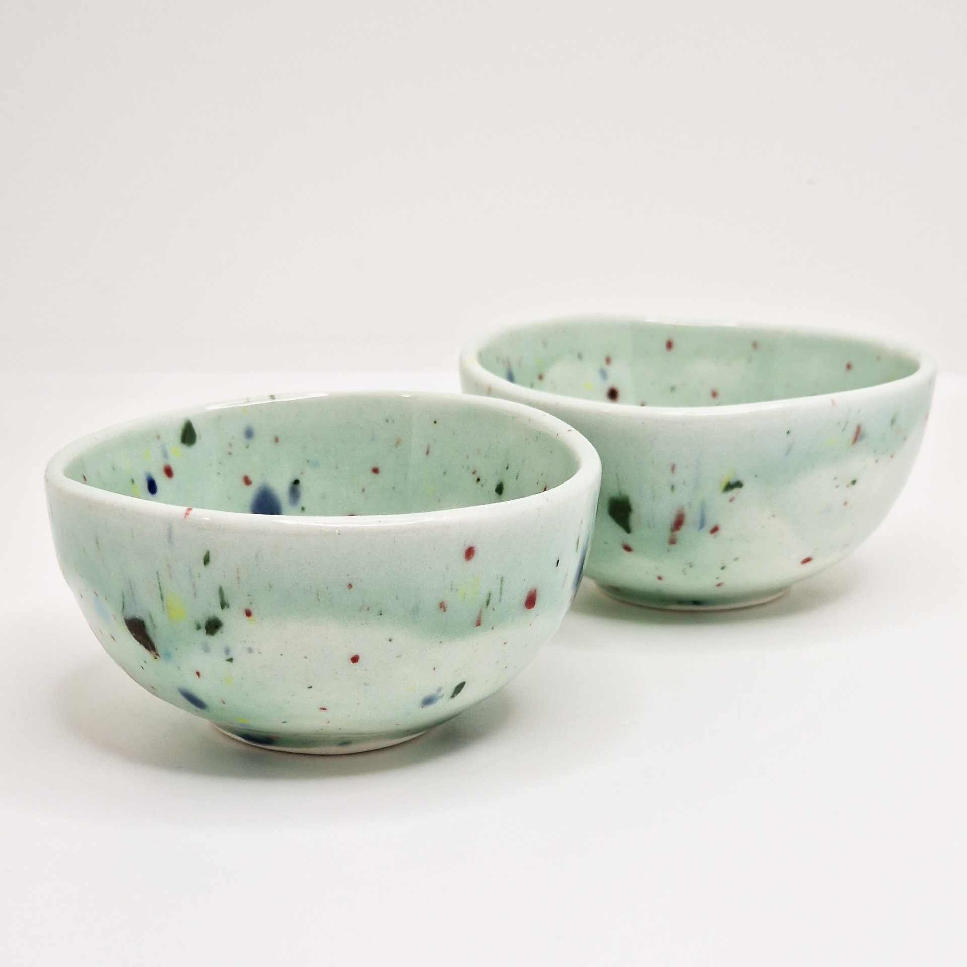 • Duas tigelas de cerâmica verde claro com manchas coloridas sobre fundo branco