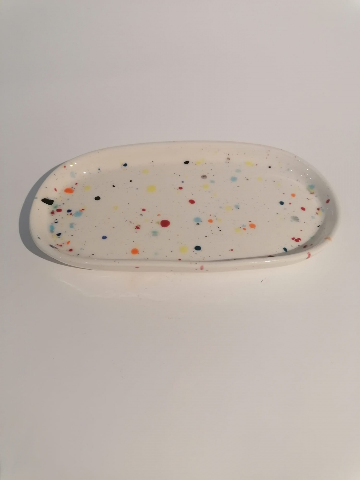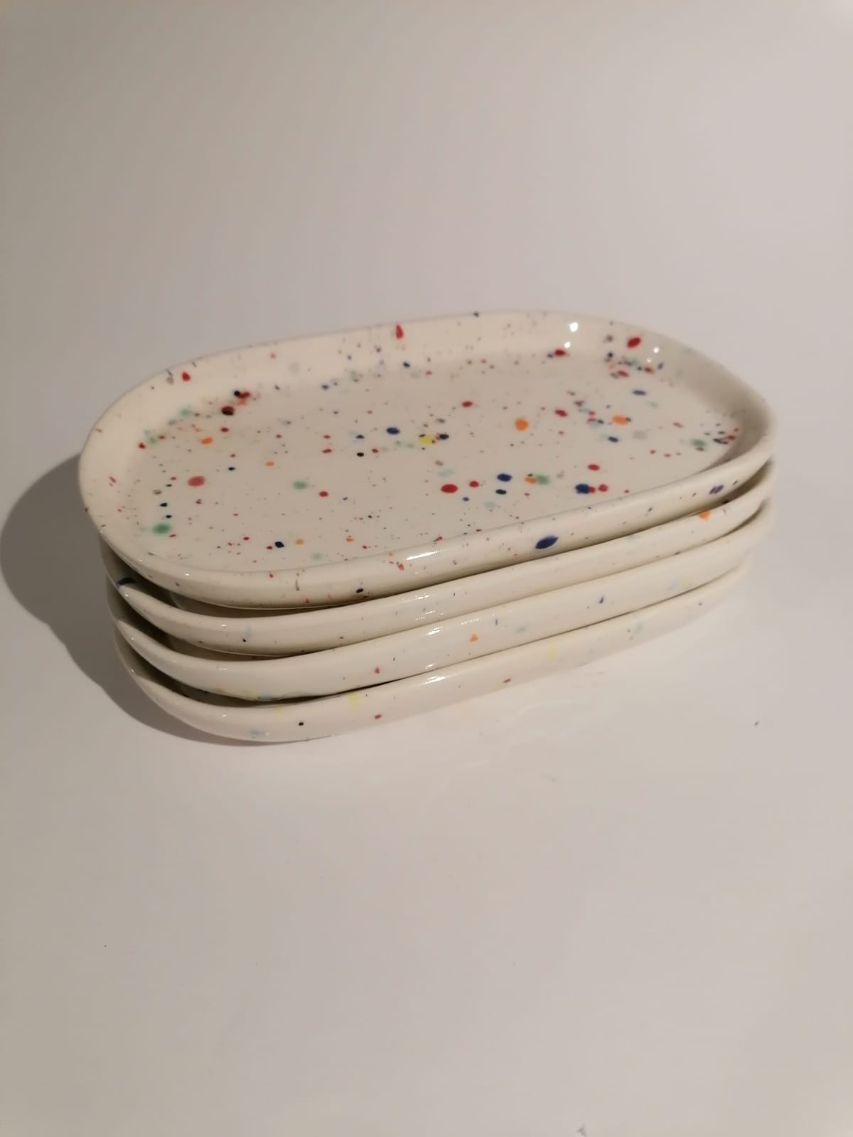 • Quatro pratos ovais brancos com respingos coloridos empilhados