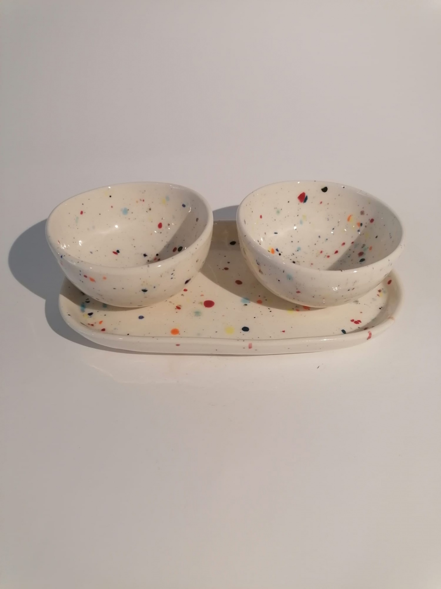 • Conjunto de tigelas e prato de cerâmica branca com padrão salpicado colorido