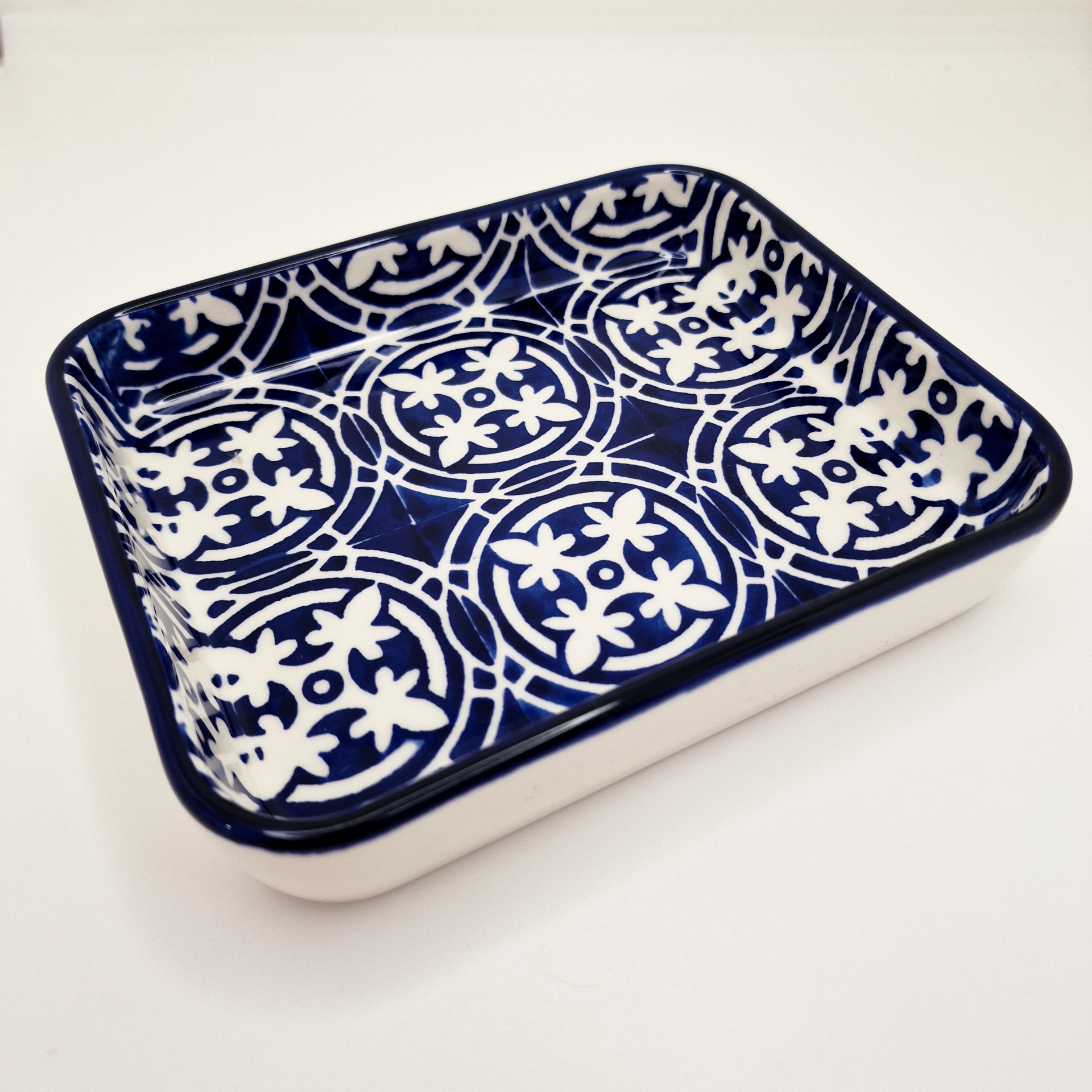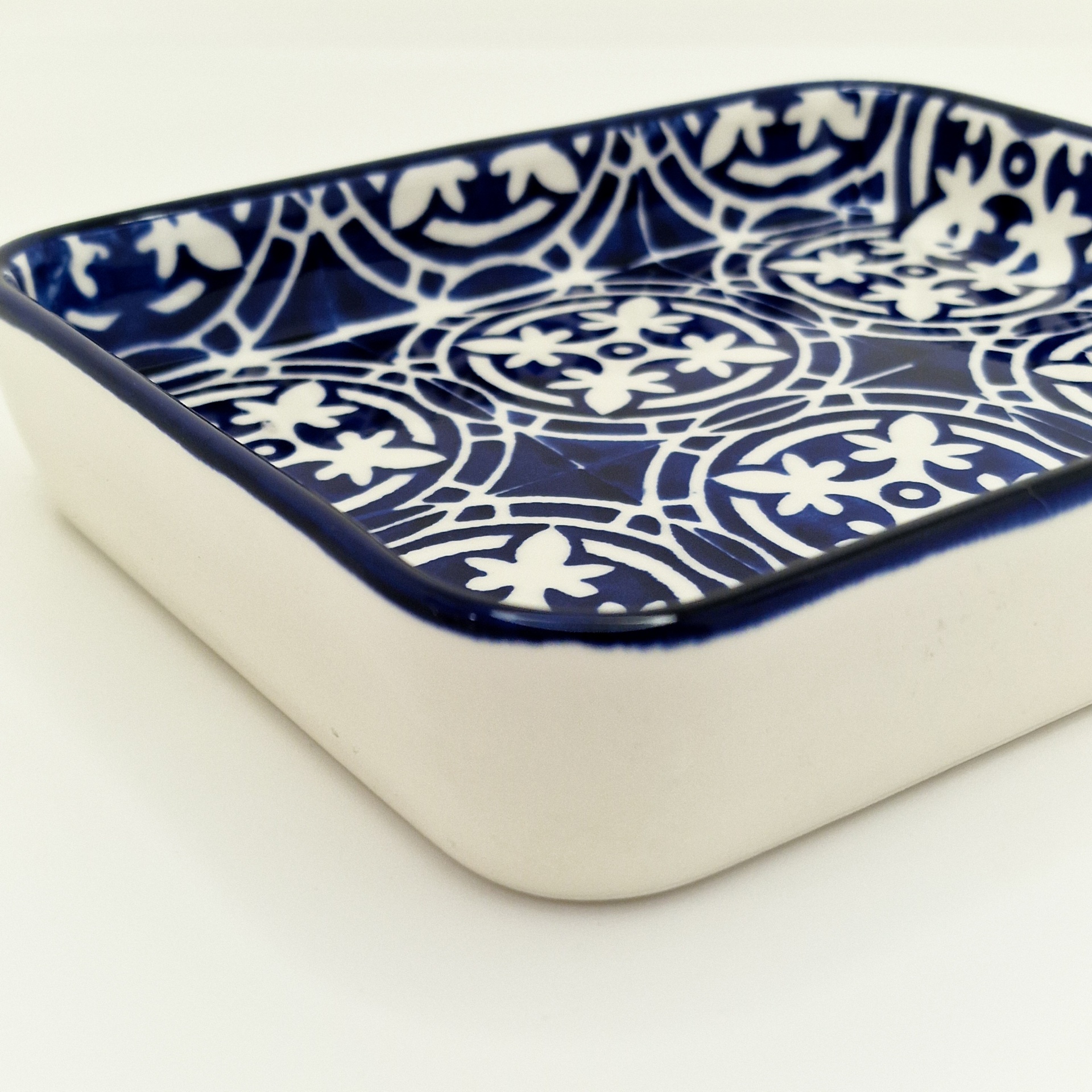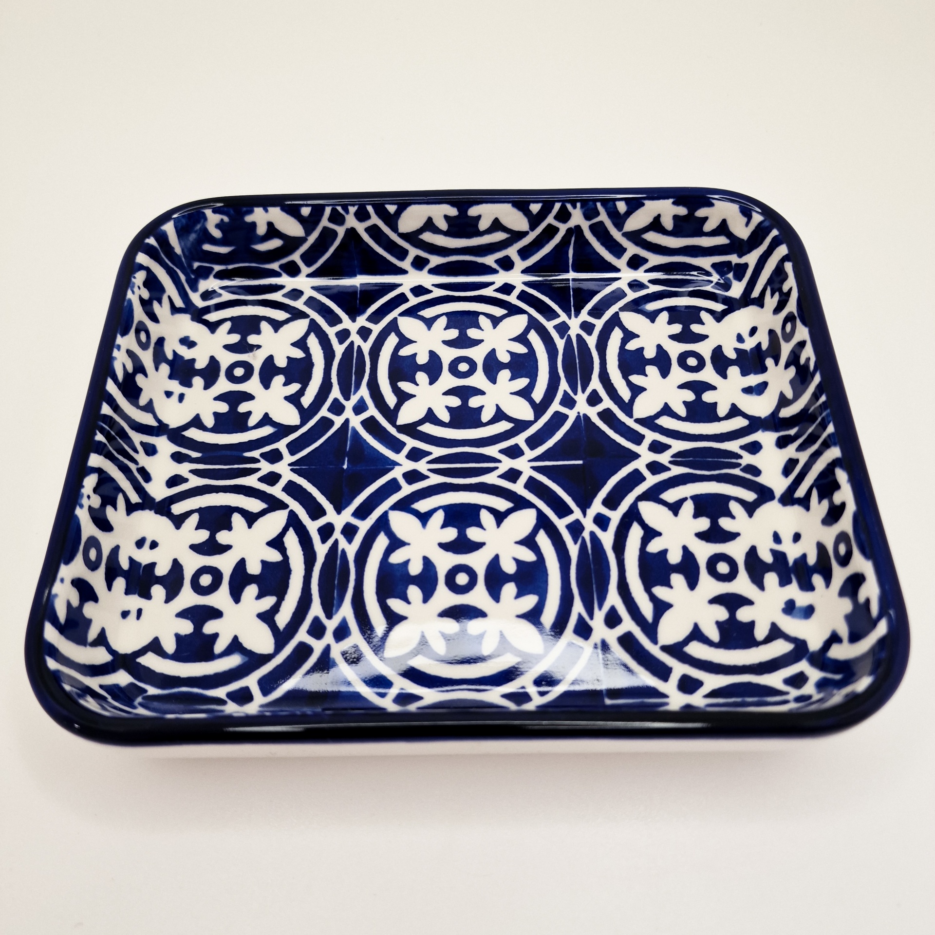 • Travessa quadrada cerâmica azul e branca com padrão floral