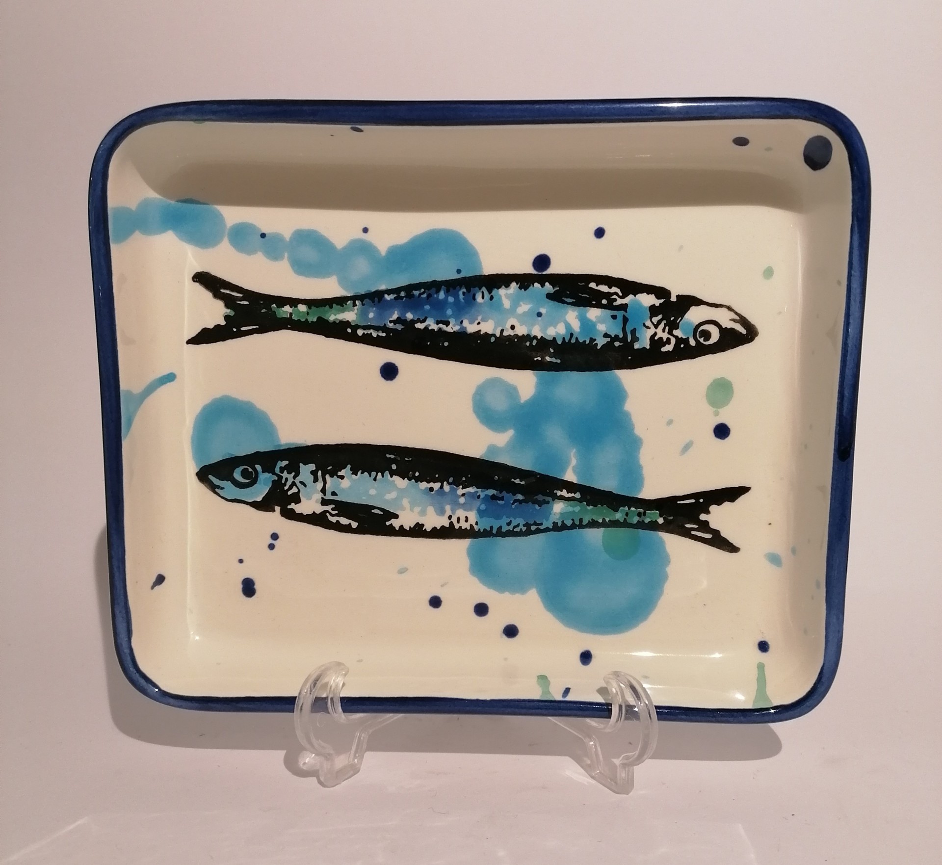 • Tabuleiro cerâmica retangular com desenho de dois peixes sardinha azuis e pretos