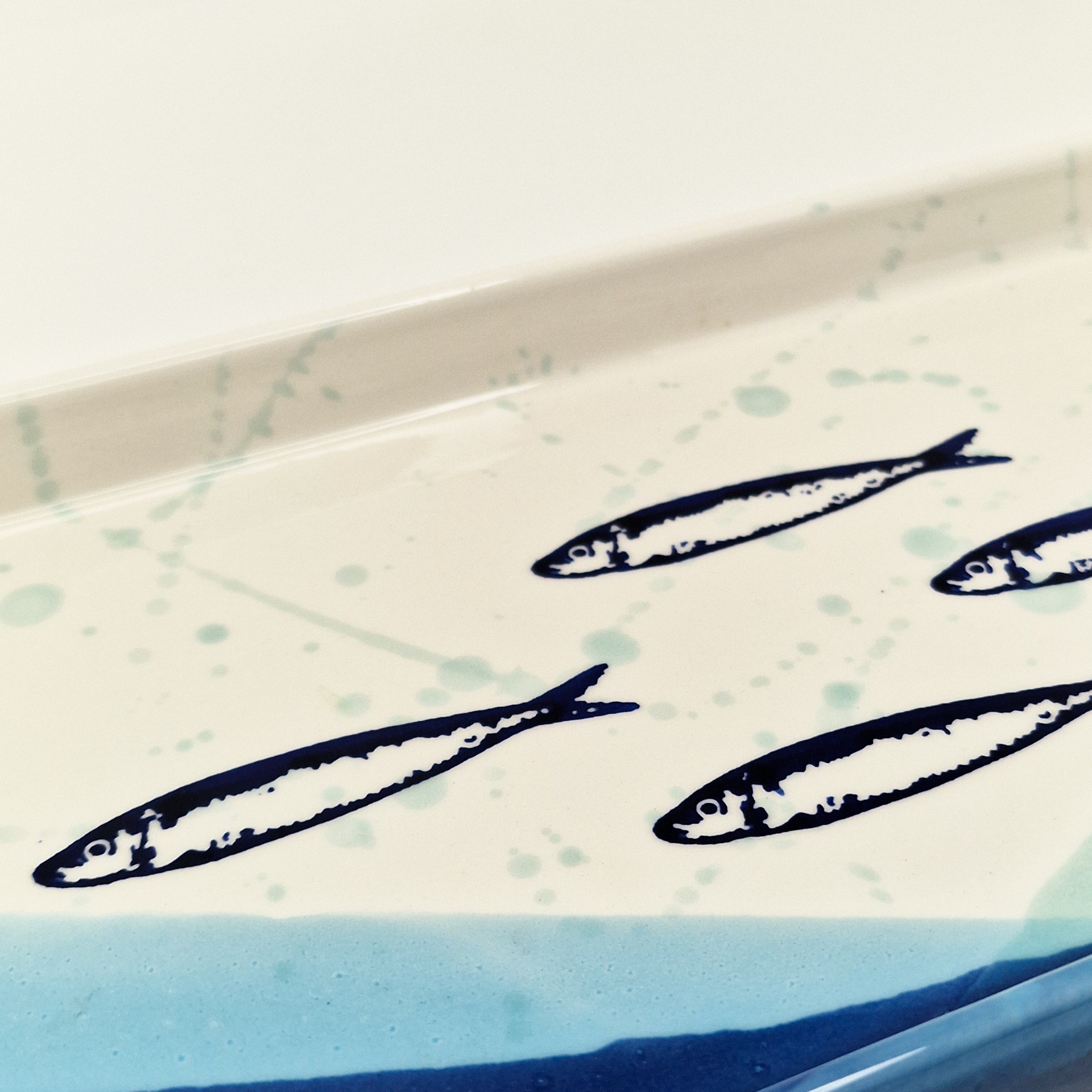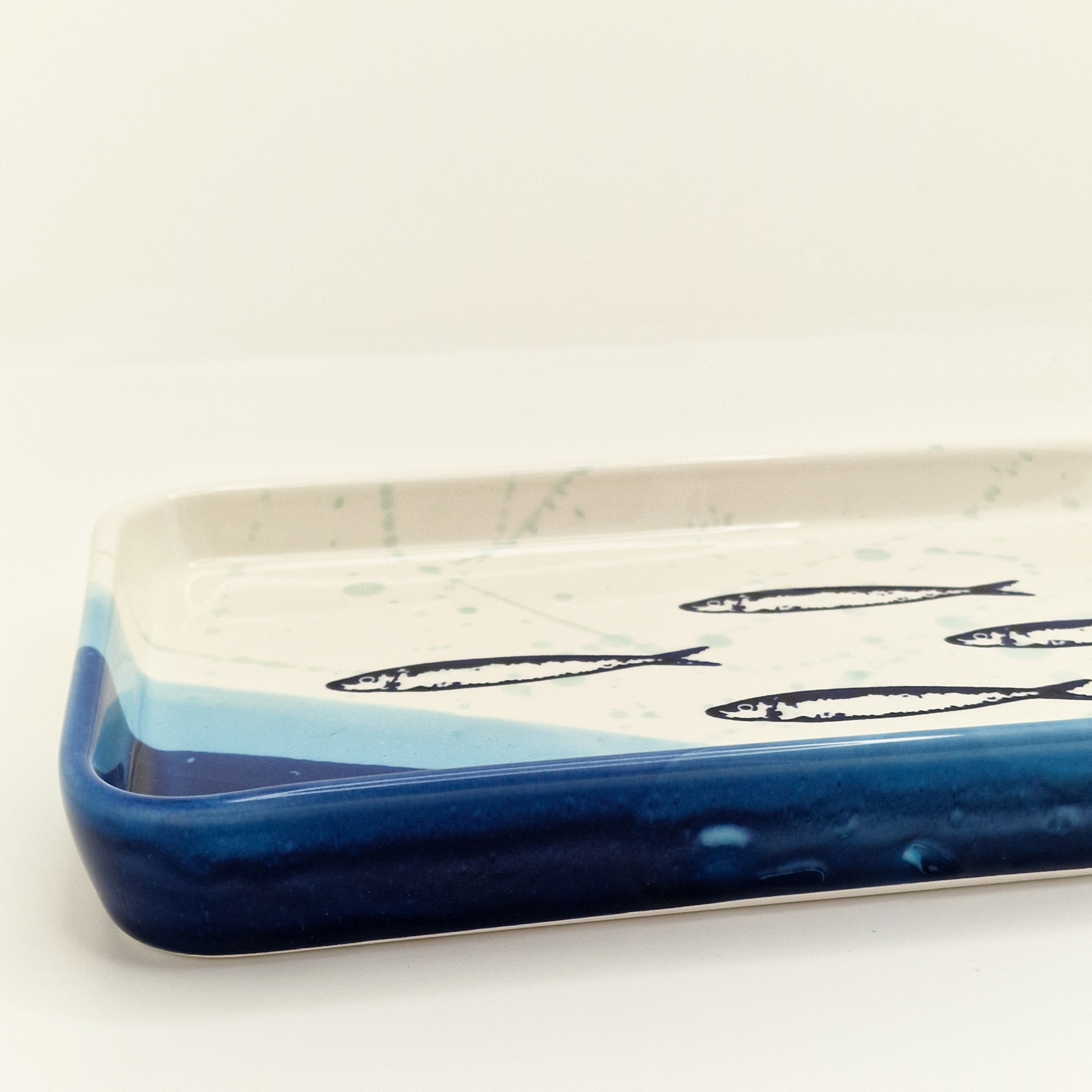 • Prato retangular de cerâmica com estampa de peixes e borda azul.