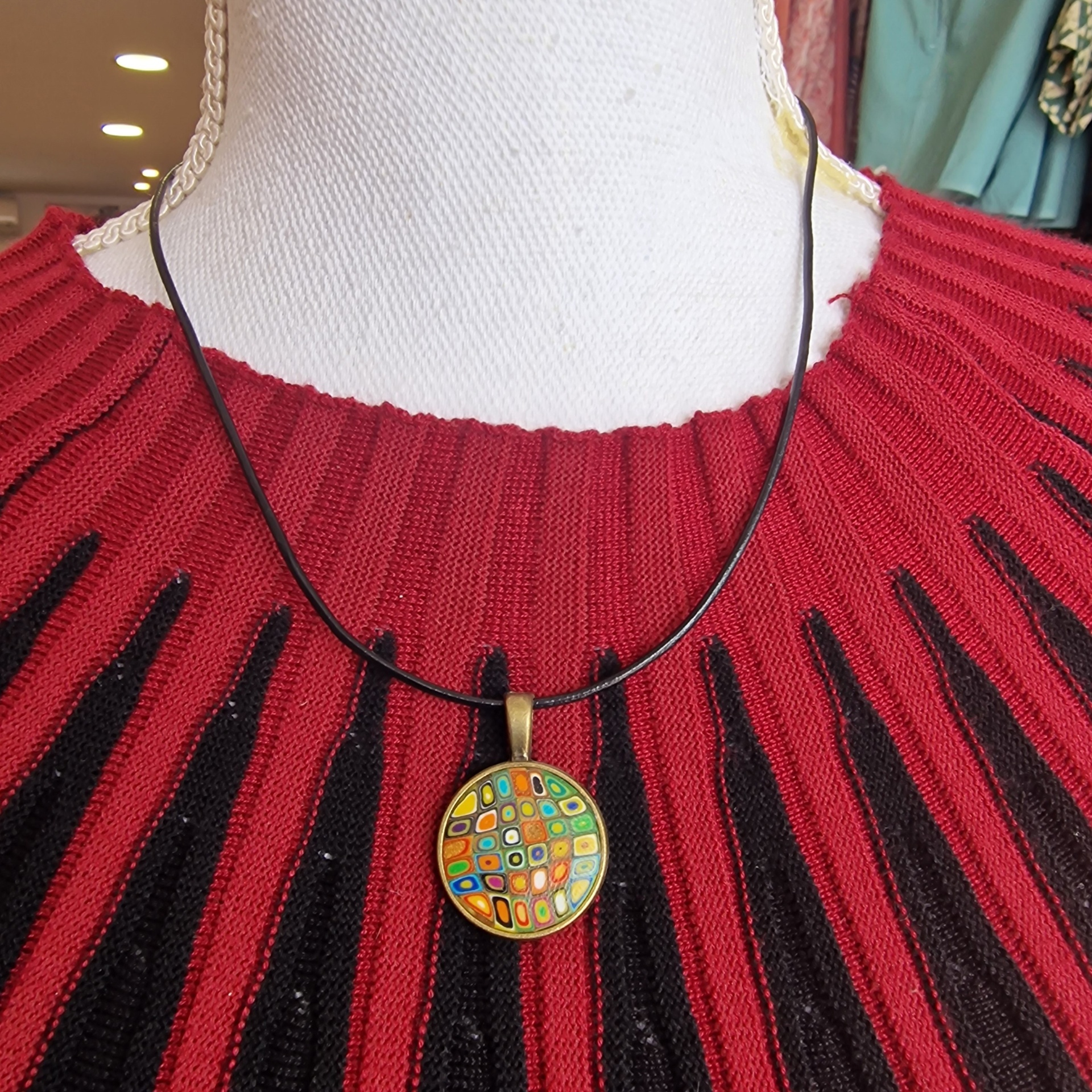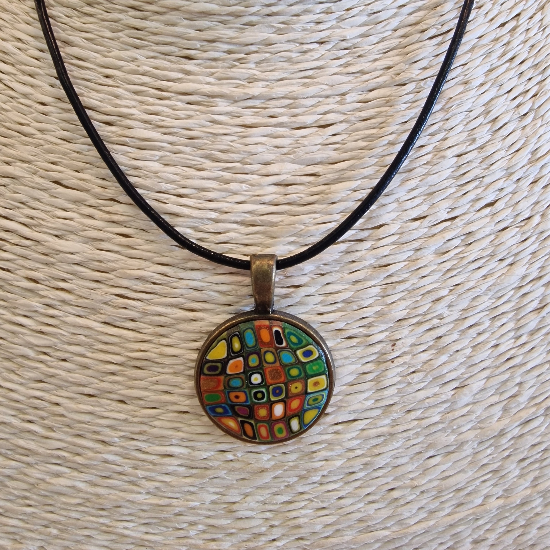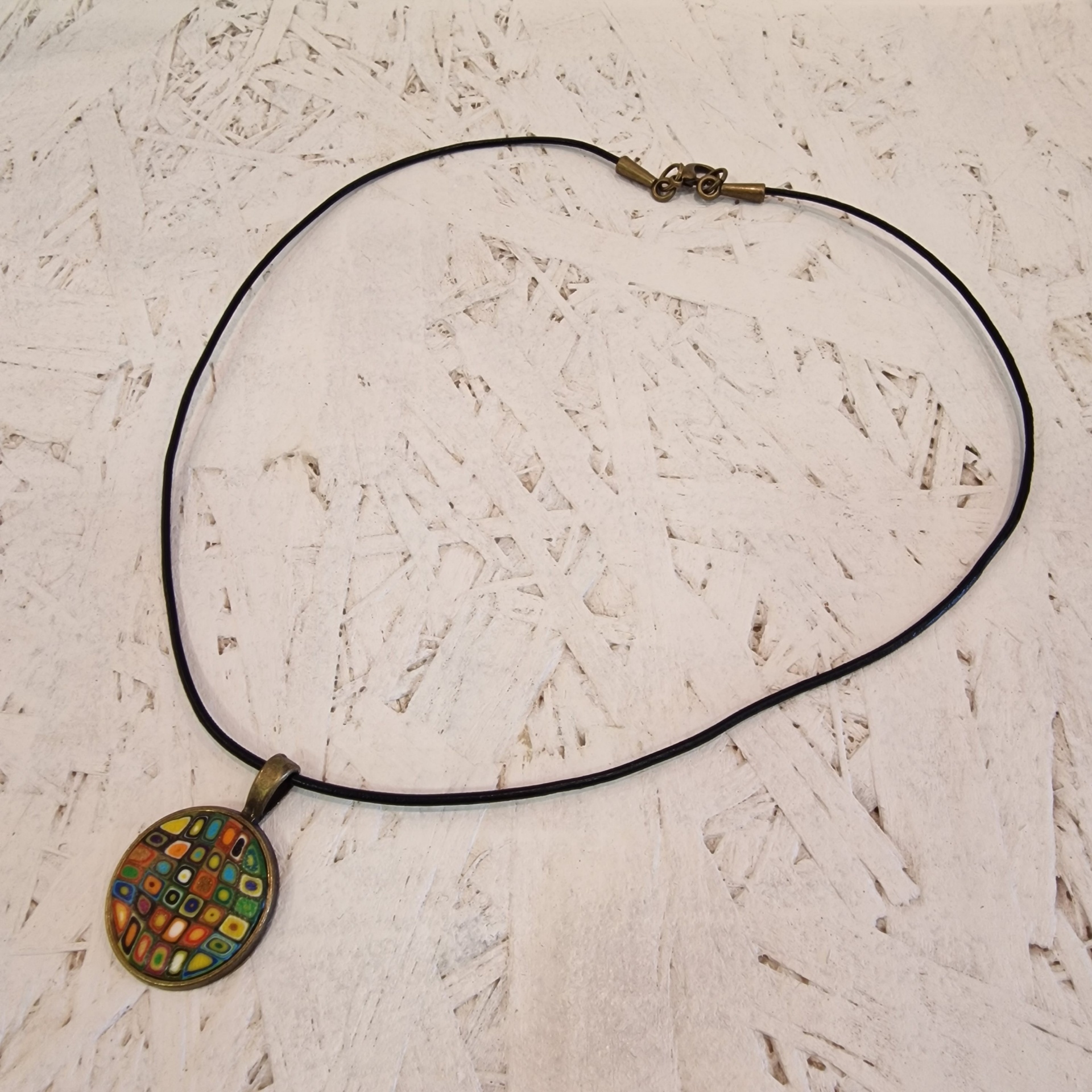 Colar Klimt Amarelo 15,00 € Desconto de %. IVA incluído. Partilhar Comprar Contactar Características Cores da argila: multicor com predominância do amarelo Metal: Latão Fio: Couro preto Medalha circular: 2cm de diâmetro Antialérgico Peso: 10gr aproximadamente As cores dos produtos poderão sofrer ligeiras alterações devido à reprodução fotográfica. Tags colarpeça de autorlatãocouro Características