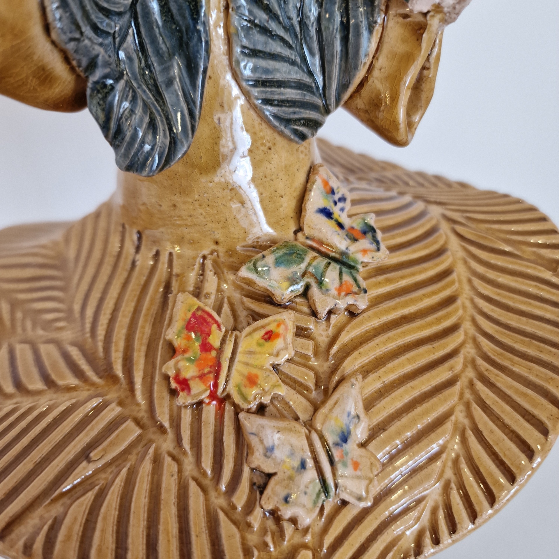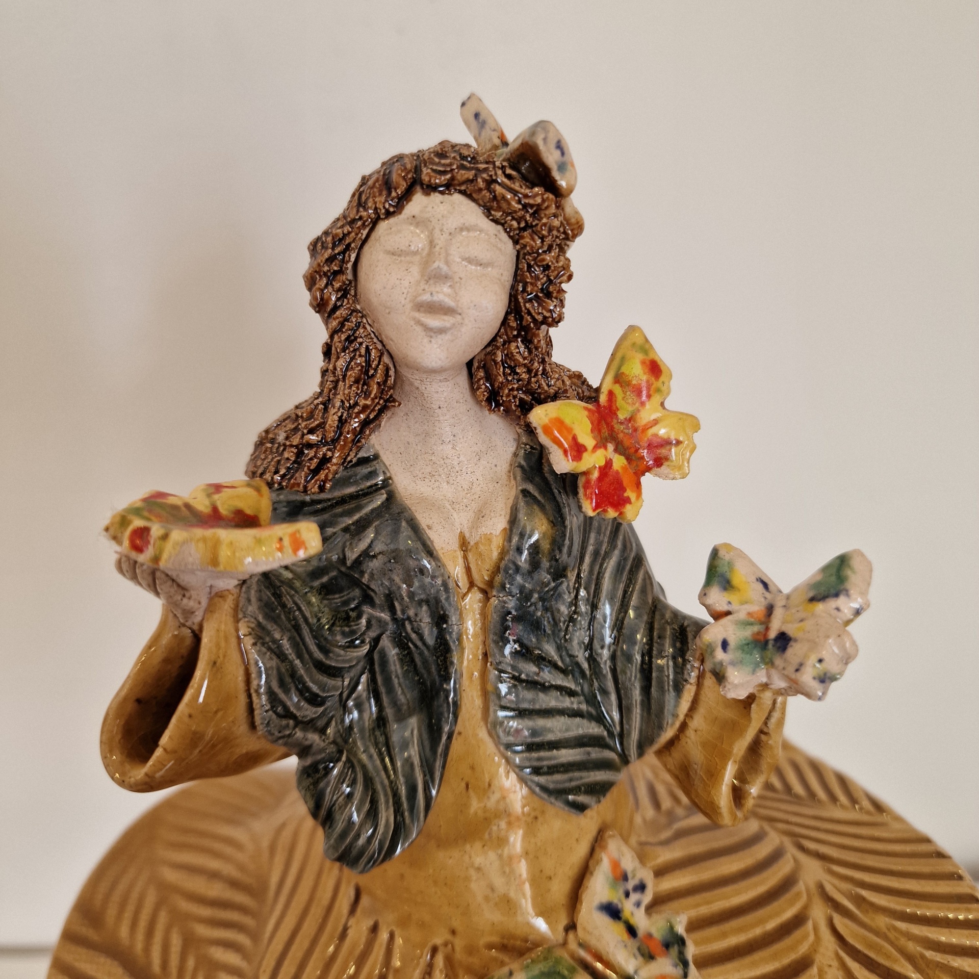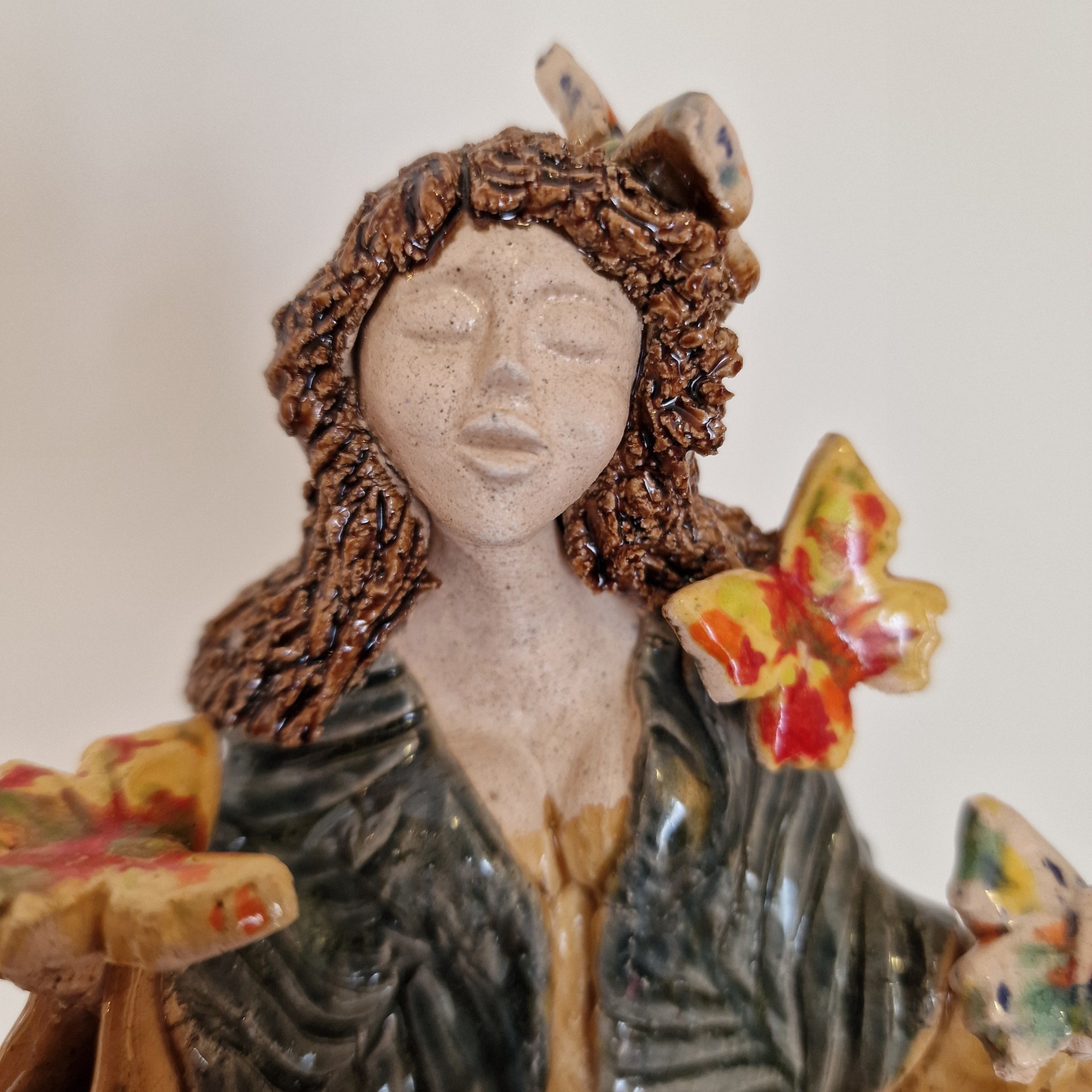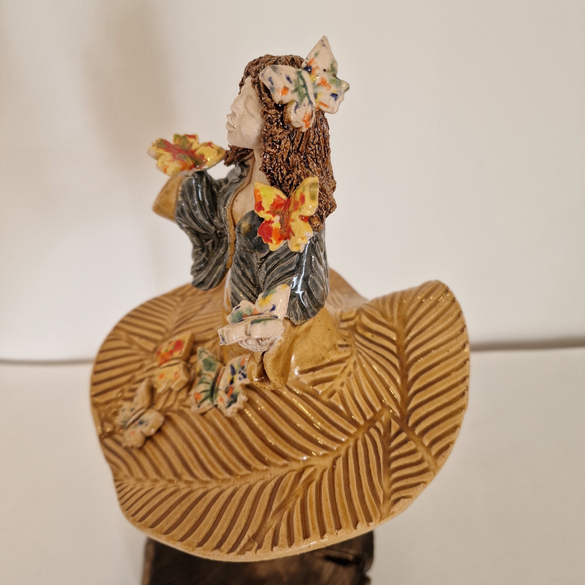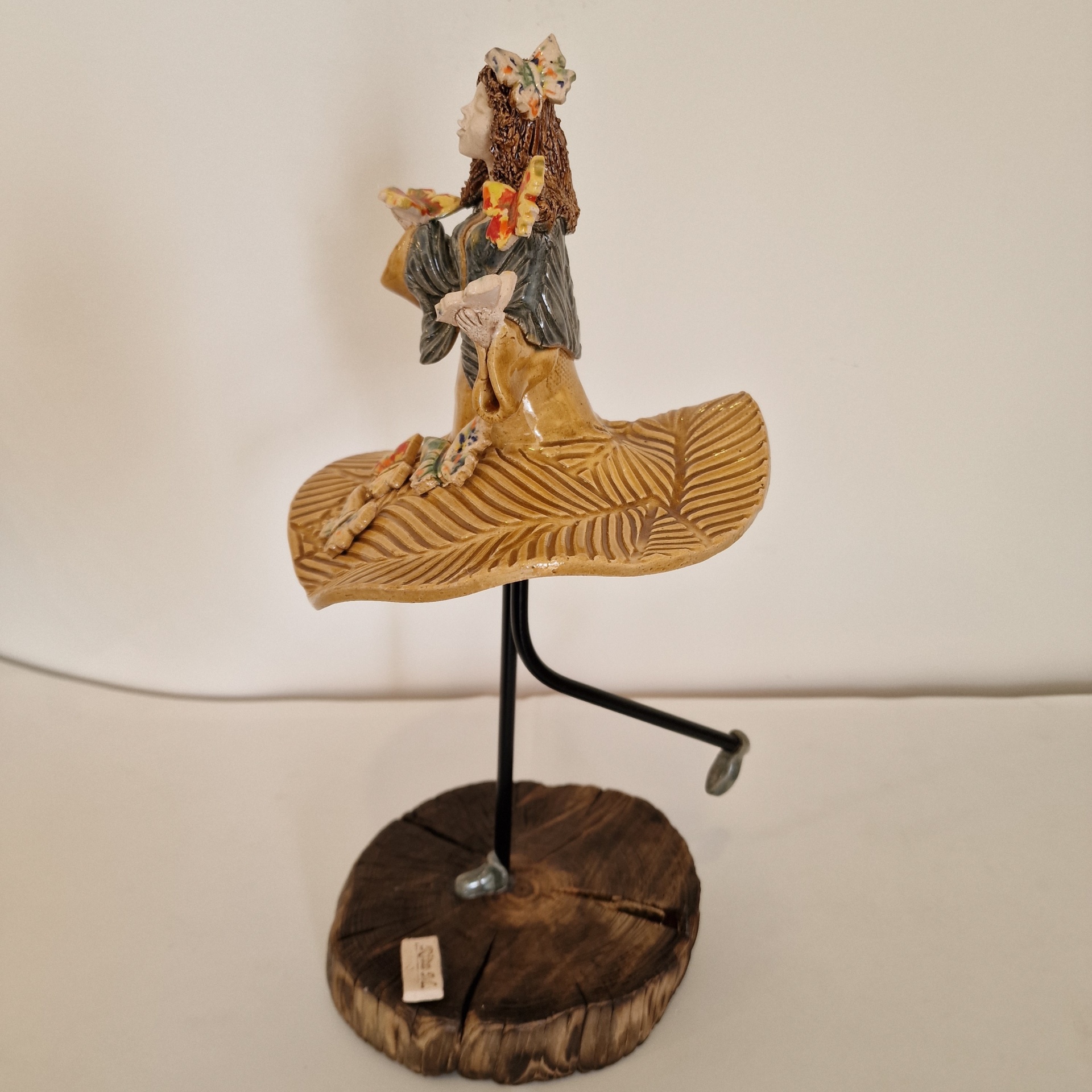 Bailarina - Borboletas 87,50 € Desconto de %. IVA incluído. Partilhar Comprar Contactar Escultura de cerâmica que representa uma bailarina rodeada de borboletas. Base de Madeira com 15cm de diâmetro, aproximadamente. Altura da peça: 38cm aproximadamente As cores dos produtos poderão sofrer ligeiras alterações devido à reprodução fotográfica. Tags esculturamulherbailarinadecoraçãoartesanalcerâmicavidradopeça de autor Características