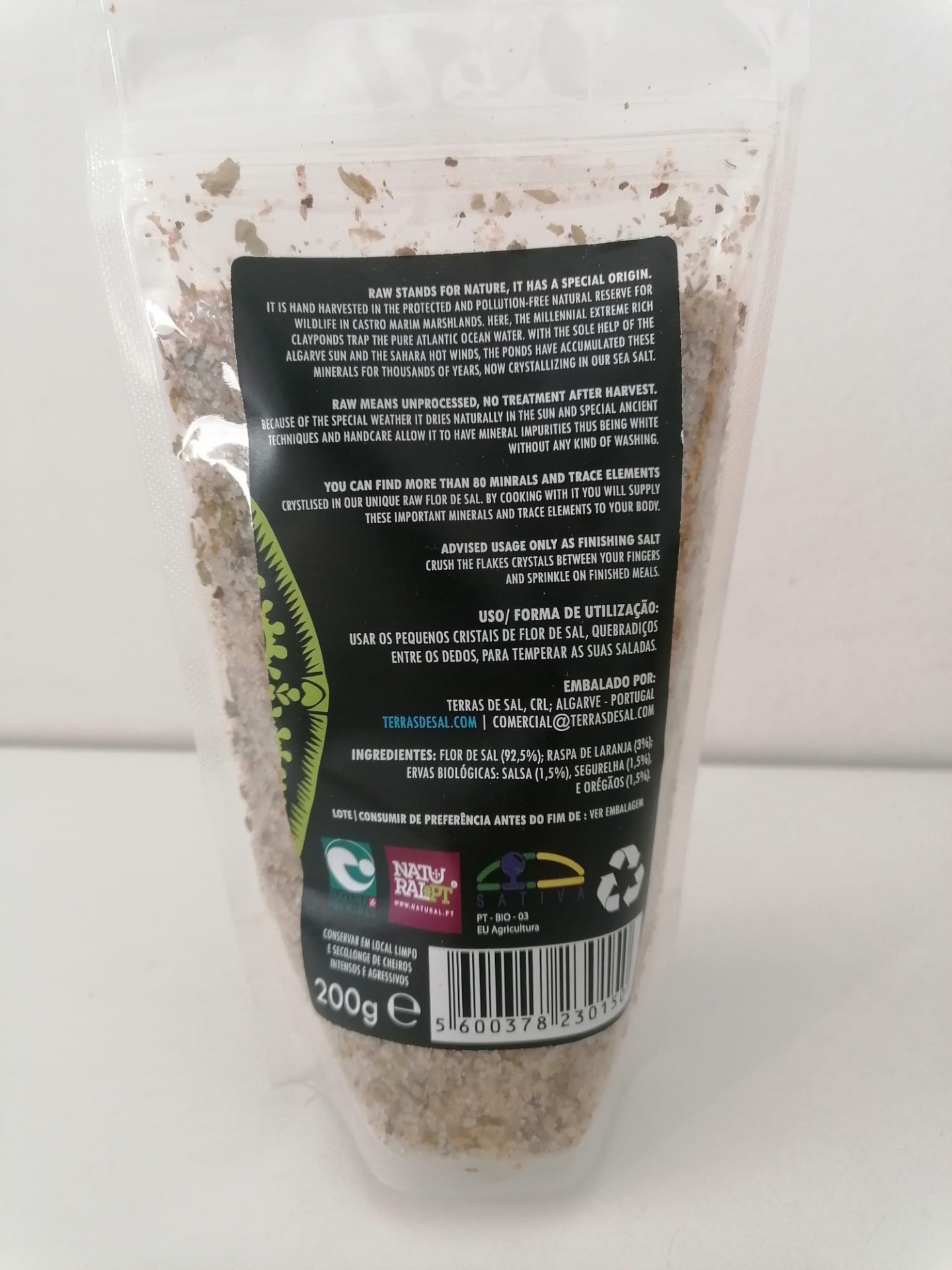 Ingredientes: Flor de Sal (92,5%); Raspa de laranja (3%). Ervas Biológicas: Salsa (1,5%); Segurelha (1,5%) e Oregãos (1,5%).