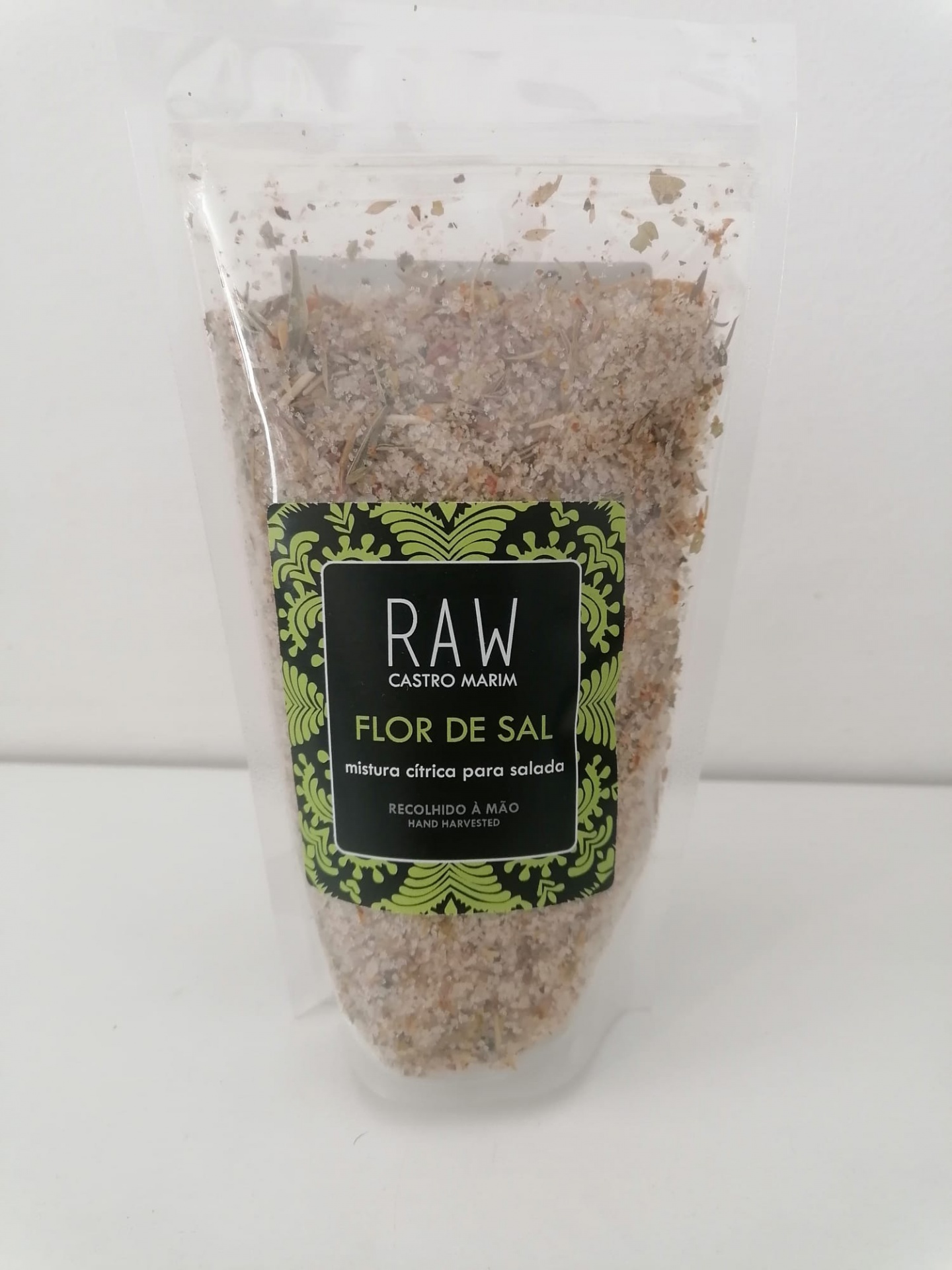 • Embalagem transparente com Flor de Sal mistura cítrica para salada com etiqueta preta e verde.
