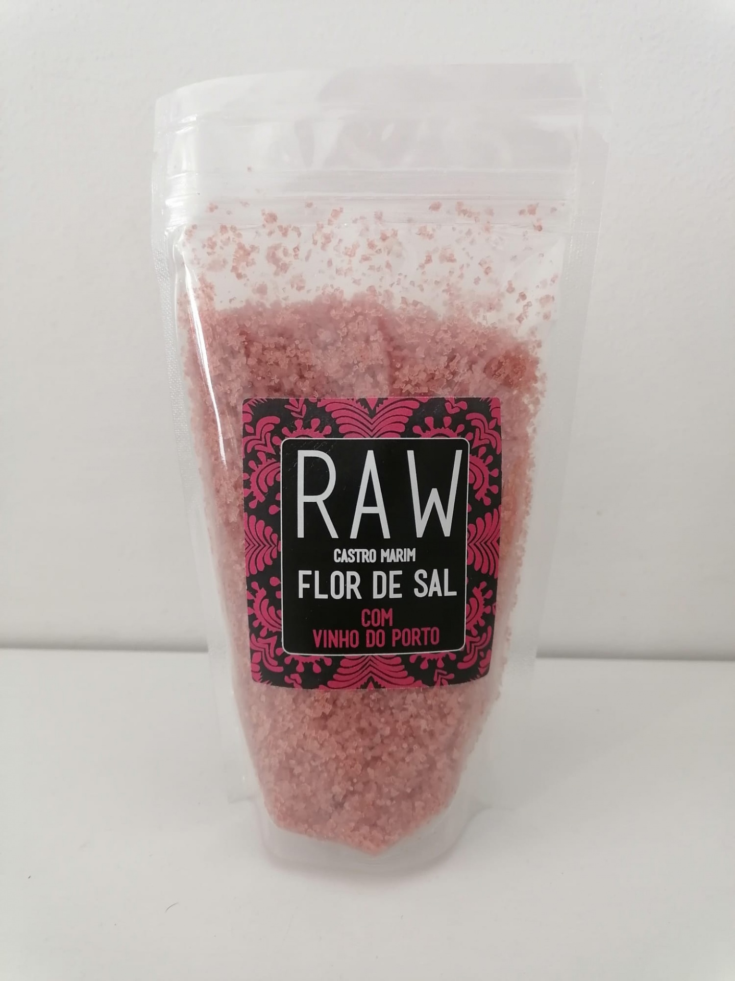• Pacote transparente com sal rosa grosso e etiqueta preta e rosa com texto RAW FLOR DE SAL