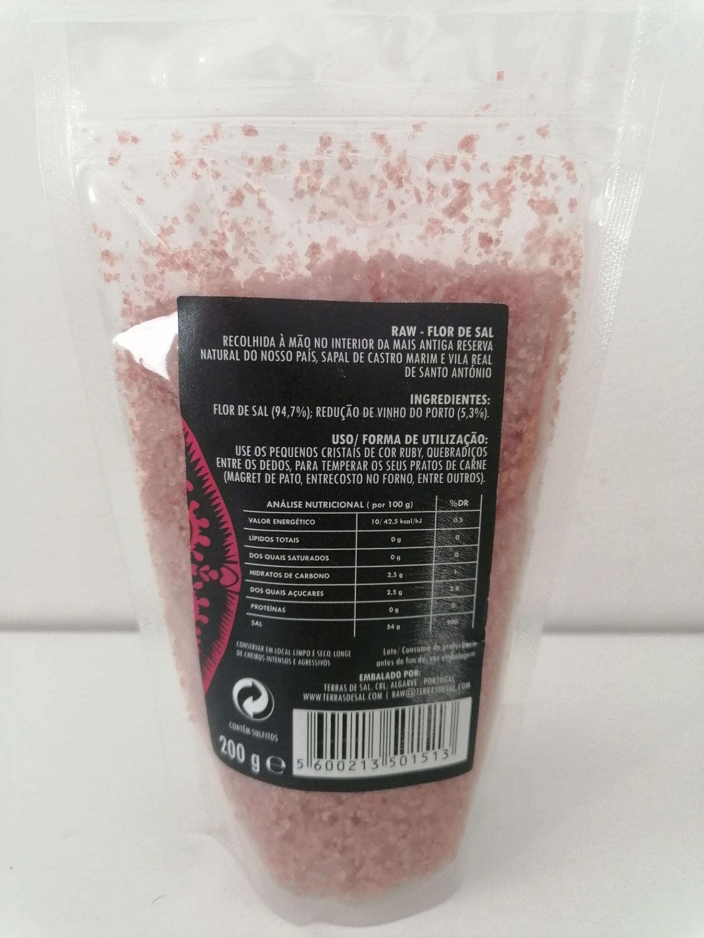 Ingredientes: Flor de Sal (94,7%); Redução de vinho do porto (5,3%).